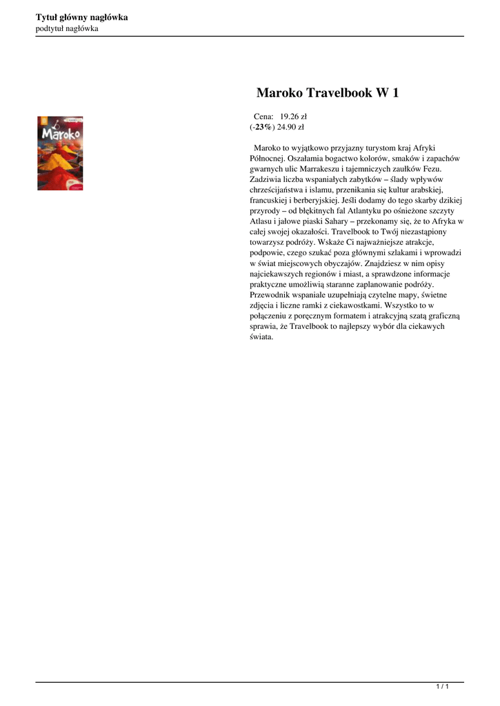 Tytuł główny nagłówka podtytuł nagłówka Maroko Travelbook W 1 Cena: 19.26 zł (-23%) 24.90 zł Maroko to wyjątkowo przyjazny turystom kraj Afryki Północnej. Oszałamia bogactwo kolorów, smaków i zapachów gwarnych ulic Marrakeszu i tajemniczych zaułków Fezu. Zadziwia liczba wspaniałych zabytków – ślady wpływów chrześcijaństwa i islamu, przenikania się kultur arabskiej, francuskiej i berberyjskiej. Jeśli dodamy do tego skarby dzikiej przyrody – od błękitnych fal Atlantyku po ośnieżone szczyty Atlasu i jałowe piaski Sahary – przekonamy się, że to Afryka w całej swojej okazałości. Travelbook to Twój niezastąpiony towarzysz podróży. Wskaże Ci najważniejsze atrakcje, podpowie, czego szukać poza głównymi szlakami i wprowadzi w świat miejscowych obyczajów. Znajdziesz w nim opisy najciekawszych regionów i miast, a sprawdzone informacje praktyczne umożliwią staranne zaplanowanie podróży. Przewodnik wspaniale uzupełniają czytelne mapy, świetne zdjęcia i liczne ramki z ciekawostkami. Wszystko to w połączeniu z poręcznym formatem i atrakcyjną szatą graficzną sprawia, że Travelbook to najlepszy wybór dla ciekawych świata. 1/1 Powered by TCPDF (www.tcpdf.org)