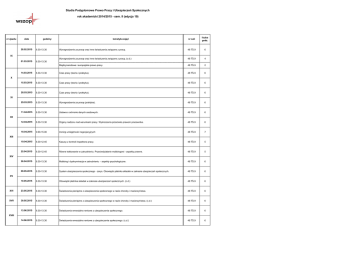 Studia Podyplomowe Prawo Pracy i Ubezpieczeń Społecznych rok akademicki 2014/2015 - sem. II (edycja 19) nr zjazdu data nr sali liczba godz. Wynagrodzenie za pracę oraz inne świadczenia związane z pracą. 48 TŚ.9 6 Wynagrodzenie za pracę oraz inne świadczenia związane z pracą. (c.d.) 48 TŚ.9 4 Międzynarodowe i europejskie prawo pracy. 48 TŚ.9 2 godziny 28.02.2015 8.30-13.30 01.03.2015 8.30-13.30 tematyka zajęć IX 14.03.2015 8.30-13.30 Czas pracy (teoria i praktyka). 48 TŚ.9 6 15.03.2015 8.30-13.30 Czas pracy (teoria i praktyka). 48 TŚ.9 6 28.03.2015 8.30-13.30 Czas pracy (teoria i praktyka). 48 TŚ.9 6 29.03.2015 8.30-13.30 Wynagrodzenia za pracę (praktyka). 48 TŚ.9 6 11.04.2015 8.30-13.30 Ustawa o ochronie danych osobowych. 48 TŚ.9 6 12.04.2015 8.30-13.30 Organy nadzoru nad warunkami pracy. Wykroczenia przeciwko prawom pracownika. 48 TŚ.9 6 18.04.2015 9.00-15.00 trening umiejętności negocjacyjnych 48 TŚ.9 7 19.04.2015 8.30-12.45 Kazusy z kontroli inspektora pracy. 48 TŚ.9 5 25.04.2015 8.30-12.45 Równe traktowanie w zatrudnieniu. Przeciwdziałanie mobbingowi - aspekty prawne. 48 TŚ.9 5 26.04.2015 8.30-13.30 Mobbing i dyskryminacja w zatrudnieniu - aspekty psychologiczne. 48 TŚ.9 6 09.05.2015 8.30-13.30 System ubezpieczenia społecznego - zarys. Obowiązki płatnika składek w zakresie ubezpieczeń społecznych. 48 TŚ.9 6 10.05.2015 8.30-13.30 Obowiązki płatnika składek w zakresie ubezpieczeń społecznych. (c.d.) 48 TŚ.9 6 XVI 23.05.2015 8.30-13.30 Świadczenia pieniężne z ubezpieczenia społecznego w razie choroby i macierzyństwa. 48 TŚ.9 6 XVII 30.05.2015 8.30-13.30 Świadczenia pieniężne z ubezpieczenia społecznego w razie choroby i macierzyństwa. (c.d.) 48 TŚ.9 6 13.06.2015 8.30-13.30 Świadczenia emerytalno rentowe z ubezpieczenia społecznego. 48 TŚ.9 6 14.06.2015 8.30-13.30 Świadczenia emerytalno rentowe z ubezpieczenia społecznego. (c.d.) 48 TŚ.9 6 X XI XII XIII XIV XV XVIII