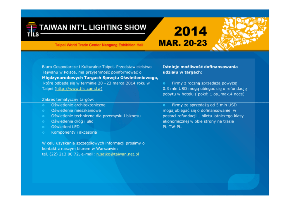 Biuro Gospodarcze i Kulturalne Taipei, Przedstawicielstwo Tajwanu w Polsce, ma przyjemność poinformować o Międzynarodowych Targach Sprzętu Oświetleniowego, które odbędą się w terminie 20 –23 marca 2014 roku w Taipei (http://www.tils.com.tw) Zakres tematyczny targów: Oświetlenie architektoniczne Oświetlenie mieszkaniowe Oświetlenie techniczne dla przemysłu i biznesu Oświetlenie dróg i ulic Oświetleni LED Komponenty i akcesoria W celu uzyskania szczegółowych informacji prosimy o kontakt z naszym biurem w Warszawie: tel. (22) 213 00 72, e-mail: [email protected] Istnieje możliwość dofinansowania udziału w targach: Firmy z roczną sprzedażą powyżej 0.3 mln USD mogą ubiegać się o refundację pobytu w hotelu ( pokój 1 os.,max.4 noce) Firmy ze sprzedażą od 5 mln USD mogą ubiegać się o dofinansowanie w postaci refundacji 1 biletu lotniczego klasy ekonomicznej w obie strony na trasie PL-TW-PL.