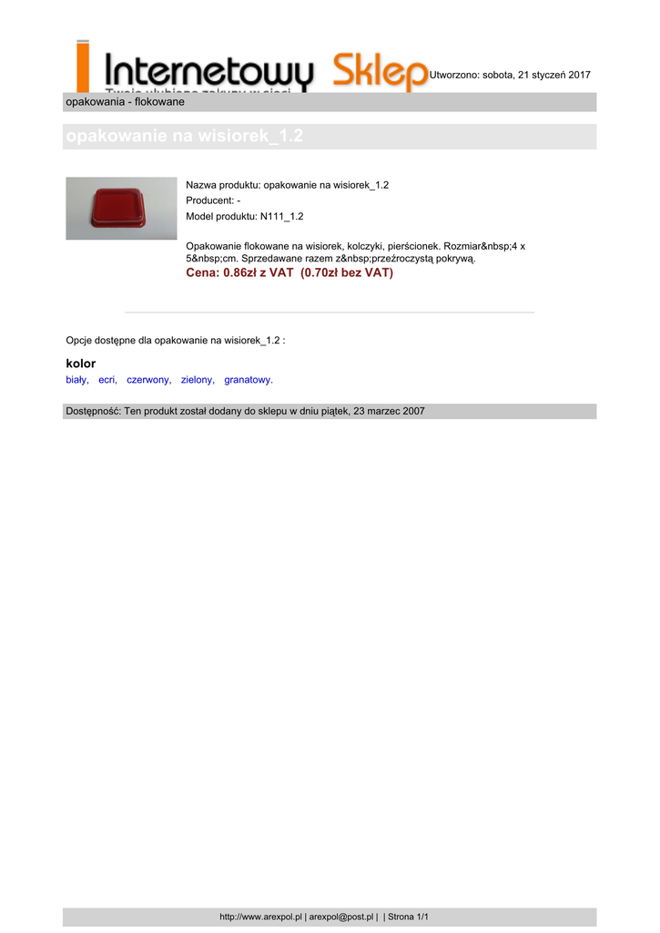 Utworzono: sobota, 21 styczeń 2017 opakowania - flokowane opakowanie na wisiorek_1.2 Nazwa produktu: opakowanie na wisiorek_1.2 Producent: Model produktu: N111_1.2 Opakowanie flokowane na wisiorek, kolczyki, pierścionek. Rozmiar 4 x 5 cm. Sprzedawane razem z przeźroczystą pokrywą. Cena: 0.86zł z VAT (0.70zł bez VAT) Opcje dostępne dla opakowanie na wisiorek_1.2 : kolor biały, ecri, czerwony, zielony, granatowy. Dostępność: Ten produkt został dodany do sklepu w dniu piątek, 23 marzec 2007 http://www.arexpol.pl | [email protected] | | Strona 1/1