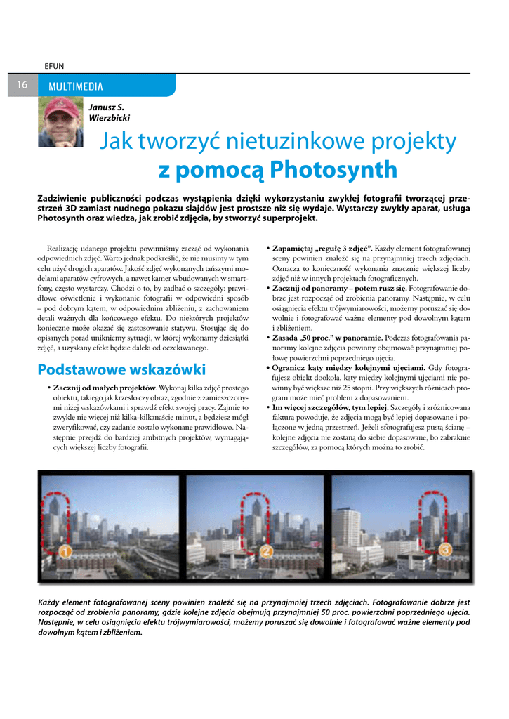 EFUN 16 multimedia Janusz S. Wierzbicki Jak tworzyć nietuzinkowe projekty z pomocą Photosynth Zadziwienie publiczności podczas wystąpienia dzięki wykorzystaniu zwykłej fotografii tworzącej przestrzeń 3D zamiast nudnego pokazu slajdów jest prostsze niż się wydaje. Wystarczy zwykły aparat, usługa Photosynth oraz wiedza, jak zrobić zdjęcia, by stworzyć superprojekt. Realizację udanego projektu powinniśmy zacząć od wykonania odpowiednich zdjęć. Warto jednak podkreślić, że nie musimy w tym celu użyć drogich aparatów. Jakość zdjęć wykonanych tańszymi modelami aparatów cyfrowych, a nawet kamer wbudowanych w smartfony, często wystarczy. Chodzi o to, by zadbać o szczegóły: prawidłowe oświetlenie i wykonanie fotografii w odpowiedni sposób – pod dobrym kątem, w odpowiednim zbliżeniu, z zachowaniem detali ważnych dla końcowego efektu. Do niektórych projektów konieczne może okazać się zastosowanie statywu. Stosując się do opisanych porad unikniemy sytuacji, w której wykonamy dziesiątki zdjęć, a uzyskany efekt będzie daleki od oczekiwanego. Podstawowe wskazówki • Zacznij od małych projektów. Wykonaj kilka zdjęć prostego obiektu, takiego jak krzesło czy obraz, zgodnie z zamieszczonymi niżej wskazówkami i sprawdź efekt swojej pracy. Zajmie to zwykle nie więcej niż kilka-kilkanaście minut, a będziesz mógł zweryfikować, czy zadanie zostało wykonane prawidłowo. Następnie przejdź do bardziej ambitnych projektów, wymagających większej liczby fotografii. • Zapamiętaj „regułę 3 zdjęć”. Każdy element fotografowanej sceny powinien znaleźć się na przynajmniej trzech zdjęciach. Oznacza to konieczność wykonania znacznie większej liczby zdjęć niż w innych projektach fotograficznych. • Zacznij od panoramy – potem rusz się. Fotografowanie dobrze jest rozpocząć od zrobienia panoramy. Następnie, w celu osiągnięcia efektu trójwymiarowości, możemy poruszać się dowolnie i fotografować ważne elementy pod dowolnym kątem i zbliżeniem. • Zasada „50 proc.” w panoramie. Podczas fotografowania panoramy kolejne zdjęcia powinny obejmować przynajmniej połowę powierzchni poprzedniego ujęcia. Ogranicz kąty między kolejnymi ujęciami. Gdy fotografujesz obiekt dookoła, kąty między kolejnymi ujęciami nie powinny być większe niż 25 stopni. Przy większych różnicach program może mieć problem z dopasowaniem. • Im więcej szczegółów, tym lepiej. Szczegóły i zróżnicowana faktura powoduje, że zdjęcia mogą być lepiej dopasowane i połączone w jedną przestrzeń. Jeżeli sfotografujesz pustą ścianę – kolejne zdjęcia nie zostaną do siebie dopasowane, bo zabraknie szczegółów, za pomocą których można to zrobić. Każdy element fotografowanej sceny powinien znaleźć się na przynajmniej trzech zdjęciach. Fotografowanie dobrze jest rozpocząć od zrobienia panoramy, gdzie kolejne zdjęcia obejmują przynajmniej 50 proc. powierzchni poprzedniego ujęcia. Następnie, w celu osiągnięcia efektu trójwymiarowości, możemy poruszać się dowolnie i fotografować ważne elementy pod dowolnym kątem i zbliżeniem. WRZESIEŃ/PAŹDZIERNIK 2012 17 • Nie przycinaj fotografii. To może zmylić program i wprowadzić błędy w łączeniu zdjęć. • Wykonuj dużo szerokich ujęć pokrywających cały obiekt. Oczywiście dobrze jest mieć dodatkowe zdjęcia z ważnymi szczegółami, ale najważniejsze jest pokrycie całego fotografowanego obiektu, co pozwoli na prawidłową rekonstrukcję sceny. • Orientacja. Sprawdź, czy wszystkie zdjęcia, które chcesz wykorzystać w projekcie, są prawidłowo ustawione pod względem orientacji. • Robiąc zdjęcia, pamiętaj o wykonaniu ujęć, które będziesz chciał wyróżnić. Na przykład zawierających ciekawe detale. Jeśli masz więcej czasu i chcesz stać się mistrzem, sprawdź zdjęcia, które zostały wykorzystane do stworzenia ciekawych projektów dostępnych na photosynth.net. Aby zobaczyć wszystkie zdjęcia naraz, przełącz się do widoku siatki. powierzchni. W zależności od tego, jak szerokie ujęcia obejmuje twój obiektyw, będziesz potrzebował od około 15 do 20 zdjęć. 2. Następnie ustaw się z aparatem w każdym z narożników. Ponownie wykonaj zdjęcia obejmujące całe pomieszczenie pamiętając, by kolejne ujęcia pokrywały się w co najmniej 50 proc. 3. Dla lepszego efektu ustaw się także na środku każdej ze ścian i sfotografuj całe pomieszczenie. 4. Teraz możesz zrobić zdjęcia najciekawszych elementów i obiektów w pomieszczeniu. Ściana z obrazami W przypadku fotografowania np. szkolnej wystawy prac wykonaj po kilka dodatkowych zdjęć każdego obrazu tak, by umożliwić płynniejsze zbliżanie i oddalanie do poszczególnych z nich w usłudze photosynth. Zbliżając się do obiektu pamiętaj, by wykonać kolejne przybliżenie. Nigdy nie pokonuj większego dystansu niż połowa odległości dzielącej cię od niego podczas wykonywania poprzedniego ujęcia. To samo dotyczy korzystania z możliwości fotografowania z zoomem. Obiekty 3D, czyli jak fotografować dookoła (np. rzeźbę, fontannę lub wazę) Oglądając ciekawe projekty na photosynth.net możemy zawsze podejrzeć, z pomocą jakich zdjęć uzyskano dany efekt dzięki możliwości przełączenia się do widoku siatki Fotografowanie wnętrz – dodatkowe wskazówki 1. Zacznij od ustawienia się z aparatem w centrum pomieszczenia. Możesz także wykorzystać statyw. Wykonaj zdjęcia dookoła starając się, by kolejne ujęcia pokrywały się w co najmniej 50 proc. W celu uzyskania najlepszego efektu powinniśmy sfotografować obiekt dookoła. Kolejne ujęcia powinny być wykonane co najwyżej co 15 stopni. Im częściej, tym lepszy efekt końcowy można uzyskać. Należy upewnić się, że na każdym zdjęciu obiekt jest widoczny w całości i znajduje się w centrum ujęcia. Wskazówka Zapraszamy także do lektury artykułów omawiających ja