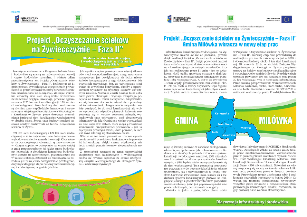 Projekt współ�nansowany przez Unię Europejską ze środków Funduszu Spójności w ramach Programu Infrastruktura i Środowisko Projekt współ�nansowany przez Unię Europejską ze środków Funduszu Spójności w ramach Programu Infrastruktura i Środowisko Dbałość o sieć kanalizacyjną i wodociągową jest w interesie nas wszystkich Inwestycje realizowane z Programu Infrastruktura i Środowisko są szansą na zrównoważony rozwój i czyste środowisko naturalne. I właśnie takim przedsięwzięciem jest Projekt „Oczyszczanie ścieków na Żywiecczyźnie – Faza II”. Realizuje go aż 11 gmin powiatu żywieckiego, a w jego ramach prowadzone są prace dotyczące budowy nowej infrastruktury kanalizacyjno-wodociągowej. Zliczając wszystkie kilometry sieci jakie mają zostać wybudowane na terenie objętym inwestycją, powstaje ogromna suma 1177 km sieci kanalizacyjnej i 178 km sieci wodociągowej. Poza budową sieci realizowane są również, przy współudziale finansowym i wykonawczym Miejskiego Przedsiębiorstwa Wodociągów i Kanalizacji w Żywcu, prace dotyczące uszczelnienia istniejącej sieci kanalizacyjno-wodociągowej w obrębie miasta Żywca oraz budowy instalacji suszenia osadów ściekowych na terenie oczyszczalni ścieków w Żywcu. 10 d drena owych esz c z o w yc h Kamesznica Szare-Suche Milówka Laliki Nieledwia żając tę kwestię zarówno w aspekcie ekologicznym, zdrowotnym, społecznym jak i ekonomicznym. Budowa, a w niektórych gminach rozbudowa systemu kanalizacji i wodociągów umożliwi, 95% mieszkańców korzystanie ze zbiorczych systemów kanalizacyjnych, a 55% będzie miało szansę podłączenia się do sieci wodociągowej. To z pewnością bezpośrednio przyczyni się do poprawy jakości życia lokalnej społeczności, jak i odwiedzających te tereny turystów. Co więcej zwiększenie ilości, jakości jak i wydajności systemu kanalizacyjnego pozwoli na osiągnięcie jednego z podstawowych celów gospodarki wodno-ściekowej, jakim jest poprawa czystości wód powierzchniowych, podziemnych oraz gleby. Milówka to jedna z gmin, która bierze udział downictwa Inżynieryjnego MACHNIK z Mochnaczki Wyżnej. Od listopada 2012 r. na terenie gminy trwają prace montażowo-budowlane. Zaawansowanie prac w poszczególnych sołectwach wynosi: Nieledwia - 7 km wodociągu i kanalizacji, Milówka - 3 km kanalizacji, Kamesznica - 10 km wodociągu i kanalizacji, Szare - 500 mb kanalizacji. Natomiast na wiosnę rozpoczną się roboty na terenie sołectwa Laliki oraz będą prowadzone prace w drogach powiatowych. Przewidziany termin ukończenia robót i podłączenia wszystkich budynków to koniec 2014 r. Co więcej, jak informuje przedstawiciel Wykonawcy, wszystkie prace związane z przywróceniem stanu pierwotnego zniszczonych działek, rozpoczną się gdy pozwolą na to warunki atmosferyczne. wó ch ny h z rozpuszczalnyc stancji toksyc n ie id w Projekcie „Oczyszczanie ścieków na Żywiecczyźnie – Faza II”. Pierwszy etap prac przewidziany do realizacji na tym terenie zakończył się już w 2009 r. i obejmował budowę około 5 km sieci kanalizacyjnej. 18. września 2012r. w siedzibie Związku Międzygminnego ds. Ekologii w Żywcu podpisano umowę na kolejny etap budowy sieci kanalizacyjnej i wodociągowej w gminie Milówka. Przedsięwzięcie obejmuje powstanie 103 km kanalizacji oraz prawie 39 km wodociągu wraz z niezbędną infrastrukturą. Prace zostaną przeprowadzone w miejscowościach: Milówka, Nieledwia, Suche, Szare-Suche, Kamesznica oraz Laliki. Kontrakt o wartości 59 337 847,50 zł netto jest realizowany przez Przedsiębiorstwo Bu- su b w p y nn yc h p adó od p adó w s t a yc h h o w yc h od y b uc o d z ie su b iw ww stancji palnyc h 921 km sieci kanalizacyjnej i 124 km sieci wodociągowej – są to najnowsze dane dotyczące nowowybudowanej sieci w ramach inwestycji. Choć roboty na poszczególnych obszarach są zaawansowane w różnym stopniu, to praktycznie na terenie każdej z gmin przeprowadzono już jakieś prace budowlane. Jedenaście z dwudziestu kontraktów budowlanych zostało już zakończonych, pozostała część jest w trakcie realizacji, natomiast do rozstrzygnięcia pozostało już tylko jedno postępowanie przetargowe, dotyczące drugiego etapu budowy sieci kanalizacyjnej i wodociągowej w gminie Jeleśnia. Jak wynika z opisu powstaje coraz więcej kilometrów sieci wodno-kanalizacyjnej, czego naturalnym następstwem jest powiększająca się liczba mieszkańców korzystających z tego dobrodziejstwa. Dla wszystkich oczywistym jest, że użytkowanie sieci wiąże się z wieloma korzyściami, choćby z ograniczeniem wydatków na utylizację ścieków we własnym zakresie. Niemniej jednak pociąga to za sobą także pewne obowiązki i wymaga rozsądnego podejścia do tematu zrzutu nieczystości. Nieprawidłowe użytkowanie sieci może wiązać się z poważnymi konsekwencjami, dlatego przede wszystkim należy pamiętać, że do sieci kanalizacyjnej nie wolno wprowadzać: odpadów płynnych, które nie rozpuszczają się w wodzie, substancji palnych, wybuchowych oraz toksycznych, wód deszczowych i drenażowych, jak również nie wolno wprowadzać do sieci odpadów stałych, które mogą powodować zmniejszenie przepustowości przewodów – jest to najczęstsza przyczyna awarii, które pomimo, że sieć jest nowa zdarzają się stosunkowo często. Wiedza na ten temat pozwoli na znaczne ograniczenie awarii i prawidłowe funkcjonowanie powstałej infrastruktury, dzięki czemu użytkownicy nie będą musieli ponosić kosztów niepotrzebnych napraw. Z pozostałymi zasadami na temat odpowiedniej eksploatacji sieci kanalizacyjnej i wodociągowej można się również zapoznać na stronie internetowej Związku Międzygminnego ds. Ekologii w Żywcu – www.zmge.zywiec.pl. Infrastruktura kanalizacyjno-wodociągowa na Żywiecczyźnie zmienia się nie do poznania, głównie dzięki realizacji Projektu „Oczyszczanie ścieków na 