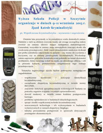 Wyższa Szkoła Policji w Szczytnie organizuje w dniach 9–11 września 2013 r. Zjazd Katedr Kryminalistyki pt. Współczesna kryminalistyka – wyzwania i zagrożenia Ostatnie lata przyniosły w kryminalistyce wiele doniosłych zmian. Niektóre z nich są efektem rozwoju nauki, ale uwagę szczególną należy zwrócić na zmiany ideowe mające następstwa metodologiczne. Generalnie, wszystkie te zmiany mają niewątpliwie znaczące skutki dla zwalczania przestępczości. Dość często przedmiotem naukowej dyskusji jest próba udzielenia odpowiedzi na pytanie – czy mamy do czynienia z kryzysem, czy ze zmianą paradygmatu kryminalistyki. Wychodząc zatem naprzeciw potrzebie konstruktywnej polemiki na temat złożoności problemów, które narastają wokół tej nauki, jej aktualnego oblicza i roli w procesie karnym, postanowiono zorganizować tego rodzaju przedsięwzięcie. Tematyka tegorocznego zjazdu będzie poświęcona następującym zagadnieniom:  współczesne możliwości i koncepcje identyfikacji kryminalistycznej;  zarządzanie ekspertyzą kryminalistyczną w świetle normy ISO 17025;  znaczenie instytucji specjalistycznych wykonujących badania na potrzeby organów ścigania i wymiaru sprawiedliwości;  dowód naukowy w świetle zmian kodeksu postępowania karnego;  problemy opiniodawcze w badaniach toksykologicznych;  sprzęt i środki współczesnej techniki kryminalistycznej;  nowoczesnych technologie i ich wykorzystanie w badaniach wykonywanych w ramach ekspertyzy biegłego;  taktyka prowadzenia postępowań w sprawach dotyczących przestępstw ekonomicznych. Zaproszenia do udziału w niniejszym spotkaniu skierowane są do pracowników naukowych uczelni wyższych zajmujących się wspomnianą problematyką, do ekspertów z instytucji naukowych i specjalistycznych wykonujących badania kryminalistyczne na potrzeby procesu karnego, do przedstawicieli organów ścigania i wymiaru sprawiedliwości, a ponadto do producentów, dystrybutorów, firm oferujących sprzęt i środki techniki kryminalistycznej oraz specjalistyczne instrumentarium i systemy informatyczne znajdujące zastosowanie w kryminalistycznych badaniach identyfikacyjnych. *** Formularz zgłoszeniowy należy przesłać do dnia 10 lipca 2013 r. mailem na adres: [email protected] lub faxem na nr 89 621 5192. Opłatę konferencyjną należy wpłacić na rachunek bankowy Wyższej Szkoły Policji w Szczytnie w BGŻ S.A. nr 98 2030 0045 1110 0000 0252 3930 do dnia 15 lipca 2013 r. (W tytule przelewu prosimy wpisać nazwę spotkania i nazwisko uczestnika. Prosimy o dostarczenie faxem nr 89 621 5192 bądź mailem kopii potwierdzenia przelewu). Abstrakty wystąpień prosimy przesłać mailem na adres: [email protected] do dnia 31 lipca br.
