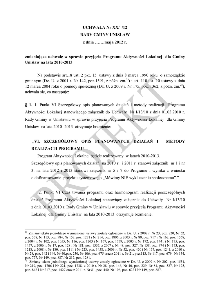 UCHWAŁA Nr XX/ /12 RADY GMINY UNISŁAW z dnia …….maja 2012 r. zmieniająca uchwałę w sprawie przyjęcia Programu Aktywności Lokalnej dla Gminy Unisław na lata 2010-2013 Na podstawie art.18 ust. 2 pkt. 15 ustawy z dnia 8 marca 1990 roku o samorządzie gminnym (Dz. U. z 2001 r. Nr 142, poz.1591, z późn. zm.1)) i art. 110 ust. 10 ustawy z dnia 12 marca 2004 roku o pomocy społecznej (Dz. U. z 2009 r. Nr 175, poz. 1362, z późn. zm.2)), uchwala się, co następuje: § 1. 1. Punkt VI Szczegółowy opis planowanych działań i metody realizacji Programu Aktywności Lokalnej stanowiącego załącznik do Uchwały Nr I/13/10 z dnia 01.03.2010 r. Rady Gminy w Unisławiu w sprawie przyjęcia Programu Aktywności Lokalnej dla Gminy Unisław na lata 2010- 2013 otrzymuje brzmienie: „VI. SZCZEGÓŁOWY OPIS PLANOWANYCH DZIAŁAŃ I METODY REALIZACJI PROGRAMU Program Aktywności Lokalnej będzie realizowany w latach 2010-2013. Szczegółowy opis planowanych działań na 2010 r. i 2011 r. stanowi załącznik nr 1 i nr 3, na lata 2012 i 2013 stanowi załącznik nr 5 i 7 do Programu i wynika z wniosku o dofinansowanie projektu systemowego „Mówimy NIE wykluczeniu społecznemu”.” 2. Punkt VI Czas trwania programu oraz harmonogram realizacji poszczególnych działań Programu Aktywności Lokalnej stanowiący załącznik do Uchwały Nr I/13/10 z dnia 01.03.2010 r. Rady Gminy w Unisławiu w sprawie przyjęcia Programu Aktywności Lokalnej dla Gminy Unisław na lata 2010-2013 otrzymuje brzmienie: 1) Zmiany tekstu jednolitego wymienionej ustawy zostały ogłoszone w Dz. U. z 2002 r. Nr 23, poz. 220, Nr 62, poz. 558, Nr 113, poz. 984, Nr 153, poz. 1271 i Nr 214, poz. 1806, z 2003 r. Nr 80, poz. 717 i Nr 162, poz. 1568, z 2004 r. Nr 102, poz. 1055, Nr 116, poz. 1203 i Nr 167, poz. 1759, z 2005 r. Nr 172, poz. 1441 i Nr 175, poz. 1457, z 2006 r. Nr 17, poz. 128 i Nr 181, poz. 1337, z 2007 r. Nr 48, poz. 327, Nr 138, poz. 974 i Nr 173, poz. 1218, z 2008 r. Nr 180, poz. 1111 i Nr 223, poz. 1458, z 2009 r. Nr 52, poz. 420 i Nr 157, poz. 1241, z 2010 r. Nr 28, poz. 142 i 146, Nr 40,poz. 230, Nr 106, poz. 675 oraz z 2011 r. Nr 21, poz.113, Nr 117, poz. 679, Nr 134, poz. 777, Nr 149, poz. 887, Nr 217, poz. 1281. 2) Zmiany tekstu jednolitego wymienionej ustawy zostały ogłoszone w Dz. U. z 2009 r. Nr 202, poz. 1551, Nr 219, poz. 1706 i Nr 221, poz. 1738, z 2010 r. Nr 28, poz. 146, Nr 40, poz. 229, Nr 81, poz. 527, Nr 125, poz. 842 i Nr 217, poz. 1427 oraz z 2011 r. Nr 81, poz. 440, Nr 106, poz. 622 i Nr 149, poz. 887. „VII. CZAS TRWANIA PROGRAMU ORAZ HARMONOGRAM REALIZACJI POSZCZEGÓLNYCH DZIAŁAŃ Program Aktywności Lokalnej będzie realizowany w latach 2010-2013. Harmonogram realizacji poszczególnych działań w 2010 r. i 2011 r. roku stanowi załącznik nr 2 i nr 4, na lata 2012 i 2013 stanowi załącznik nr 6 i 8 do niniejszego dokumentu i jest zgodny z harmonogramem projektu systemowego „Mówimy NIE wykluczeniu społecznemu”.” § 2. Załączniki nr 5, 6, 7, 8 do Programu Aktywności Lokalnej stanowią załączniki nr 1, 2, 3 i 4 do niniejszej uchwały. § 3. Wykonanie uchwały powierza się Wójtowi Gminy Unisław. § 4. Uchwała wchodzi w życie z dniem podjęcia i podlega ogłoszeniu poprzez wywieszenie na tablicy ogłoszeń w Urzędzie Gminy Unisław. Załącznik nr 1 do uchwały nr XX/ /12 Rady Gminy Unisław z dnia ............ r. Załącznik nr 5 do Programu Aktywności Lokalnej dla Gminy Unisław na lata 2010 - 2013 OPIS PLANOWANYCH DZIAŁAŃ I METODY REALIZACJI PROGRAMU W ramach Programu Aktywności Lokalnej na 2012 r. wsparciem objętych zostanie 8 osób ( wraz z otoczeniem), z którymi zawarte zostaną umowy. Zgodnie z chronologią działań przedstawioną w harmonogramie projektu planowane są następujące działania w projekcie: W ramach PAL przewiduje się zastosowanie: - instrumentów aktywnej integracji z zakresu aktywizacji edukacyjnej skierowanie i sfinansowanie zajęć szkolnych ( 1 os.) w 2012i 2013 r. Warsztaty ogrodnicze dla 8 BO. Zajęcia będą miały na celu nabycie nawyku dbania o estetykę miejsca zamieszkania, naukę sadzenia i pielęgnacji zieleni ok. 25 godz. , W ramach aktywizacji społecznej – poradnictwo pedagogiczne- 10 godz. dla 8 BO , poradnictwo psychologiczne 10 godz. dla 8 os.” ABC zarządzania budżetem domowym” – 15 godz. dla 8 BO. W ramach aktywizacji zawodowej – doradztwo zawodowe 10 godz. dla 8 BO. - działania o charakterze środowiskowym- edukacja społeczna i obywatelska , współudział w imprezach i spotkaniach w szczególności o charakterze integracyjnym, sportowym i edukacyjnym, 2 wyjazdy integracyjne mające na celu aktywne spędzanie czasu wolnego, poznawanie kultury, w tym 1 do kina oraz piknik integracyjno-rekreacyjno-sportowy dla beneficjentów projektu i ich otoczenia - środowiskowa praca socjalna ( wykonywana przez pracowników socjalnych ma na celu pomoc osobom i rodzinom w środowisku w społeczeństwie poprzez pełnienie we wzmacnianiu lub odzyskaniu zdolności funkcjonowania odpowiednich ról społecznych oraz tworzenie warunków sprzyjających temu celowi - zasiłki i pomoc w naturze - przewidujemy wsparcie finansowe dla uczestników PAL, w zależności od rozpoznanych potrzeb , zgodnie z zawartymi umowami. Wsparcie będzie realizowane w formie zasiłków jednorazowych i jednorazowych specjalnych Do prowadzenia działań w ramach Aktywnej Integracji zostanie wynajęta firma szkoleniowa, która będzie odpowiedzialna za dobór kompetentnych i doświadczonych prowadzących , przygotowanie materiałów szkoleniowych, przeprowadzenie zajęć zgodnie z przyjętym harmonogramem oraz prowadzenie stosownej dokumentacji. Przewidujemy w trakcie realizacji Programu dla beneficjentów PAL : zapewnienie wyżywienia, opłacenie ubezpieczenia, dowóz BO na zajęcia lub zwrot kosztów dojazdu, koszty związane z zapewnieniem opieki nad dziećmi lub osobami zależnymi w trakcie trwania zajęć, koszty wynajęcia autokaru, zakup bil