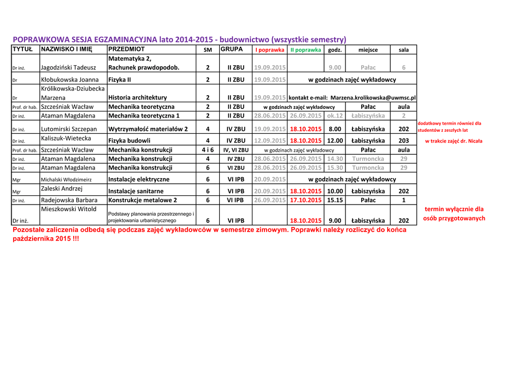 POPRAWKOWA SESJA EGZAMINACYJNA lato 2014