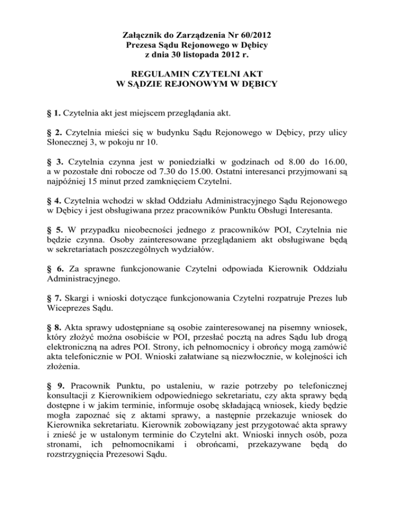 Załącznik do Zarządzenia Nr 60/2012 Prezesa Sądu Rejonowego w Dębicy z dnia 30 listopada 2012 r. REGULAMIN CZYTELNI AKT W SĄDZIE REJONOWYM W DĘBICY § 1. Czytelnia akt jest miejscem przeglądania akt. § 2. Czytelnia mieści się w budynku Sądu Rejonowego w Dębicy, przy ulicy Słonecznej 3, w pokoju nr 10. § 3. Czytelnia czynna jest w poniedziałki w godzinach od 8.00 do 16.00, a w pozostałe dni robocze od 7.30 do 15.00. Ostatni interesanci przyjmowani są najpóźniej 15 minut przed zamknięciem Czytelni. § 4. Czytelnia wchodzi w skład Oddziału Administracyjnego Sądu Rejonowego w Dębicy i jest obsługiwana przez pracowników Punktu Obsługi Interesanta. § 5. W przypadku nieobecności jednego z pracowników POI, Czytelnia nie będzie czynna. Osoby zainteresowane przeglądaniem akt obsługiwane będą w sekretariatach poszczególnych wydziałów. § 6. Za sprawne funkcjonowanie Czytelni odpowiada Kierownik Oddziału Administracyjnego. § 7. Skargi i wnioski dotyczące funkcjonowania Czytelni rozpatruje Prezes lub Wiceprezes Sądu. § 8. Akta sprawy udostępniane są osobie zainteresowanej na pisemny wniosek, który złożyć można osobiście w POI, przesłać pocztą na adres Sądu lub drogą elektroniczną na adres POI. Strony, ich pełnomocnicy i obrońcy mogą zamówić akta telefonicznie w POI. Wnioski załatwiane są niezwłocznie, w kolejności ich złożenia. § 9. Pracownik Punktu, po ustaleniu, w razie potrzeby po telefonicznej konsultacji z Kierownikiem odpowiedniego sekretariatu, czy akta sprawy będą dostępne i w jakim terminie, informuje osobę składającą wniosek, kiedy będzie mogła zapoznać się z aktami sprawy, a następnie przekazuje wniosek do Kierownika sekretariatu. Kierownik zobowiązany jest przygotować akta sprawy i znieść je w ustalonym terminie do Czytelni akt. Wnioski innych osób, poza stronami, ich pełnomocnikami i obrońcami, przekazywane będą do rozstrzygnięcia Prezesowi Sądu. § 10. Kierownicy sekretariatów zobowiązani są do ścisłego współdziałania z pracownikami POI oraz podejmowania czynności mających na celu umożliwienie rzetelnej i sprawnej obsługi interesantów przez Czytelnię. § 11. Przed skorzystaniem z Czytelni akt osoby uprawnione do wglądu do akt mają obowiązek okazania dowodu osobistego lub innego dokumentu ze zdjęciem, umożliwiającego stwierdzenie tożsamości, a także złożyć czytelny podpis w rejestrze akt udostępnianych do wglądu. Wpis ten jest jednocześnie zobowiązaniem do przestrzegania Regulaminu Czytelni. § 12. Osoby zainteresowane przeglądaniem akt w Czytelni mają prawo do zamówienia więcej niż jednych akt, ale mogą zapoznawać się jednorazowo tylko z jednymi aktami. § 13. W Czytelni można korzystać z własnych materiałów i sprzętu, np. komputerów przenośnych i aparatów cyfrowych, tylko za zgodą właściwego Przewodniczącego Wydziału lub Prezesa Sądu, gdy to on wydawał zgodę na udostępnienie akt, i pod nadzorem osoby obsługującej Czytelnię akt. § 14. Czytelnia akt nie przyjmuje wniosków o sporządzenie kserokopii dokumentów z akt sądowych. Wnioski takie składa się w POI. § 15. Za zgodą Przewodniczącego Wydziału, a w sytuacjach, gdy zgodę na udostępnienie akt wydawał Prezes Sądu, za jego zgodą, osoba przeglądająca akta może wykonać samodzielnie fotokopie dokumentów znajdujących się w aktach. Wykonywanie fotokopii odbywa się pod nadzorem pracownika obsługującego Czytelnię. § 16. Pomieszczenie Czytelni jest monitorowane. Nagrania z monitoringu przechowywane są przez okres jednego roku. § 17. Osoby, którym zostały udostępnione akta, mają obowiązek ich poszanowania. Zabronione jest niszczenie akt, ich uszkadzanie i robienie w nich adnotacji (podkreśleń, zakreśleń, notatek). Wszelkie zauważone uszkodzenia akt powinny być zgłoszone osobie obsługującej Czytelnię. Zabronione jest również wynoszenie akt poza Czytelnię. § 18. Osoby korzystające z Czytelni zobowiązane są do zachowania ciszy i niezakłócania pracy innym osobom. Na terenie Czytelni akt zakazane jest korzystanie z telefonów komórkowych oraz spożywanie posiłków i napojów. § 19. Osoby czytające akta mają obowiązek stosowania się do niniejszego Regulaminu oraz do zaleceń i uwag osoby obsługującej Czytelnię. Prezes Sądu Rejonowego w Dębicy Beata Stój