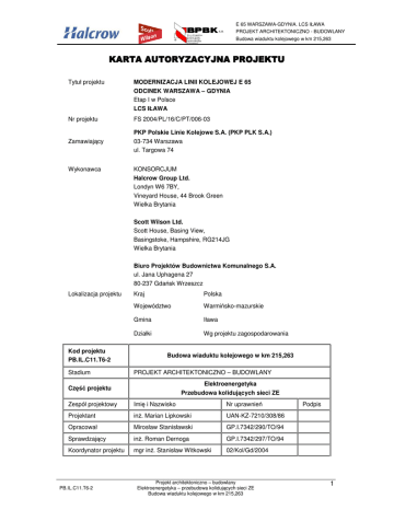 E 65 WARSZAWA-GDYNIA. LCS IŁAWA PROJEKT ARCHITEKTONICZNO - BUDOWLANY Budowa wiaduktu kolejowego w km 215,263 KARTA AUTORYZACYJNA PROJEKTU Tytuł projektu MODERNIZACJA LINII KOLEJOWEJ E 65 ODCINEK WARSZAWA – GDYNIA Etap I w Polsce LCS IŁAWA Nr projektu FS 2004/PL/16/C/PT/006-03 Zamawiający PKP Polskie Linie Kolejowe S.A. (PKP PLK S.A.) 03-734 Warszawa ul. Targowa 74 Wykonawca KONSORCJUM Halcrow Group Ltd. Londyn W6 7BY, Vineyard House, 44 Brook Green Wielka Brytania Scott Wilson Ltd. Scott House, Basing View, Basingstoke, Hampshire, RG214JG Wielka Brytania Biuro Projektów Budownictwa Komunalnego S.A. ul. Jana Uphagena 27 80-237 Gdańsk Wrzeszcz Lokalizacja projektu Kod projektu PB.IL.C11.T6-2 Stadium Kraj Polska Województwo Warmińsko-mazurskie Gmina Iława Działki Wg projektu zagospodarowania Budowa wiaduktu kolejowego w km 215,263 PROJEKT ARCHITEKTONICZNO – BUDOWLANY Elektroenergetyka Przebudowa kolidujących sieci ZE Część projektu Zespół projektowy Imię i Nazwisko Nr uprawnień Projektant inż. Marian Lipkowski UAN-KZ-7210/308/86 Opracował Mirosław Stanisławski GP.I.7342/290/TO/94 Sprawdzający inż. Roman Dernoga GP.I.7342/297/TO/94 Koordynator projektu mgr inż. Stanisław Witkowski 02/Kol/Gd/2004 PB.IL.C11.T6-2 Projekt architektoniczno – budowlany Elektroenergetyka – przebudowa kolidujących sieci ZE Budowa wiaduktu kolejowego w km 215,263 Podpis 1 E 65 WARSZAWA-GDYNIA. LCS IŁAWA PROJEKT ARCHITEKTONICZNO - BUDOWLANY Budowa wiaduktu kolejowego w km 215,263 Zawartość dokumentacji Kod projektu Nazwa projektu PB.IL.C11 Budowa wiaduktu kolejowego w km 215,263 PB.IL.C11.T1 Projekt zagospodarowania terenu PB.IL.C11.T2 Przebudowa układu drogowego PB.IL.C11.T3 Obiekty inżynieryjne PB.IL.C11.T4 Obiekty budowlane – nie występuje PB.IL.C11.T5 Sieci i obiekty sanitarne PB.IL.C11.T6 Elektroenergetyka PB.IL.C11.T6-1 Przebudowa kolidujących sieci „PKP Energetyka” S.A. – nie występuje PB.IL.C11.T6-2 Przebudowa kolidujących sieci ZE PB.IL.C11.T6-3 Zsilanie przepompowni w km 215,263 PB.IL.C11.T7 Telekomunikacja – nie występuje PB.IL.C11.T8 Inwentaryzacja zieleni, gospodarka drzewostanem i projekt zieleni PB.IL.C10.T9 Informacja o BIOZ PB.IL.C11.T6-2 Projekt architektoniczno – budowlany Elektroenergetyka – przebudowa kolidujących sieci ZE Budowa wiaduktu kolejowego w km 215,263 2 E 65 WARSZAWA-GDYNIA. LCS IŁAWA PROJEKT ARCHITEKTONICZNO - BUDOWLANY Budowa wiaduktu kolejowego w km 215,263 ZAWARTOŚĆ OPRACOWANIA I. OPIS TECHNICZNY ................................................................................... 4 1. Podstawa opracowania ....................................................................................... 4 2. Zakres opracowania............................................................................................. 4 3. Wykaz istniejących kolizji podlegających przebudowie ................................... 5 4. Uwagi końcowe .................................................................................................... 5 5. Warunki ochrony środowiska………………………………………………………….5 II. ZAŁĄCZNIKI............................................................................................. 7 III. RYSUNKI .................................................................................................. 7 1. rys. 1 – Plan sytuacyjny 1 :500 ..................................................................................... 7 PB.IL.C11.T6-2 Projekt architektoniczno – budowlany Elektroenergetyka – przebudowa kolidujących sieci ZE Budowa wiaduktu kolejowego w km 215,263 3 E 65 WARSZAWA-GDYNIA. LCS IŁAWA PROJEKT ARCHITEKTONICZNO - BUDOWLANY Budowa wiaduktu kolejowego w km 215,263 I. OPIS TECHNICZNY 1. Podstawa opracowania Podstawę opracowania stanowią: - mapa sytuacyjno – wysokościowa dla celów projektowych, - Koncepcja Programowo – Przestrzenna dla LCS Iława, - robocze uzgodnienia branżowe i projekty pozostałych branż, - inwentaryzacja istniejących urządzeń, - istniejąca dokumentacja techniczna, - Decyzja o ustaleniu lokalizacji inwestycji nr W-M/5/05 z dnia 20.05.2005r wydana przez Wojewodę Warmińsko-Mazurskiego, - Decyzja o ustaleniu lokalizacji linii kolejowej nr 19/2010 z dnia 22.10.2010 wydana przez Wojewodę Warmińsko – Mazurskiego, - Decyzja środowiskowa Wojewody Warmińsko-Mazurskiego nr ŚR.I.661342/06/2007 z dnia 30.05.2007r., - pismo Nr IRIKM-0812-006-03-138/08 z dnia 30.09.2008r PKP PLK S.A. Oddział Regionalny w Gdańsku, - pismo Nr IRIKM-0812-006-03-140/08 z dnia 30.09.2008r PKP PLK S.A. Oddział Regionalny w Gdańsku, - pismo Nr IRIKI-071-40/08 z dnia 07.11.2008r PKP PLK S.A. Oddział Regionalny w Gdańsku, - normy obowiązkowe oraz przepisy ogólnie obowiązujące. 2. Zakres opracowania Opracowanie niniejsze obejmuje sieci elektroenergetyczne i urządzenia elektryczne odbiorcze kolidujące z budową wiaduktu kolejowego w km 215,263 oraz modernizowaną linią kolejową E65 odcinek Warszawa – Gdynia na terenie Lokalnego Centrum Sterowania w Iławie. Wiadukt PB.IL.C11.T6-2 zlokalizowany jest na odcinku Projekt architektoniczno – budowlany Elektroenergetyka – przebudowa kolidujących sieci ZE Budowa wiaduktu kolejowego w km 215,263 Iława – Redaki. 4 E 65 WARSZAWA-GDYNIA. LCS IŁAWA PROJEKT ARCHITEKTONICZNO - BUDOWLANY Budowa wiaduktu kolejowego w km 215,263 3. Wykaz istniejących kolizji podlegających przebudowie W ramach modernizacji obiektu przebudowy wymaga linia elektroenergetyczna kablowa nn w km 215,257. Linia kablowa stanowi przyłącze do likwidowanego budynku mieszkalnego , który w związku z budową wiaduktu kolejowego podlega rozbiórce. Proponuje się w obrysie budowanego wiaduktu linię kablową częściowo zdemontować i pozostałą jej część jako sieć rozdzielczą zakończyć złączem kablowym. 4. Uwagi końcowe Przebieg proponowanej trasy linii naniesiono na planie sytuacyjnym. Przedmiotowa kolizja zostanie usunięta