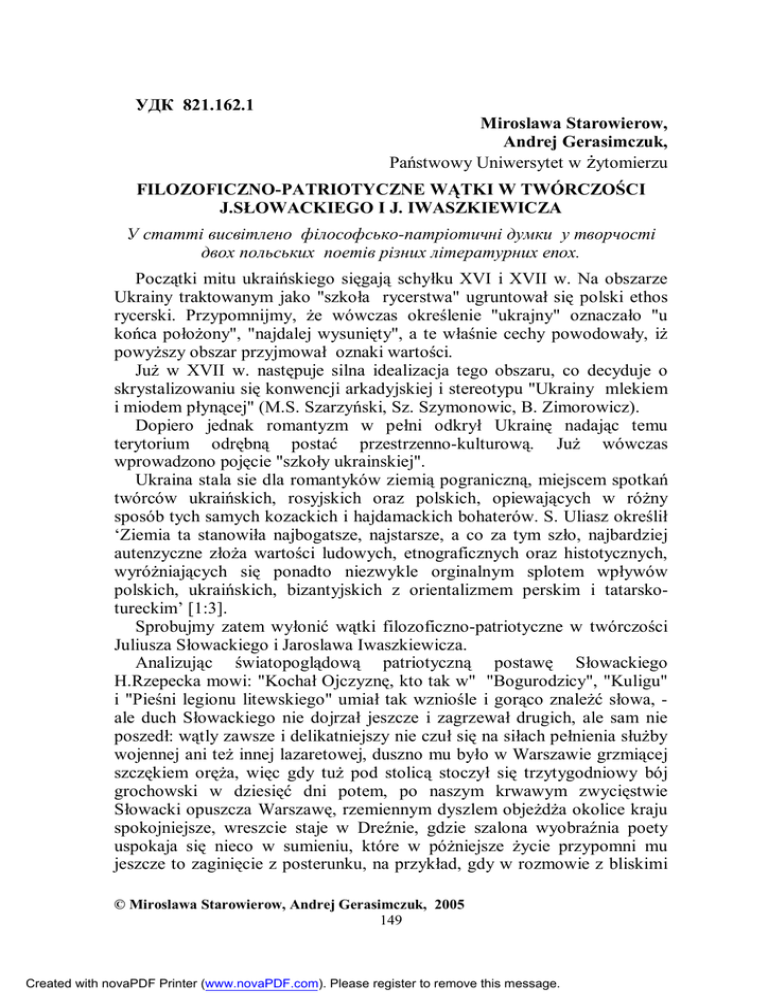 УДК 821.162.1 Miroslawa Starowierow, Andrej Gerasimczuk, Państwowy Uniwersytet w żytomierzu FILOZOFICZNO-PATRIOTYCZNE WĄTKI W TWÓRCZOŚCI J.SŁOWACKIEGO I J. IWASZKIEWICZA У статті висвітлено філософсько-патріотичні думки у творчості двох польських поетів різних літературних епох. Początki mitu ukraińskiego sięgają schyłku XVI i XVII w. Na obszarze Ukrainy traktowanym jako "szkoła rycerstwa" ugruntował się polski ethos rycerski. Przypomnijmy, że wówczas określenie "ukrajny" oznaczało "u końca położony", "najdalej wysunięty", a te właśnie cechy powodowały, iż powyższy obszar przyjmował oznaki wartości. Już w XVII w. następuje silna idealizacja tego obszaru, co decyduje o skrystalizowaniu się konwencji arkadyjskiej i stereotypu "Ukrainy mlekiem i miodem płynącej" (M.S. Szarzyński, Sz. Szymonowic, B. Zimorowicz). Dopiero jednak romantyzm w pełni odkrył Ukrainę nadając temu terytorium odrębną postać przestrzenno-kulturową. Już wówczas wprowadzono pojęcie "szkoły ukrainskiej". Ukraina stala sie dla romantyków ziemią pograniczną, miejscem spotkań twórców ukraińskich, rosyjskich oraz polskich, opiewających w różny sposób tych samych kozackich i hajdamackich bohaterów. S. Uliasz określił ‘Ziemia ta stanowiła najbogatsze, najstarsze, a co za tym szło, najbardziej autenzyczne złoża wartości ludowych, etnograficznych oraz histotycznych, wyróżniających się ponadto niezwykle orginalnym splotem wpływów polskich, ukraińskich, bizantyjskich z orientalizmem perskim i tatarskotureckim’ [1:3]. Sprobujmy zatem wyłonić wątki filozoficzno-patriotyczne w twórczości Juliusza Słowackiego i Jaroslawa Iwaszkiewicza. Analizując światopoglądową patriotyczną postawę Słowackiego H.Rzepecka mowi: "Kochał Ojczyznę, kto tak w" "Bogurodzicy", "Kuligu" i "Pieśni legionu litewskiego" umiał tak wzniośle i gorąco znależć słowa, ale duch Słowackiego nie dojrzał jeszcze i zagrzewał drugich, ale sam nie poszedł: wątly zawsze i delikatniejszy nie czuł się na siłach pełnienia służby wojennej ani też innej lazaretowej, duszno mu było w Warszawie grzmiącej szczękiem oręża, więc gdy tuż pod stolicą stoczył się trzytygodniowy bój grochowski w dziesięć dni potem, po naszym krwawym zwycięstwie Słowacki opuszcza Warszawę, rzemiennym dyszlem objeżdża okolice kraju spokojniejsze, wreszcie staje w Dreźnie, gdzie szalona wyobraźnia poety uspokaja się nieco w sumieniu, które w póżniejsze życie przypomni mu jeszcze to zaginięcie z posterunku, na przykład, gdy w rozmowie z bliskimi © Miroslawa Starowierow, Andrej Gerasimczuk, 2005 149 Created with novaPDF Printer (www.novaPDF.com). Please register to remove this message. Українська полоністика. Випуск 2. Філологічні дослідження mu ludźmi orzecze, że "godności (tytułu) nie mam, przed męką uciekłem" [2: 280]. A jednak poeta daje wyraz uczucia patriotycznego w "Hymnie": Bogurodzico! Dziewico! Słuchaj nas Matko Boża, To ojców naszych śpiew. Wolności błyszczy zorza, Wolności bije dzwon, Wolności rośnie Krew Bogurodzico! Wolności ludu śpiew Zanieś przed Boga tron. Podnieście głos rycerze, Niech grzmią wolności śpiewy Wstrząsną się Moskwy wieże, Wolności pieniem wzruszę Zimne granity Newy I tam są ludzie, i tam mają duszę. Poezja Jaroslawa Iwaszkiewicza niekiedy nawet wbrew temu, czego moglibyśmy oczekiwać, znając jego dominującą estetykę, jest bardzo mocno nasycona konkretami, jest liryką przede wszystkim konkretnego miesjca i czasu. Ukraińskie pochodzenie pisarza określiło jego fascynację i wybory topograficzne. Widzenie Polski "oczami pamięci" z perspektywy Francji lub Włoch jest jakby powtórzeniem postrzegania jej w młodości "oczami wyobrażni". Ukraińską motywację ma także inna topograficzna fascynacja Iwaszkiewicza: Sycylia. To właśnie z Ukrainy wyruszył w pierwszą podróż na Sycylię. Ta odbyta wspólnie z Karolem Szymanowskim wyprawa narzuciła skojarzenie Ukrainy i Sycylii, które utrwaliło się w pisarstwie Iwaszkiewicza. W książce o Sycyli napisał: "Ten tylko, kto choć parę lat spędził na północy, może zrozumieć i odczuć, czym dla człowieka stamtąd jest owo otoczenie bajką i mgłą południa" [3: 267]. Iwaszkiewicz podkreślił, że jedynie micszkaniec Północy może naprawdę poznać Południe. Skojarzeniem często przywoływanym – jest asocjacja Ukraina – Sycylia. Związek ukraińsko-sycylijski motywuje według Iwaszkiewicza obiektywne podobieństwo pejzażu naturalnego (step-pola) i kulturowego (zjawisko mieszaniny kultur). Na Sycylii dokonuje się subiektywne odnajdywanie Ukrainy i imaginacyjny powrót do krajobrazu młodości. W twórczości J. Iwaszkiewicza Ukraina funkcjonuje na zupełnie innych zasadach niź kraje zachodnie. Są one wspomnuieniami, fascynacjami, 150 Created with novaPDF Printer (www.novaPDF.com). Please register to remove this message. Miroslawa Starowierow, Andrej Gerasimczuk. Filozoficzno-patriotyczne wątki w twórczości J.Słowackiego i J. Iwaszkiewicza krajami szczególnie inspirującymi do których zawsze chętnie się wraca na zasadzie wolnego wyboru, w poszukiwaniu świadectw jedności europejskiej kultury, na których przejawy był Iwaszkiewicz szczególnie wyczulony. Natomiast Ukraina była jedna, była dana wraz z urodzinami. Od Ukrainy nie ma ucieczki, tkwi ona głęboko w psychice, we wspomnieniach. Dla Iwaszkiewicza Ukraina była krajem, który głęboko leźał w scercu, i który tak ważną rolę odegrał w jego twórczości. Ukraina jest krajem dziecińctwa i młodości pisarza to: "ziemia pogańska, ziemia cielesnej obfitości, ziemia ukraińska pełna owoców i czarnoksięstwa" [4: 138]. "Prowincjo bałagulska!" Stara Ukrajno! Mojaż Ty poetycka ziemio!" [5: 187]. Czytając powieści Słowa
