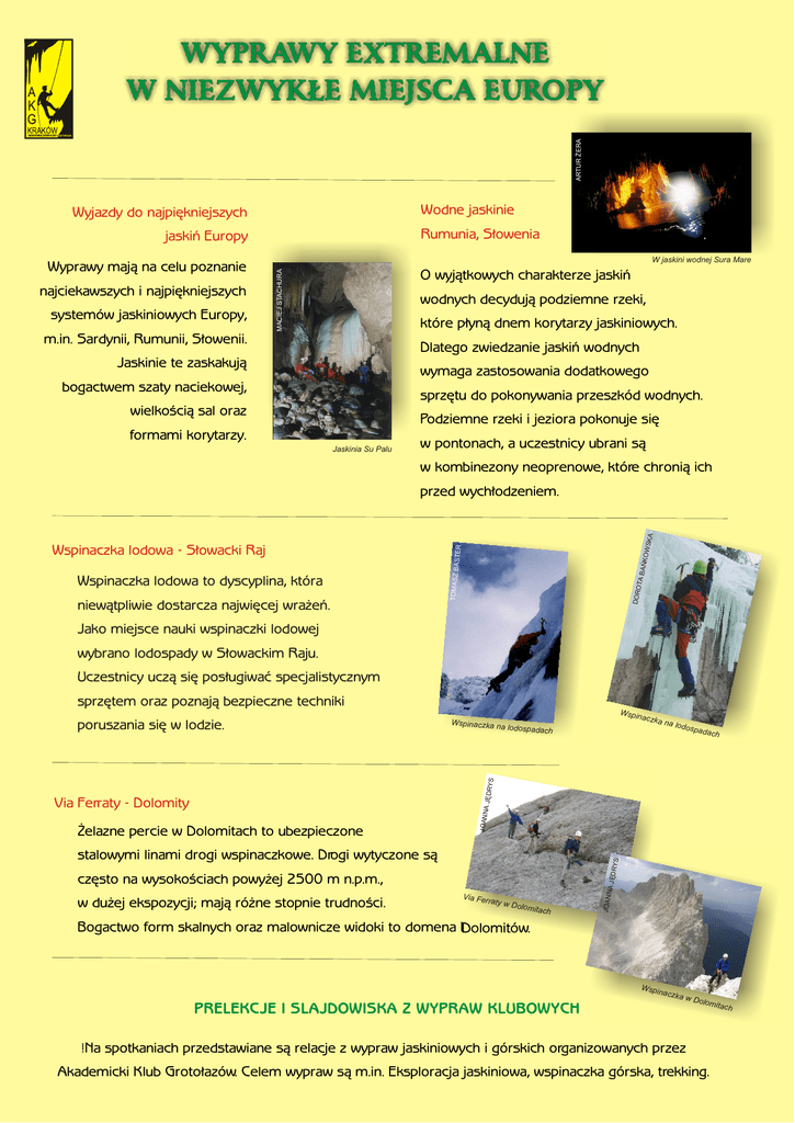 ARTUR ¯ERA WYPRAWY EXTREMALNE W NIEZWYK£E MIEJSCA EUROPY Wodne jaskinie Wyjazdy do najpiêkniejszych Rumunia, S³owenia jaskiñ Europy najciekawszych i najpiêkniejszych systemów jaskiniowych Europy, W jaskini wodnej Sura Mare MACIEJ STACHURA Wyprawy maj¹ na celu poznanie O wyj¹tkowych charakterze jaskiñ wodnych decyduj¹ podziemne rzeki, które p³yn¹ dnem korytarzy jaskiniowych. m.in. Sardynii, Rumunii, S³owenii. Dlatego zwiedzanie jaskiñ wodnych Jaskinie te zaskakuj¹ wymaga zastosowania dodatkowego bogactwem szaty naciekowej, sprzêtu do pokonywania przeszkód wodnych. wielkoœci¹ sal oraz Podziemne rzeki i jeziora pokonuje siê formami korytarzy. Jaskinia Su Palu w pontonach, a uczestnicy ubrani s¹ w kombinezony neoprenowe, które chroni¹ ich niew¹tpliwie dostarcza najwiêcej wra¿eñ. DORO TA BA Ñ Wspinaczka lodowa to dyscyplina, która TOMASZ BA STER Wspinaczka lodowa - S³owacki Raj KOW SKA przed wych³odzeniem. Jako miejsce nauki wspinaczki lodowej wybrano lodospady w S³owackim Raju. Uczestnicy ucz¹ siê pos³ugiwaæ specjalistycznym sprzêtem oraz poznaj¹ bezpieczne techniki stalowymi linami drogi wspinaczkowe. Drogi wytyczone s¹ czêsto na wysokoœciach powy¿ej 2500 m n.p.m., w du¿ej ekspozycji; maj¹ ró¿ne stopnie trudnoœci. Via Fe rraty w Dolom itach NA J Ê DRYS ¯elazne percie w Dolomitach to ubezpieczone spada ch JOAN Via Ferraty - Dolomity Wspin aczka na lod o Wspinaczka na lodospadach JOANN A JÊDR YS poruszania siê w lodzie. Bogactwo form skalnych oraz malownicze widoki to domena Dolomitów. Wspin aczka w PRELEKCJE I SLAJDOWISKA Z WYPRAW KLUBOWYCH Dolom itach !Na spotkaniach przedstawiane s¹ relacje z wypraw jaskiniowych i górskich organizowanych przez Akademicki Klub Groto³azów. Celem wypraw s¹ m.in. Eksploracja jaskiniowa, wspinaczka górska, trekking.