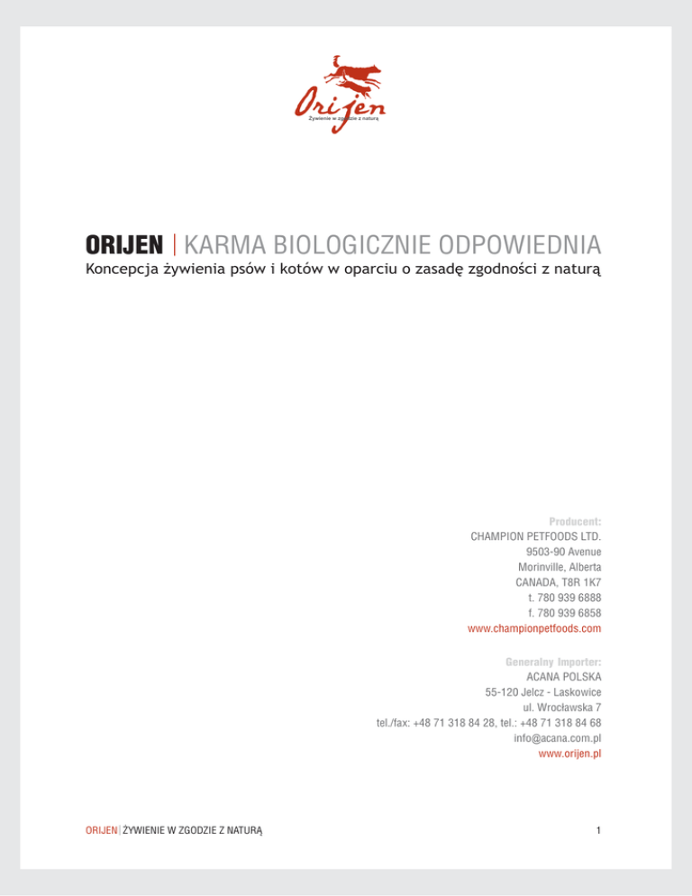 ¯ywienie w zgodzie z natur¹ ORIJEN KARMA BIOLOGICZNIE ODPOWIEDNIA Koncepcja ¿ywienia psów i kotów w oparciu o zasadê zgodnoœci z natur¹ Producent: CHAMPION PETFOODS LTD. 9503-90 Avenue Morinville, Alberta CANADA, T8R 1K7 t. 780 939 6888 f. 780 939 6858 www.championpetfoods.com Generalny Importer: ACANA POLSKA 55-120 Jelcz - Laskowice ul. Wroc³awska 7 tel./fax: +48 71 318 84 28, tel.: +48 71 318 84 68 [email protected] www.orijen.pl ORIJEN ¯YWIENIE W ZGODZIE Z NATUR¥ 1 ¯ywienie w zgodzie z natur¹ Ró¿nimy siê... W odró¿nieniu od miêdzynarodowych marketingowych firm, które sprzedaj¹, ale w rzeczywistoœci nie produkuj¹, dostêpnej dzisiaj na rynku karmy dla zwierz¹t domowych - Champion Petfoods wyró¿nia siê, jako niezale¿na, kanadyjska firma rodzinna, bêd¹ca producentem karmy dla zwierz¹t. Firma, zlokalizowana jest na rolniczych obszarach zachodniej Kanady i zyska³a sobie reputacjê producenta, którego misja jest jasna i niezmienna: PRODUKOWAÆ NAJLEPSZ¥ W KANADZIE KARMÊ DLA ZWIERZ¥T DOMOWYCH. Œwie¿oœæ sk³adników stanowi wa¿n¹ ró¿nicê, dlatego nasza karma jest unikalna, oparta na œwie¿ym miêsie, produktach, które rosn¹, dojrzewaj¹ w naszych regionalnych gospodarstwach lub s¹ po³awiane w pó³nocnych jeziorach i wodach Pacyfiku. Tworzymy nasz¹ dietê zgodnie z po¿ywieniem do jakiego koty i psy s¹ naturalnie przystosowane, przyk³adamy te¿ ogromn¹ wagê, aby nasze sk³adniki by³y przetworzone w najmniejszym jak to mo¿liwe stopniu, aby zachowaæ ich naturaln¹ wartoœæ. Rezultaty mówi¹ same za siebie od ponad 20 lat nasze produkty s¹ obdarzane zaufaniem przez mi³oœników zwierz¹t i hodowców w ponad 40 krajach na œwiecie. JESTEŒMY: · Niezale¿n¹ firm¹ rodzinn¹, produkuj¹c¹ karmy dla zwierz¹t od 1985 · Zaufanym i solidnym partnerem od 20 lat, ekskluzywna marka Champion jest sprzedawana przez specjalistów · Producentem karmy z jasn¹ misj¹ - PRODUKOWAÆ NAJLEPSZ¥ W KANADZIE KARMÊ DLA ZWIERZ¥T DOMOWYCH. · Nastawieni na jakoœæ, stosujemy œciœle kontrolowany proces technologiczny (HACCP) i sk³adniki posiadaj¹ce certyfikat Kanadyjskiej Agencji Inspekcji ¯ywnoœci · Specjalist¹ w produkcji karmy ze œwie¿ych sk³adników, które wyros³y albo zosta³y z³owione w zachodniej Kanadzie. · Jako innowatorzy w ¿ywieniu zwierz¹t i partnerzy rz¹dowego centrum innowacji ¿ywnoœci przodujemy w homeopatycznym leczeniu i od¿ywianiu. · Znani i obdarzeni zaufaniem przez konsumentów i specjalistycznych sprzedawców w ponad 40 krajach ORIJEN ¯YWIENIE W ZGODZIE Z NATUR¥ 2 ¯ywienie w zgodzie z natur¹ WSPANIALI DRUGOPLANOWI AKTORZY Nasi partnerzy zapewniaj¹ nam sta³e zaopatrzenie w sk³adniki takie jak: œwie¿e kurczaki, œwie¿e ryby, œwie¿e jajka, œwie¿y owies, œwie¿y len i olej canola oraz ró¿norodne wysokiej jakoœci regionalne sk³adniki, których ikony reprezentuj¹ najwy¿sze kanadyjskie standardy i s¹ dobrze znane kanadyjskim konsumentom. PROFESJONALNY PROGRAM EDUKACYJNY WSPÓ£CZESNE PSY - MIEJSCY MIÊSO¯ERCY „Przewód pokarmowy kotów i psów nie zmieni³ siê od setek lat. Wszystkie domowe psy, od chihuahuy do doga niemieckiego, maj¹ ten sam kod DNA, który sugeruje, ¿e psy maj¹ jednego przodka, którym jak ³atwo siê domyœliæ jest wilk.” WILKI I PSY - psi kuzyni Wilki i psy ró¿ni¹ siê jedynie 1-2 % w sekwencji DNA. Wilki (canis lapus) nale¿¹ do rodziny miêso¿ernych. Pies domowy (canis familiaris) jest tak¿e cz³onkiem rodziny miêso¿ernych. Anatomicznie i behawioralnie pies domowy jest najbardziej podobny do wilka. Wilki i psy maj¹ identyczny uk³ad trawienny. TRZY ANATOMICZNE CECHY, wspólne dla miêso¿ernych 1. DU¯Y PYSK I OSTRE ZÊBY Psy maj¹ du¿y pysk z pojedynczym stawem zaprojektowany, aby umo¿liwia³ ³ykanie po¿ywienia w ca³oœci (zamiast ¿uæ), z szpiczastymi zêbami przystosowanymi do szarpania i ciêcia (nie mielenia). 2. ŒLINA BEZ AMYLAZY Ludzie s¹ wyposa¿eni w enzym amylazê zawart¹ w œlinie, która trawi wstêpnie wêglowodany. Psy s¹ pozbawione tego enzymu, zatem nie s¹ przystosowane do trawienia wêglowodanów. 3. ZDOLNOŒCI TRAWIENNE Psy maj¹ o jedn¹ trzeci¹ krótszy przewód pokarmowy ni¿ wszystko¿ercy (jak cz³owiek). Krótki przewód pokarmowy umo¿liwia szybkie trawienie miêsa. W celu szybkiego rozpuszczenia miêsa, psy maj¹ wysok¹ koncentracjê kwasu solnego w ¿o³¹dku (pH - 1). Dla porównania w ludzkim ¿o³¹dku pH wynosi 5. ORIJEN ¯YWIENIE W ZGODZIE Z NATUR¥ 3 ¯ywienie w zgodzie z natur¹ CZY DZIESIEJSZE SUCHE KARMY S¥ DOPASOWANE DO ANATOMII MIÊSO¯ERCÓW ? Nie. Dzisiejsze suche karmy sk³adaj¹ siê g³ównie z p³atków, zawieraj¹ du¿o kukurydzy, pszenicy i ry¿u. Pomimo ¿e producenci karmy og³aszaj¹ zbo¿e jako dobre Ÿród³o bia³ka i energii, faktem pozostaje, ¿e psy nie s¹ biologicznie przystosowane do opartej na zbo¿u, wysoko wêglowodanowej diety. Canis lapus (wilk) - bliski krewny wspó³czesnego psa. Canis familiaris - nasz ukochany towarzysz - pies. Canis familiaris ma uk³ad trawienny identyczny jak wilk. HISTORIA KOMERCYJNYCH KARM Jeœli psy i koty s¹ miêso¿ercami, to dlaczego tak wiele karm zawiera du¿o wêglowodanów i zbó¿? OdpowiedŸ le¿y w historii suchych karm. Zanim zaczêto produkowaæ suche karmy, psy jad³y skrawki surowego miêsa i resztki jedzenia ze sto³u i by³y zdrowsze ni¿ dzisiejsze psy. Komercyjne karmy nie powstawa³y maj¹c na uwadze zdrowie psów. 1860 - PIERWSZE SUCHE KARMY James Spratt z Cincinnati wprowadzi³ ciastka zrobione z pszenicy, warzyw i byczej krwi. Inne firmy pod¹¿y³y t¹ drog¹ produkowano wiêcej takiego po¿ywienia i tak zbo¿a sta³y siê bazowym sk³adnikiem komercyjnych karm dla zwierz¹t. 1930 - WIELKI KRYZYS PROWADZI DO OBNI¯ENIA KOSZTÓW KARMY DLA ZWIERZ¥T. Mniej miêsa od rzeŸnika wiêcej zbó¿ i p³atków w karmach. 1960 - PRODUCENCI OG£ASZAJ¥, ¯E SUCHE KARMY DLA PSÓW S¥ ZNAKOMITE DAJ¥C MO¯LIWOŒÆ UTYLIZACJI ODPADÓW ZBO¯O