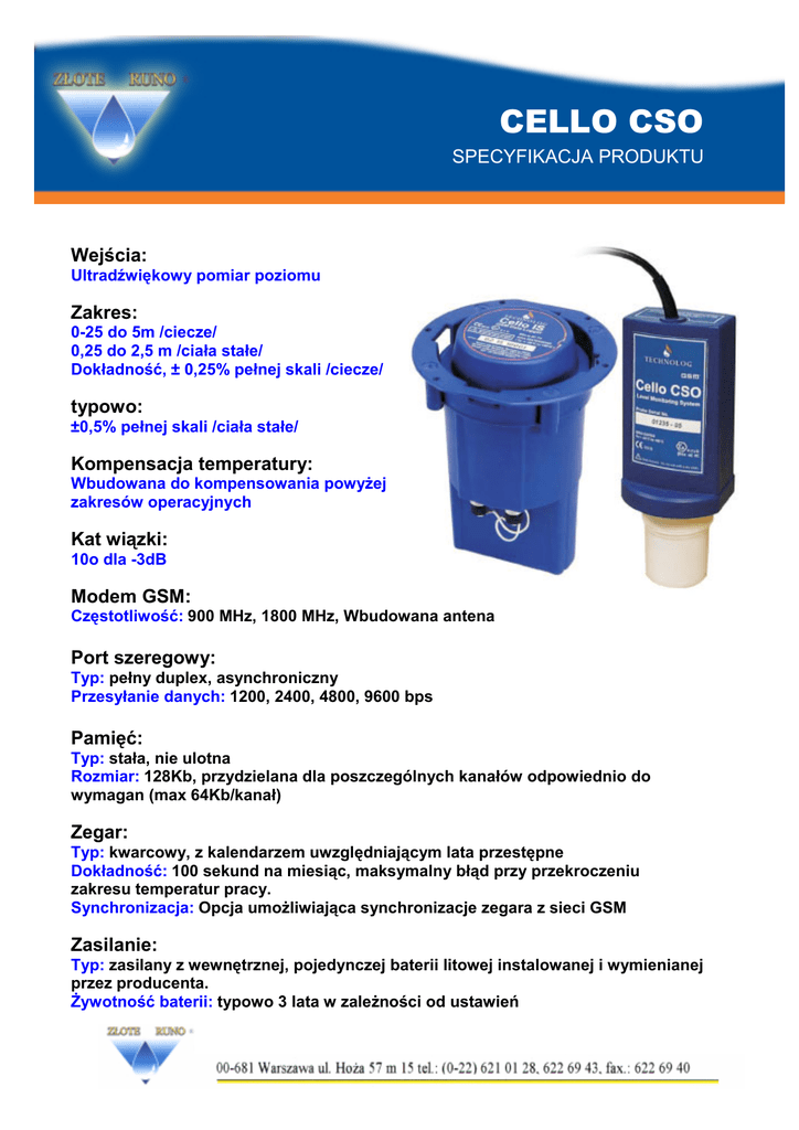 CELLO CSO SPECYFIKACJA PRODUKTU Wejścia: Ultradźwiękowy pomiar poziomu Zakres: 0-25 do 5m /ciecze/ 0,25 do 2,5 m /ciała stałe/ Dokładność, ± 0,25% pełnej skali /ciecze/ typowo: ±0,5% pełnej skali /ciała stałe/ Kompensacja temperatury: Wbudowana do kompensowania powyŜej zakresów operacyjnych Kat wiązki: 10o dla -3dB Modem GSM: Częstotliwość: 900 MHz, 1800 MHz, Wbudowana antena Port szeregowy: Typ: pełny duplex, asynchroniczny Przesyłanie danych: 1200, 2400, 4800, 9600 bps Pamięć: Typ: stała, nie ulotna Rozmiar: 128Kb, przydzielana dla poszczególnych kanałów odpowiednio do wymagan (max 64Kb/kanał) Zegar: Typ: kwarcowy, z kalendarzem uwzględniającym lata przestępne Dokładność: 100 sekund na miesiąc, maksymalny błąd przy przekroczeniu zakresu temperatur pracy. Synchronizacja: Opcja umoŜliwiająca synchronizacje zegara z sieci GSM Zasilanie: Typ: zasilany z wewnętrznej, pojedynczej baterii litowej instalowanej i wymienianej przez producenta. śywotność baterii: typowo 3 lata w zaleŜności od ustawień Dodatkowo wbudowana bateria podtrzymująca rejestracje i lokalna komunikacje w czasie gdy główna bateria ulegnie rozładowaniu. Rejestracja: Przedziały rejestracji: 15, 30 lub 60 min Przechowywanie danych: rotacyjne lub do zapełnienia pamięci. Alarmy: Wysoki/niski oraz zwiększona częstotliwość aktualizacji danych zaraz po zaistniałym alarmie Obudowa: IP 66 Temperatura pracy: -20oC do + 50oC Złącza: Typu wojskowego, zgodne z MIL-C-26482 Wymiary w mm: Czujnik: 217 wys. x 82 szer. x 88 sr. Cello: 191 wys. x 140 szer. X 150 sr.