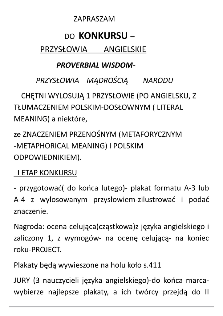 ZAPRASZAM DO KONKURSU – PRZYSŁOWIA ANGIELSKIE PROVERBIAL WISDOMPRZYSŁOWIA MĄDROŚCIĄ NARODU CHĘTNI WYLOSUJĄ 1 PRZYSŁOWIE (PO ANGIELSKU, Z TŁUMACZENIEM POLSKIM-DOSŁOWNYM ( LITERAL MEANING) a niektóre, ze ZNACZENIEM PRZENOŚNYM (METAFORYCZNYM -METAPHORICAL MEANING) I POLSKIM ODPOWIEDNIKIEM). I ETAP KONKURSU - przygotować( do końca lutego)- plakat formatu A-3 lub A-4 z wylosowanym przysłowiem-zilustrować i podać znaczenie. Nagroda: ocena celująca(cząstkowa)z języka angielskiego i zaliczony 1, z wymogów- na ocenę celującą- na koniec roku-PROJECT. Plakaty będą wywieszone na holu koło s.411 JURY (3 nauczycieli języka angielskiego)-do końca marcawybierze najlepsze plakaty, a ich twórcy przejdą do II ETAPU-lista tych uczniów będzie na tablicy ogłoszeń- I piętro i koło sali 411 . ETAP II ( kwiecień)-dokładna data i godzina zostanie podana później. Uczestnicy otrzymają 10 przysłów ( z tych zaprezentowanych na plakatach). Ich zadaniem będzie: uzupełnić brakujące słowa/zwroty i podać polskie odpowiedniki. WSZYSCY UCZESTNICY II ETAPU-UZYSKAJĄ OCENY CELUJĄCE(cząstkowe) I podwyższoną o PÓŁ OCENĘ , Z JĘZYKA ANGIELSKIEGO-NA KONIEC ROKU. PLAKATY 3 LAUREATÓW II etapu -będą PREZENTOWANE NA STAŁEJ EKSPOZYCJI-koło Sali 411-do końca roku szkolnego, a ich kopie na stronie szkoły. Zgłoszenia do mnie i innych nauczycieli języka angielskiego-do końca marca Zapraszam Hanna Karska