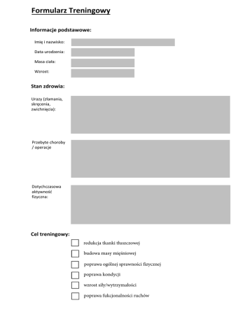 Formularz Treningowy Informacje podstawowe: Imię i nazwisko: Data urodzenia: Masa ciała: Wzrost: Stan zdrowia: Urazy (złamania, skręcenia, zwichnięcia): Przebyte choroby / operacje Dotychczasowa aktywność fizyczna: Cel treningowy: redukcja tkanki tłuszczowej budowa masy mięśniowej poprawa ogólnej sprawności fizycznej poprawa kondycji wzrost siły/wytrzymałości poprawa fukcjonalności ruchów Czy kiedykolwiek korzystał Pan/Pani z trenera personalnego? TAK NIE Typ, rodzaj wykonywanej pracy (fizyczna, siedząca, inna? jaka? ) Czy zażywa Pan/Pani leki na zmniejszenie ciśnienia? TAK Pozostałe uwagi: NIE