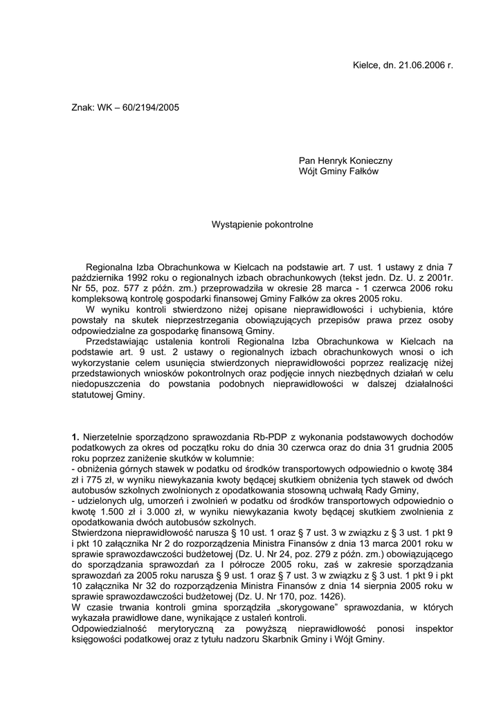 Kielce, dn. 21.06.2006 r. Znak: WK – 60/2194/2005 Pan Henryk Konieczny Wójt Gminy Fałków Wystąpienie pokontrolne Regionalna Izba Obrachunkowa w Kielcach na podstawie art. 7 ust. 1 ustawy z dnia 7 października 1992 roku o regionalnych izbach obrachunkowych (tekst jedn. Dz. U. z 2001r. Nr 55, poz. 577 z późn. zm.) przeprowadziła w okresie 28 marca - 1 czerwca 2006 roku kompleksową kontrolę gospodarki finansowej Gminy Fałków za okres 2005 roku. W wyniku kontroli stwierdzono niżej opisane nieprawidłowości i uchybienia, które powstały na skutek nieprzestrzegania obowiązujących przepisów prawa przez osoby odpowiedzialne za gospodarkę finansową Gminy. Przedstawiając ustalenia kontroli Regionalna Izba Obrachunkowa w Kielcach na podstawie art. 9 ust. 2 ustawy o regionalnych izbach obrachunkowych wnosi o ich wykorzystanie celem usunięcia stwierdzonych nieprawidłowości poprzez realizację niżej przedstawionych wniosków pokontrolnych oraz podjęcie innych niezbędnych działań w celu niedopuszczenia do powstania podobnych nieprawidłowości w dalszej działalności statutowej Gminy. 1. Nierzetelnie sporządzono sprawozdania Rb-PDP z wykonania podstawowych dochodów podatkowych za okres od początku roku do dnia 30 czerwca oraz do dnia 31 grudnia 2005 roku poprzez zaniżenie skutków w kolumnie: - obniżenia górnych stawek w podatku od środków transportowych odpowiednio o kwotę 384 zł i 775 zł, w wyniku niewykazania kwoty będącej skutkiem obniżenia tych stawek od dwóch autobusów szkolnych zwolnionych z opodatkowania stosowną uchwałą Rady Gminy, - udzielonych ulg, umorzeń i zwolnień w podatku od środków transportowych odpowiednio o kwotę 1.500 zł i 3.000 zł, w wyniku niewykazania kwoty będącej skutkiem zwolnienia z opodatkowania dwóch autobusów szkolnych. Stwierdzona nieprawidłowość narusza § 10 ust. 1 oraz § 7 ust. 3 w związku z § 3 ust. 1 pkt 9 i pkt 10 załącznika Nr 2 do rozporządzenia Ministra Finansów z dnia 13 marca 2001 roku w sprawie sprawozdawczości budżetowej (Dz. U. Nr 24, poz. 279 z późn. zm.) obowiązującego do sporządzania sprawozdań za I półrocze 2005 roku, zaś w zakresie sporządzania sprawozdań za 2005 roku narusza § 9 ust. 1 oraz § 7 ust. 3 w związku z § 3 ust. 1 pkt 9 i pkt 10 załącznika Nr 32 do rozporządzenia Ministra Finansów z dnia 14 sierpnia 2005 roku w sprawie sprawozdawczości budżetowej (Dz. U. Nr 170, poz. 1426). W czasie trwania kontroli gmina sporządziła „skorygowane” sprawozdania, w których wykazała prawidłowe dane, wynikające z ustaleń kontroli. Odpowiedzialność merytoryczną za powyższą nieprawidłowość ponosi inspektor księgowości podatkowej oraz z tytułu nadzoru Skarbnik Gminy i Wójt Gminy. 2 Wniosek pokontrolny Nr 1 W sprawozdaniu Rb-PDP półroczne/roczne z wykonania podstawowych dochodów podatkowych gminy wykazywać w kolumnie: - „Skutki obniżenia górnych stawek podatków obliczone za okres sprawozdawczy” rzeczywiste kwoty stanowiące różnicę pomiędzy dochodami jakie gmina mogłaby uzyskać stosując górne stawki podatku od środków transportowych, a dochodami jakie wynikają z zastosowanych niższych stawek uchwalonych przez Radę Gminy (również w przypadku pojazdów zwolnionych z opodatkowania), - „Skutki udzielonych przez gminę ulg, umorzeń i zwolnień...” rzeczywiste kwoty stanowiące skutki finansowe zwolnień od podatku od środków transportowych udzielonych przez Radę Gminy, zgodnie z przepisami aktualnie obowiązującego rozporządzenia. 2. Zarządzeniem Nr 17/2004 Wójta Gminy Fałków z dnia 22 czerwca 2004 roku powołano Gminną Komisję Rozwiązywania Problemów Alkoholowych. Cztery osoby wchodzące w skład Komisji nie posiadają przeszkolenia w zakresie profilaktyki i rozwiązywania problemów alkoholowych, co narusza art. 41 ust. 4 ustawy z dnia 26 października 1982 roku o wychowaniu w trzeźwości i przeciwdziałaniu alkoholizmowi (tekst jedn. Dz. U. z 2002 roku Nr 147, poz. 1231 z późn. zm.). Odpowiedzialność za powyższą nieprawidłowość ponosi Wójt Gminy. Wniosek pokontrolny Nr 2 Przeszkolić członków Komisji alkoholowych. w zakresie profilaktyki i rozwiązywania problemów 3. Wykaz z nieruchomością gruntową położoną w miejscowości Olszamowice, przeznaczoną do sprzedaży w drodze przetargu wywieszono na okres 14 dni w siedzibie Urzędu Gminy przy jednoczesnym zaniechaniu podania informacji o fakcie wywieszenia wykazu w prasie lokalnej, co narusza art. 35 ust. 1 ustawy z dnia 21 sierpnia 1997 roku o gospodarce nieruchomościami (tekst jedn. Dz. U. z 2004 r. Nr 261, poz. 2603 z późn. zm.), zgodnie z którym wójt sporządza i podaje do publicznej wiadomości wykaz nieruchomości przeznaczonych do sprzedaży. Wykaz ten wywiesza się na okres 21 dni w siedzibie urzędu, a ponadto informację o wywieszeniu tego wykazu podaje się do publicznej wiadomości przez ogłoszenie w prasie lokalnej oraz w inny sposób zwyczajowo przyjęty w danej miejscowości. Nadto ustalono, że ogłoszenie o przetargu na zbycie przedmiotowej nieruchomości podano do publicznej wiadomości na 14 dni przed wyznaczonym terminem przetargu, co narusza § 6 pkt 1 rozporządzenia Rady Ministrów z dnia 14 września 2004 roku w sprawie sposobu i trybu przeprowadzania przetargów oraz rokowań na zbycie nieruchomości (Dz. U. Nr 207, poz. 2108), zgodnie z którym wójt podaje do publicznej wiadomości ogłoszenie o przetargu co najmniej na 30 dni przed wyznaczonym terminem przetargu. Odpowiedzialność merytoryczną za stwierdzoną nieprawidłowość ponosi inspektor ds. Gospodarki Ziemią oraz Wójt Gminy z tytułu nadzoru. Wniosek pokontrolny Nr 3 3.1. Wykaz nieruchomości przeznaczonych do sprzedaży podawać do publicznej wiadomości w siedzibie Urzędu Gminy na okres 21 dni. 3.2. Informację o wywieszeniu w siedzibie Urzędu Gminy wykazu nieruchomości przeznaczonych do sprzedaży podawać do publicznej wiadomości przez ogł