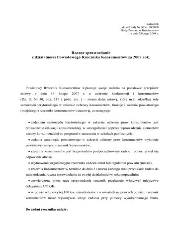 Załącznik do uchwały Nr XIV/130/2008 Rady Powiatu w Hrubieszowie z dnia 28lutego 2008 r. Roczne sprawozdanie z działalności Powiatowego Rzecznika Konsumentów za 2007 rok. Powiatowy Rzecznik Konsumentów wykonuje swoje zadania na podstawie przepisów ustawy z dnia 16 lutego 2007 r. o ochronie konkurencji i konsumentów (Dz. U. Nr 50, poz. 331 z późn. zm. ) – zwaną dalej ustawą, które m.in. określają rolę samorządu terytorialnego w zakresie ochrony konsumentów, funkcję i zadania powiatowego (miejskiego) rzecznika konsumentów i stanowią, co następuje: zadaniem samorządu terytorialnego w zakresie ochrony praw konsumentów jest prowadzenie edukacji konsumenckiej, w szczególności poprzez wprowadzenie elementów wiedzy konsumenckiej do programów nauczania w szkołach publicznych, zadania samorządu powiatowego w zakresie ochrony praw konsumentów wykonuje powiatowy (miejski) rzecznik konsumentów, rzecznik konsumentów jest bezpośrednio podporządkowany radzie i ponosi przed nią odpowiedzialność, usytuowanie organizacyjne rzecznika określa statut lub regulamin powiatu (miasta), rzecznik konsumentów w terminie do dnia 31 marca każdego roku przedkłada radzie do zatwierdzenia roczne sprawozdanie ze swojej działalności w roku poprzednim, zatwierdzone przez radę sprawozdanie rzecznik przekazuje właściwej miejscowo delegaturze UOKiK. w powiatach powyżej 100 tys. mieszkańców i w miastach na prawach powiatu rzecznik konsumentów może wykonywać swoje zadania przy pomocy wyodrębnionego biura. Do zadań rzecznika należy: zapewnienie bezpłatnego poradnictwa konsumenckiego i informacji prawnej w zakresie ochrony interesów konsumentów; składanie wniosków w sprawie stanowienia i zmiany przepisów prawa miejscowego w zakresie ochrony interesów konsumentów; występowanie do przedsiębiorców w sprawach ochrony praw i interesów konsumentów; współdziałanie z właściwymi miejscowo delegaturami Urzędu, organami Inspekcji Handlowej oraz organizacjami konsumenckimi; wykonywanie innych zadań określonych w ustawie lub w przepisach odrębnych. Rzecznik konsumentów może w szczególności wytaczać powództwa na rzecz konsumentów oraz wstępować, za ich zgodą, do toczącego się postępowania w sprawach o ochronę interesów konsumentów. Wskazać należy, że w okresie sprawozdawczym została zmieniona ustawa na podstawie której wykonywane są zadania samorządu dotyczące ochrony konkurencji i konsumentów. Weszła w życie 21 kwietnia 2007 roku. Zasadniczo treść regulacji dotyczących ochrony konsumentów jako zadania wykonywane przez samorząd nie uległa zmianie. Zauważyć należy natomiast zmianę dotyczącą samego rzecznika konsumentów. Rzecznik konsumentów jest podporządkowany bezpośrednio Radzie i przed nią ponosi odpowiedzialność. Spod kompetencji Rady Powiatu (Rady Miasta na prawach powiatu w porównaniu do wcześniejszego stanu prawnego) wyłączone zostało określanie warunków zatrudnienia i wynagrodzenia rzecznika konsumentów. Ponadto wskazać należy, że z dniem 21 grudnia 2007 roku weszła w życie ustawa z dnia 23 sierpnia 2007 roku o przeciwdziałaniu nieuczciwym praktykom rynkowym (Dz. U. Nr 171, poz. 1206). Ustawa ta wprowadza nowe instrumenty prawne dotyczące ochrony konsumentów polegających głównie na zaniechaniu stosowania bądź usunięcia skutków stosowania nieuczciwych praktyk rynkowych wymienionych w cyt. ustawie. Ze względu na krótki okres obowiązywania ustawy w okresie sprawozdawczym instrumenty w niej zawarte nie były stosowane. Zakres i formy pomocy udzielanej zgłaszającym się osobom były zróżnicowane. W większości przypadków pomoc ta polegała na poinformowaniu o obowiązujących regulacjach prawnych i możliwościach ich wykorzystania przez zainteresowanych w przypadku sporu z przedsiębiorcą, bądź udzieleniu porady odnośnie sposobu 2 postępowania w danej sprawie ewentualnie sporządzeniu wezwania do doprowadzenia zakupionego towaru do zgodnego z umową. Udzielanie tej najczęściej występującej formy pomocy odbywa się telefonicznie, pocztą elektroniczną bądź bezpośrednio interesantom zgłaszającym się osobiście. W porównaniu z rokiem 2006 jak i poprzednimi okresami sprawozdawczymi zauważalny jest wzrost porad dotyczących ochrony praw konsumenta drogą telefoniczną. Zgłaszający się konsumenci w większości tych przypadków chcieli zapoznać się z uregulowaniami prawnymi dotyczącymi konkretnej sytuacji i sami dochodzili swoich roszczeń na podstawie umowy gwarancji jakości udzielonej przez producenta dołączonej do towaru przy zawieraniu umowy kupna sprzedaży ewentualnie korzystali z regulacji ustawowych tzw. niezgodność towaru z umową. W przypadku braku pozytywnej dla konsumenta i zgodnej z obowiązującymi regulacjami prawnymi reakcji przedsiębiorcy, rzecznik kierował do naruszających ustawę antymonopolową, pisemne wystąpienia na podstawie artykułu 42 ust. 1 pkt. 3 wyżej cytowanej ustawy. W okresie sprawozdawczym takich wystąpień skierowanych zostało 34, co w porównaniu z ubiegłym rokiem stanowi spadek o 2 wystąpienia. Na skutek pisemnych wystąpień zdecydowana większość zgłoszonych przez konsumentów spraw została załatwiona pozytywnie. Postępowanie wyjaśniające w tych przypadkach kończyło się na etapie mediacji po uświadomieniu przedsiębiorcom dokonanych przez nich naruszeń przepisów prawnych regulujących politykę konsumencką. W dwóch przypadkach wyjaśnienia udzielone przez przedsiębiorcę wykazały niezgodne z zawartymi umowami korzystanie z rzeczy przez konsumentów, co powodowało bezzasadność ich roszczeń. W jednym przypadku przedsiębiorca uchybił obowiązkowi udzielenia odpowiedzi na wystąpienie co zgodnie z art. 114 cyt. wyżej ustawy skutkowało skierowaniem wniosku o ukaranie grzywną. W pozostałych przypadkach w ośmiu sytuacjach konieczne było skierowanie sprawy przez rzecznika na drogę postępowania