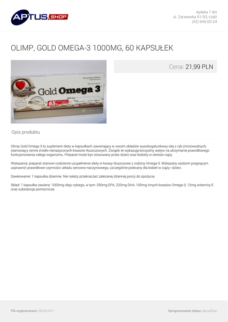 Apteka 7 dni ul. Zarzewska 51/53, Łódź (42) 640-00-24 OLIMP, GOLD OMEGA-3 1000MG, 60 KAPSUŁEK Cena: 21,99 PLN Opis produktu Olimp Gold Omega 3 to suplement diety w kapsułkach zawierający w swoim składzie wysokogatunkowy olej z ryb zimnowodnych, stanowiący cenne źródło nienasyconych kwasów tłuszczowych. Związki te wykazują korzystny wpływ na utrzymanie prawidłowego funkcjonowania całego organizmu. Preparat może być stosowany przez dzieci oraz kobiety w okresie ciąży. Wskazania: preparat stanowi codzienne uzupełnienie diety w kwasy tłuszczowe z rodziny Omega-3. Wskazany osobom pragnącym usprawnić prawidłowe czynności układu sercowo-naczyniowego, szczególnie polecany dla kobiet w ciąży i dzieci. Dawkowanie: 1 kapsułka dziennie. Nie należy przekraczać zalecanej dziennej porcji do spożycia. Skład: 1 kapsułka zawiera: 1000mg oleju rybiego, w tym: 330mg EPA, 220mg DHA, 100mg innych kwasów Omega-3; 12mg witaminy E oraz substancje pomocnicze. Plik wygenerowano: 09-03-2017 Powered by TCPDF (www.tcpdf.org) Oprogramowanie sklepu: AptusShop