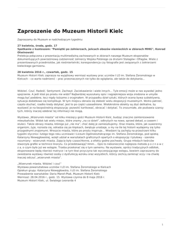 Zaproszenie do Muzeum Historii Kielc Zapraszamy do Muzeum w nadchodzącym tygodniu: 27 kwietnia, środa, godz. 17 Spotkanie z kustoszem: "Pamiątki po żołnierzach, jeńcach obozów niemieckich w zbiorach MHKi", Konrad Otwinowski Prelekcja połączona z prezentacją multimedialną zachowanych w zbiorach naszego Muzeum eksponatów dokumentujących powrześniową codzienność żołnierzy Wojska Polskiego za drutami Stalagów i Oflagów. Wiele z prezentowanych przedmiotów, jak nieśmiertelniki, korespondencja czy fotografie jest związanych z żołnierzami kieleckiego garnizonu. 28 kwietnia 2016 r., czwartek, godz. 15 Muzeum Historii Kielc zaprasza na wyjątkowy wernisaż wystawy prac uczniów I LO im. Stefana Żeromskiego w Kielcach – co warto nadmienić – prac przeznaczonych nie tylko do oglądania, ale także do dotykania... Widzieć. Czuć. Radość. Sentyment. Zachwyt. Zaciekawienie i wiele innych… Tyle emocji może w nas wywołać jedno spojrzenie. A jeśli ktoś po prostu nie widzi? Najbardziej wyszukany opis i najpiękniejsza wizja zrodzona w umyśle mogą być podobne, lecz nigdy tożsame z oryginałem. W przypadku dzieł sztuki, których ocena bywa subiektywna, sytuacja dodatkowo się komplikuje. W tym miejscu obnaża się słabość wielu ekspozycji muzealnych. Wolno patrzeć, często słuchać, rzadko kiedy dotykać. Jest to po części uzasadnione. Wielokrotnie obiekty są zbyt delikatne, by wystawić je na bezpośrednią ekspozycję: pozwolić kartkować, obracać i dotykać. To zrozumiałe, ale pozbawia szansy tych, którzy inaczej odebrać tej informacji nie mogą. Wystawa „Wizerunek miasta” od kilku miesięcy gości Muzeum Historii Kielc, budząc znaczne zainteresowanie mieszkańców. Widok tak wielu miejsc, które znamy „na co dzień”, odkrytych na nowo, sprzed dekad, a czasem i stuleci. Także obrazy miasta, którego już „nie ma”, choć dalej je zamieszkujemy. Oraz miasta, które, jak suwerenny organizm, żyje, rozrasta się, odradza się po klęskach, świętuje urodzaje, a my na tle tej historii wydajemy się tylko przygodnymi znajomymi. Wreszcie miasta, które po prostu inspiruje… Wiedzeni tą zachętą na przestrzeni kilku tygodni stycznia i lutego tego roku uczniowie I Liceum Ogólnokształcącego im. Stefana Żeromskiego, pod opieką Katarzyny Niewęgłowskiej, wzięli udział w warsztatach graficznych opartych o ekspozycję i tytułowy - szeroko rozumiany - wizerunek miasta. Zajęcia były czasochłonne, a efekty godne pochwały. Grupa młodych twórców stworzyła grafiki w technice linorytu. Co przedstawiają? Hmm… Opis to niekoniecznie najlepsza metoda p o z n a w c z a, o czym było już we wstępie. Trzeba przekonać się o tym samemu. Na wystawie, oprócz tradycyjnych odbitek, eksponowane będą również matryce i w tym tkwi przyczyna tak wyczerpującego wstępu, bowiem zapraszamy do zwiedzania wystawy również osoby z dysfunkcją wzroku oraz wszystkich, którzy zechcą zamknąć oczy i na chwilę inaczej odczuć „wizerunek miasta”. „Wizerunek miasta. Widzieć i czuć” Wystawa powarsztatowa uczniów I LO im. Stefana Żeromskiego w Kielcach Opiekun grupy: Katarzyna Niewęgłowska, I LO im. Stefana Żeromskiego Prowadzenie warsztatów: Daria Maroń-Ptak, Muzeum Historii Kielc Wernisaż: 28.04.2016 r., godz. 15. Wystawa czynna do 8 maja 2016 r. Muzeum Historii Kielc, ul. Świętego Leonarda 4 1