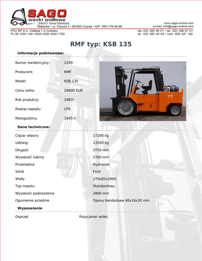 RMF typ: KSB 135 Informacje podstawowe: Numer ewidencyjny: 2249 Producent: RMF Model: KSB 135 Cena netto: 29800 EUR Rok produkcji: 1987r Rodzaj napędu: LPG Motogodziny: 1645 h Dane techniczne: Ciężar własny 17200 kg Udźwig: 13500 kg Długość 3750 mm Wysokość kabiny 2760 mm Przekładnia Hydrostat Silnik Ford Widły 170x85x2000 Typ masztu Standardowy Wysokość podnoszenia 2800 mm Ogumienie przednie Opony bandażowe 40x16x30 mm Wyposażenie Osprzęt Pozycjoner wideł,