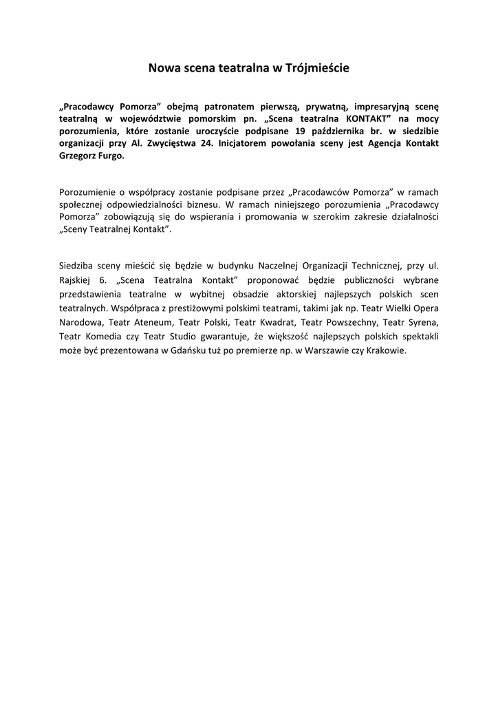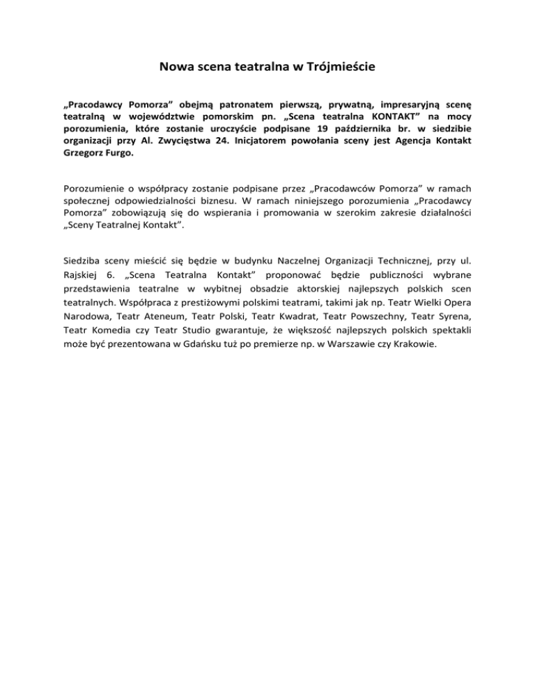 Nowa scena teatralna w Trójmieście „Pracodawcy Pomorza” obejmą patronatem pierwszą, prywatną, impresaryjną scenę teatralną w województwie pomorskim pn. „Scena teatralna KONTAKT” na mocy porozumienia, które zostanie uroczyście podpisane 19 października br. w siedzibie organizacji przy Al. Zwycięstwa 24. Inicjatorem powołania sceny jest Agencja Kontakt Grzegorz Furgo. Porozumienie o współpracy zostanie podpisane przez „Pracodawców Pomorza” w ramach społecznej odpowiedzialności biznesu. W ramach niniejszego porozumienia „Pracodawcy Pomorza” zobowiązują się do wspierania i promowania w szerokim zakresie działalności „Sceny Teatralnej Kontakt”. Siedziba sceny mieścić się będzie w budynku Naczelnej Organizacji Technicznej, przy ul. Rajskiej 6. „Scena Teatralna Kontakt” proponować będzie publiczności wybrane przedstawienia teatralne w wybitnej obsadzie aktorskiej najlepszych polskich scen teatralnych. Współpraca z prestiżowymi polskimi teatrami, takimi jak np. Teatr Wielki Opera Narodowa, Teatr Ateneum, Teatr Polski, Teatr Kwadrat, Teatr Powszechny, Teatr Syrena, Teatr Komedia czy Teatr Studio gwarantuje, że większość najlepszych polskich spektakli może być prezentowana w Gdańsku tuż po premierze np. w Warszawie czy Krakowie.