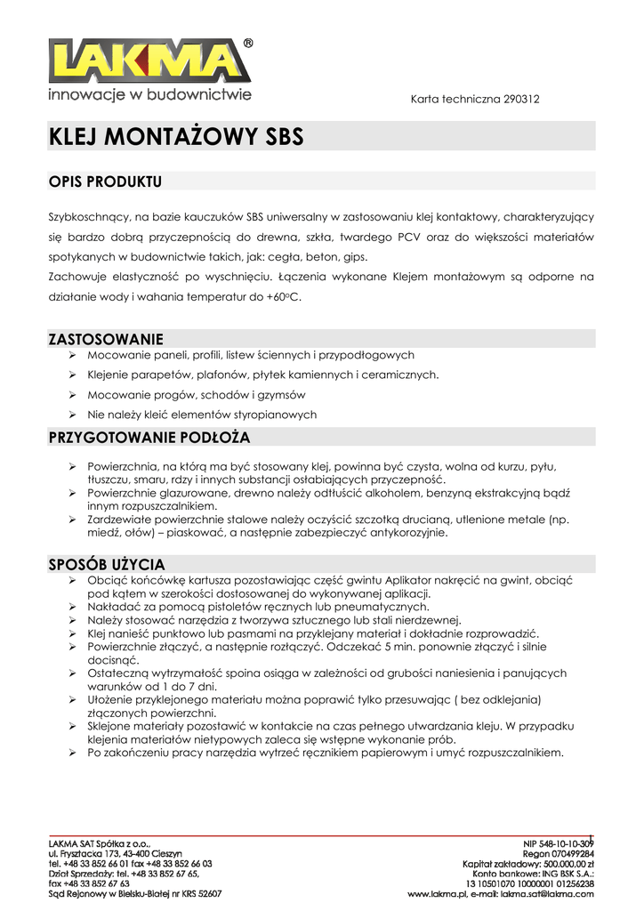 Karta techniczna 290312 KLEJ MONTAŻOWY SBS OPIS PRODUKTU Szybkoschnący, na bazie kauczuków SBS uniwersalny w zastosowaniu klej kontaktowy, charakteryzujący się bardzo dobrą przyczepnością do drewna, szkła, twardego PCV oraz do większości materiałów spotykanych w budownictwie takich, jak: cegła, beton, gips. Zachowuje elastyczność po wyschnięciu. Łączenia wykonane Klejem montażowym są odporne na działanie wody i wahania temperatur do +60oC. ZASTOSOWANIE Mocowanie paneli, profili, listew ściennych i przypodłogowych Klejenie parapetów, plafonów, płytek kamiennych i ceramicznych. Mocowanie progów, schodów i gzymsów Nie należy kleić elementów styropianowych PRZYGOTOWANIE PODŁOŻA Powierzchnia, na którą ma być stosowany klej, powinna być czysta, wolna od kurzu, pyłu, tłuszczu, smaru, rdzy i innych substancji osłabiających przyczepność. Powierzchnie glazurowane, drewno należy odtłuścić alkoholem, benzyną ekstrakcyjną bądź innym rozpuszczalnikiem. Zardzewiałe powierzchnie stalowe należy oczyścić szczotką drucianą, utlenione metale (np. miedź, ołów) – piaskować, a następnie zabezpieczyć antykorozyjnie. SPOSÓB UŻYCIA Obciąć końcówkę kartusza pozostawiając część gwintu Aplikator nakręcić na gwint, obciąć pod kątem w szerokości dostosowanej do wykonywanej aplikacji. Nakładać za pomocą pistoletów ręcznych lub pneumatycznych. Należy stosować narzędzia z tworzywa sztucznego lub stali nierdzewnej. Klej nanieść punktowo lub pasmami na przyklejany materiał i dokładnie rozprowadzić. Powierzchnie złączyć, a następnie rozłączyć. Odczekać 5 min. ponownie złączyć i silnie docisnąć. Ostateczną wytrzymałość spoina osiąga w zależności od grubości naniesienia i panujących warunków od 1 do 7 dni. Ułożenie przyklejonego materiału można poprawić tylko przesuwając ( bez odklejania) złączonych powierzchni. Sklejone materiały pozostawić w kontakcie na czas pełnego utwardzania kleju. W przypadku klejenia materiałów nietypowych zaleca się wstępne wykonanie prób. Po zakończeniu pracy narzędzia wytrzeć ręcznikiem papierowym i umyć rozpuszczalnikiem. 1 Karta techniczna 290312 DANE TECHNICZNE System utwardzania Czas obróbki Czas pełnego utwardzenia Temperatura aplikacji (stosowania) Odporność termiczna (utwardzonego produktu) Gęstość Kolorystyka Przechowywanie i transport Odparowanie rozpuszczalnika ok 2 min 2mm/24h +10° do +35°C -18° do +60°C ok. 1,56 ± 0,01 g/cm3 Beżowy W oryginalnie zamkniętych opakowaniach w suchych i chłodnych pomieszczeniach przez okres 12 miesięcy od dnia produkcji w temperaturach od +10° do +35°C INFORMACJE LOGISTYCZNE Pojemność opakowania jednostkowego Ilość sztuk w opakowaniu zbiorczym Ilość opakowań na palecie 300ml 15 1260 BHP I OSTRZEŻENIA Xi – produkt drażniący Zwroty wskazujące rodzaj zagrożenia: R10 – produkt łatwopalny R43 – może powodować uczulenie w kontakcie ze skórą R52/53 - działa szkodliwie na organizmy wodne, może powodować długo utrzymujące się niekorzystne zmiany w środowisku wodnym Zwroty określające warunki bezpiecznego stosowania: S2 - chronić przed dziećmi S24 - unikać zanieczyszczenia skóry. S37 - nosić odpowiednie rękawice ochronne S46 - W razie połknięcia niezwłocznie zasięgnij porady lekarza – pokaż opakowanie lub etykietę. Aktualizacja 29.03.2012 Powyższe dane, zalecenia i wskazówki opierają się na naszej najlepszej wiedzy, badaniach oraz doświadczeniach i zostały udzielone w dobrej wierze zgodnie z zasadami obowiązującymi w naszej firmie i u naszych dostawców. W razie nie zastosowania się do zaleceń dotyczących sposobu stosowania masy, firma LAKMA SAT nie ponosi odpowiedzialności, za jakość uszczelnienia. 2