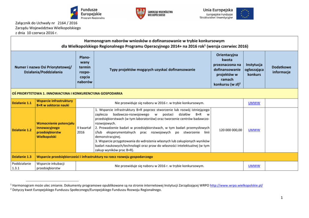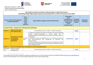 Załącznik do Uchwały nr 2164 / 2016 Zarządu Województwa Wielkopolskiego z dnia 10 czerwca 2016 r. Harmonogram naborów wniosków o dofinansowanie w trybie konkursowym dla Wielkopolskiego Regionalnego Programu Operacyjnego 2014+ na 2016 rok1 (wersja czerwiec 2016) Numer i nazwa Osi Priorytetowej/ Działania/Poddziałania Planowany termin rozpoczęcia naborów Typy projektów mogących uzyskać dofinansowanie Orientacyjna kwota przeznaczona na Instytucja dofinansowanie ogłaszająca projektów w konkurs ramach konkursu (w zł)2 Dodatkowe informacje OŚ PRIORYTETOWA 1. INNOWACYJNA I KONKURENCYJNA GOSPODARKA Działanie 1.1 1 2 Wsparcie infrastruktury B+R w sektorze nauki Nie przewiduje się naboru w 2016 r. w trybie konkursowym. 1. Wsparcie infrastruktury B+R poprzez stworzenie lub rozwój istniejącego zaplecza badawczo-rozwojowego w postaci działów B+R w przedsiębiorstwach (w tym laboratoriów) oraz tworzenie centrów badawczorozwojowych. 2. Prowadzenie badań w przedsiębiorstwach, w tym badań przemysłowych i/lub eksperymentalnych prac rozwojowych po stworzenie linii demonstracyjnej. 3. Wsparcie przygotowania do wdrożenia własnych lub zakupionych wyników badań naukowych/technologii oraz praw do własności intelektualnej (w tym zakup wyników prac B+R). Działanie 1.2 Wzmocnienie potencjału innowacyjnego II kwartał przedsiębiorstw 2016 Wielkopolski Działanie 1.3 Wsparcie przedsiębiorczości i infrastruktury na rzecz rozwoju gospodarczego Poddziałanie 1.3.1 Wsparcie inkubacji przedsiębiorstw Nie przewiduje się naboru w 2016 r. w trybie konkursowym. UMWW 120 000 000,00 UMWW UMWW Harmonogram może ulec zmianie. Dokumenty programowe opublikowane są na stronie internetowej Instytucji Zarządzającej WRPO http://www.wrpo.wielkopolskie.pl/ Dotyczy kwot Europejskiego Funduszu Społecznego/Europejskiego Funduszu Rozwoju Regionalnego. 1 Poddziałanie 1.3.2 Poddziałanie 1.3.3 Poprawa jakości usług na I kwartał rzecz inkubacji 2016 przedsiębiorstw Infrastruktura na rzecz rozwoju gospodarczego Rozwój potencjału i poprawa jakości specjalistycznych usług oraz infrastruktury instytucji otoczenia biznesu na rzecz inkubacji przedsiębiorstw, w tym dla regionalnych inteligentnych specjalizacji. Kompleksowe tworzenie nowej i rozwój istniejącej infrastruktury na rzecz rozwoju gospodarczego (w tym dla regionalnych specjalizacji) w szczególności na nieużytkach, zlokalizowanych w pobliżu inwestycji transportowych (autostrady, drogi szybkiego ruchu, linii kolejowe), terenach zdegradowanych, wymagających rewitalizacji: - uporządkowanie i przygotowanie terenów inwestycyjnych w celu nadania im nowych funkcji gospodarczych, III kwartał - uzbrojenie terenów inwestycyjnych (infrastruktura wodno-kanalizacyjna, 2016 telekomunikacyjna, energetyczna, gazowa), budowę lub modernizację układu komunikacyjnego terenu inwestycyjnego (wewnętrzna infrastruktura drogowa, wewnętrzna infrastruktura kolejowa bez infrastruktury doprowadzającej), - budowę, rozbudowę lub modernizację innej wyspecjalizowanej infrastruktury technicznej na terenach inwestycyjnych oraz kampanie promocyjne (jako element uzupełniający projektu). Projekty zgodne z Mandatem Terytorialnym poszczególnych OSI Ośrodków Subregionalnych Kompleksowe tworzenie nowej i rozwój istniejącej infrastruktury na rzecz rozwoju gospodarczego (w tym dla regionalnych specjalizacji) w szczególności na nieużytkach, zlokalizowanych w pobliżu inwestycji transportowych (autostrady, drogi szybkiego ruchu, linii kolejowe), terenach zdegradowanych, wymagających rewitalizacji: III kwartał - uporządkowanie i przygotowanie terenów inwestycyjnych w celu nadania 2016 im nowych funkcji gospodarczych, - uzbrojenie terenów inwestycyjnych (infrastruktura wodno-kanalizacyjna, telekomunikacyjna, energetyczna, gazowa), budowę lub modernizację układu komunikacyjnego terenu inwestycyjnego (wewnętrzna infrastruktura drogowa, wewnętrzna infrastruktura kolejowa bez infrastruktury doprowadzającej), - budowę, rozbudowę lub modernizację innej wyspecjalizowanej infrastruktury technicznej na terenach inwestycyjnych oraz kampanie promocyjne (jako element uzupełniający projektu). 60 000 000,00 UMWW 40 000 000,00 UMWW 25 075 000,00 UMWW 2 Poddziałanie 1.3.4 Działanie 1.4 Poddziałanie 1.4.1 Poddziałanie 1.4.2 Działanie 1.5 Poddziałanie 1.5.1 Poddziałanie 1.5.2 Poddziałanie 1.5.3 Wsparcie przedsiębiorczości i infrastruktury na rzecz W Poddziałaniu brak naborów w trybie konkursowym, projekty realizowane są wyłącznie w trybie pozakonkursowym. rozwoju gospodarczego w ramach ZIT dla MOF Poznania Internacjonalizacja gospodarki regionalnej Kompleksowe wsparcie rozwoju działalności przedsiębiorstw na rynkach zagranicznych Nie przewiduje się naboru w 2016 r. w trybie konkursowym. UMWW dla przedsiębiorstw posiadających plan rozwoju eksportu Promocja gospodarcza W Poddziałaniu brak naborów w trybie konkursowym, projekty realizowane są wyłącznie w trybie pozakonkursowym. regionu Wzmocnienie konkurencyjności przedsiębiorstw Instrumenty finansowe podnoszące Nie przewiduje się naboru w 2016 r. w trybie konkursowym. UMWW konkurencyjność MŚP Wzmocnienie konkurencyjności Nie przewiduje się naboru w 2016 r. w trybie konkursowym. UMWW kluczowych obszarów gospodarki regionu Wzrost konkurencyjności przedsiębiorstw poprzez Nie przewiduje się naboru w 2016 r. w trybie konkursowym. UMWW poprawę efektywności energetycznej OŚ PRIORYTETOWA 2. SPOŁECZEŃSTWO INFORMACYJNE Działanie 2.1 Poddziałanie 2.1.1. Rozwój elektronicznych usług publicznych 1. Zwiększenie dostępu obywateli do usług publicznych z zakresu e-zdrowia, Rozwój elektronicznych III kwartał wsparcie cyfryzacji procesów w obszarze ochrony zdrowia i usług usług publicznych 2016 r. społecznych. 2. Tworzenie, rozwijanie oraz udostępnianie m.in.: 40 000 000,00 UMWW W Poddziałaniu przewiduje się także zastosowanie trybu pozakonkursowego 3 - baz danych