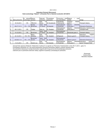 2013 2014 Kalendarz Polowań Zbiorowych Koła Łowieckiego “Bażant” w Drawsku Pom w Sezonie Łowieckim 2013/2014 Lp 1 Nr obwodu Nazwa Data polowania łowieckiego łowiska 19.10.2013 179 Młynowo Kosów 179 – 178 Brzeźniak Gatunek zwierzyny Prowadzący polowanie Pomocnicy i pies Miejsce do postrzałków zbiórki M. Kowalewski E.Rudziński P.Żarczyński Gudowo godz 8 Jeleń Dzik Lis Sarna St.Zarębski M.Kowalewski E.Rudziński Stawno Siedziba Koła godz 7 Polowanie Dewizowe Dzik Sarna Lis i czas Uwagi Boisko Transport własny 2 26-27.10.13 3 09.11.2013 178 Trójkąt Dzik Lis St. Zarębski M.Kowalewski E.Rudziński Stawno Siedziba Polowanie Hubertowskie Koła godz 8 Transport Koła 4 14.12.2013 178 Brzeźniak Jeleń Dzik Lis Sarna St. Zarębski M.Kowalewski E.Rudziński Brzeźniak godz 8 Transport własny Rejon Siedziby Dzik Sarna B.Rajewski Stawno godz 8 Polowanie wigilijne Transport własny Jeleń Dzik Lis Sarna St. Zarębski M.Kowalewski E.Rudziński Stawno godz 8 Polowanie Dewizowe Dzik Sarna M.Kowalewski E.Rudziński Stawno Siedziba Polowanie kończące Koła godz 8 sezon Transport Koła 5 24.12.2013 178 179 6 04-06.01.14 Brzeźniak 178 – 179 Kosów 7 11.01.2014 179 Kański Las Lis St. Zarębski Lis St.Zarębski - Zarząd Koła zaprasza Małżonki i Małżonków myśliwych na ognisko po Polowaniu Hubertowskim w dniu 09.11.2013 – godz 14. - Prowadzący polowanie na 7 dni przed polowaniem wyznaczy kierownika naganki z pośród członków Koła. - Na polowaniu dewizowym funkcję kierownika naganki pełni drugi pomocnik prowadzącego polowanie. - Zabranie psa na polowanie zbiorowe należy uzgodnić wcześniej z prowadzącym polowanie. Opracował Łowczy Koła Stanisław Zarębski Strona 1