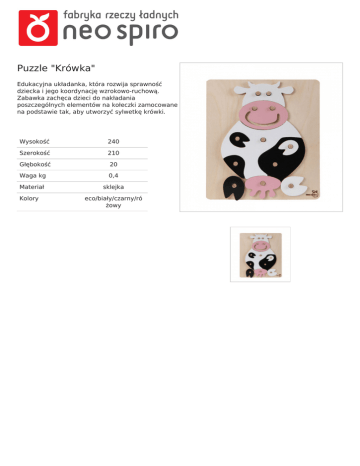 Puzzle "Krówka" Edukacyjna układanka, która rozwija sprawność dziecka i jego koordynację wzrokowo-ruchową. Zabawka zachęca dzieci do nakładania poszczególnych elementów na kołeczki zamocowane na podstawie tak, aby utworzyć sylwetkę krówki. Wysokość 240 Szerokość 210 Głębokość 20 Waga kg 0,4 Materiał sklejka Kolory Powered by TCPDF (www.tcpdf.org) eco/biały/czarny/ró żowy