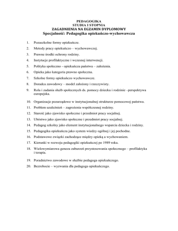 PEDAGOGIKA STUDIA I STOPNIA ZAGADNIENIA NA EGZAMIN DYPLOMOWY Specjalność: Pedagogika opiekuńczo-wychowawcza 1. Pozaszkolne formy opiekuńcze. 2. Metody pracy opiekuńczo – wychowawczej. 3. Prawne środki ochrony rodziny. 4. Instytucje profilaktyczne i wczesnej interwencji. 5. Polityka społeczno - opiekuńcza państwa – założenia. 6. Opieka jako kategoria prawno społeczna. 7. Szkolne formy opiekuńczo wychowawcze. 8. Doradca zawodowy – model założony i rzeczywisty. 9. Rola i zadania służb społecznych ds. pomocy dziecku i rodzinie –perspektywa europejska. 10. Organizacje pozarządowe w instytucjonalnej strukturze pomocowej państwa. 11. Problem uzależnień – zagrożenia współczesnej rodziny. 12. Starość jako zjawisko społeczne i przedmiot pracy socjalnej. 13. Ubóstwo jako zjawisko społeczne i przedmiot pracy socjalnej. 14. Pedagog szkolny jako element instytucjonalnego wsparcia dziecka i rodziny. 15. Pedagogika opiekuńcza jako system wiedzy ogólnej i jej pochodne. 16. Podstawowe związki zachodzące między opieką a wychowaniem. 17. Kierunki w rozwoju pedagogiki opiekuńczej po 1989 roku. 18. Wielowymiarowa geneza zaburzeń przystosowania społecznego – profilaktyka i terapia. 19. Poradnictwo zawodowe w służbie pedagoga opiekuńczego. 20. Bezrobocie – wyzwania dla pedagoga opiekuńczego.