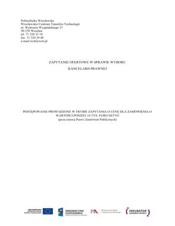 Politechnika Wrocławska Wrocławskie Centrum Transferu Technologii ul. Wybrzeże Wyspiańskiego 27 50-370 Wrocław tel. 71 320 33 18 fax. 71 320 39 48 e-mail:[email protected] ZAPYTANIE OFERTOWE W SPRAWIE WYBORU KANCELARII PRAWNEJ POSTĘPOWANIE PROWADZONE W TRYBIE ZAPYTANIA O CENĘ DLA ZAMÓWIENIA O WARTOŚCI PONIŻEJ 14 TYS. EURO NETTO (poza ustawą Prawo Zamówień Publicznych) 1 Przedmiot zamówienia: 1.1 Usługa doradcza dotycząca prawnego aspektu komercjalizacji wyników badań naukowych (transfer technologii), regulująca długoterminową współpracę Politechniki Wrocławskiej i firmy zewnętrznej. 1.2 Utworzenie umowy lub umów warunkowej sprzedaży kilku patentów. 1.3 Utworzenie umowy zlecenia komercyjnego na badania naukowe, związanego ze sprzedażą patentów. 2 Wymagania wobec dostawcy: 2.1 Podmiot ubiegający się o realizację zamówienia powinien prowadzić działalność gospodarczą we wskazanym zakresie na terenie Unii Europejskiej lub posiadać przedstawicielstwo na jej terenie. 3 Kryteria wyboru oferty: Zamawiający dokona oceny ważnych ofert na podstawie kryterium: oferowana cena 100%. Za najkorzystniejszą zostanie wybrana oferta z najniższą ceną. 4 Miejsce i termin składania ofert Termin składania ofert: 14.07.2014 do godz. 12.00 Miejsce składania ofert: Wrocławskie Centrum Transferu Technologii, Politechnika Wrocławska ul. Smoluchowskiego 48, 50-372 Wrocław lub na adres e-mail: [email protected] lub tel. 71 320 3318 | fax 71 320 3948 oferty będą przyjmowane w formie elektronicznej lub papierowej, przy czym za datę wpływu oferty traktuje się datę jej dostarczenia do WCTT. 5 Osoba do kontaktów z oferentami: Tomasz Marciniszyn Wrocławskie Centrum Transferu Technologii ul. Smoluchowskiego 48, 50-372 Wrocław tel. 71 320 4195 | fax 71 320 39 48 | [email protected]|