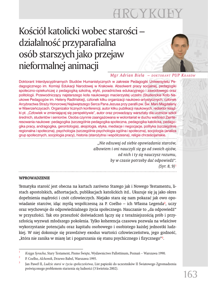 ARTYKUŁY Kościół katolicki wobec starości – działalność przyparafialna osób starszych jako przejaw nieformalnej animacji Mg r A dr ian Biela – dok tor ant PUP K r a k ó w Doktorant Interdyscyplinarnych Studiów Humanistycznych w zakresie Pedagogiki Uniwersytetu Pedagogicznego im. Komisji Edukacji Narodowej w Krakowie. Absolwent pracy socjalnej, pedagogiki społeczno-opiekuńczej z pedagogiką szkolną, etyki, poradnictwa edukacyjnego i zawodowego oraz politologii. Przewodniczący najstarszego koła naukowego macierzystej uczelni (Studenckie Koło Naukowe Pedagogów im. Heleny Radlińskiej), członek kilku organizacji naukowo-artystycznych, członek Arcybractwa Straży Honorowej Najświętszego Serca Pana Jezusa przy parafii pw. Św. Marii Magdaleny w Wawrzeńczycach. Organizator licznych konferencji, autor kliku publikacji naukowych, redaktor książki pt. „Człowiek w zmieniającej się perspektywie”, autor oraz prowadzący warsztaty dla uczniów szkół średnich, studentów i seniorów. Osoba czynnie zaangażowana w wolontariat w duchu wartości.Zainteresowania naukowe: pedagogika (szczególnie pedagogika społeczna, pedagogika katolicka, pedagogika pracy, andragogika, gerontologia), aksjologia, etyka, mediacje i negocjacje, polityka (szczególnie regionalna i społeczna), psychologia (szczególnie psychologia ogólna i społeczna), socjologia (analiza grup społecznych, socjologia pracy), historia (starożytna i współczesna), religie chrześcijańskie. „Nie odsuwaj od siebie opowiadania starców, albowiem i oni nauczyli się go od swoich ojców, od nich i ty się nauczysz rozumu, by w czasie potrzeby dać odpowiedź”. (Syr. 8, 9) 1 WPROWADZENIE1 Tematyka starość jest obecna na kartach zarówno Starego jak i Nowego Testamentu, listach apostolskich, adhortacjach, publikacjach katolickich itd.. Ukazuje się ją jako okres dopełnienia mądrości i cnót człowieczych. Niejako stara się nam pokazać jak owo opowiadanie starców, idąc myślą współczesną za P. Coelho – ich Własna Legenda2, uczy oraz wychowuje do odpowiedzialnego życia społecznego. Nauczanie to „da odpowiedź” w przyszłości. Tak oto przeszłość doświadczeń łączy się z teraźniejszością prób i przyszłością wyzwań młodszego pokolenia. Tylko koherencja czasowa pozwala na właściwe wykorzystanie potencjału oraz kapitału osobowego i osobistego każdej jednostki ludzkiej. W niej dokonuje się prawdziwy exodus wartości człowieczeństwa, jego godność, „która nie zanika w miarę lat i pogarszania się stanu psychicznego i fizycznego”3. 1 2 3 Księga Syracha, Stary Testament, Pismo Święte, Wydawnictwo Pallottinum, Poznań – Warszawa 1990. P. Coelho, Alchemik, Drzewo Babel, Warszawa 1995. Jan Paweł II, Ludzie starsi w życiu społeczeństwa, List papieski do uczestników II Światowego Zgromadzenia poświęconego problemom starzenia się ludności (3 kwietnia 2002). 163 ARTICLES 1. ZNACZENIE STAROŚCI „Polityka demograficzna nie może traktować ludzi wyłącznie w kategoriach ilościowych, ekonomicznych ani kierując się jakimikolwiek uprzedzeniami. Musi ona szanować i służyć godności oraz podstawowym prawom osoby ludzkiej”4. Tymi słowami św. Jan Paweł II na początku swojego pontyfikatu zwracał uwagę na poszanowanie godności ludzkiej, w tym godności osoby starszej. Współczesność zmagająca się z ogromnym problemem demograficznym – starzeniem się społeczeństw i narodów, nie może zapominać o apelu tego wielkiego człowieka. W okresie, gdy słowa te jeszcze nie ucichły, a zarazem na nowo do nas przemawiają w związku z jego niedawną kanonizacją, potrzebna jest refleksja nad podejściem, szczególnie świata nauki i polityki, do kwestii starzenia się i starości. Każde oddziaływanie skierowane do osób w podeszłym wieku winno być nacechowane tą godnością. Pomagając jednostce, nie możemy ją ubezwłasnowolniać, a jednocześnie spychać na margines życia społecznego, jako tą mniej użyteczną z ekonomicznego punktu widzenia. Nauka zaś, dochodząc do prawdy, nie może pozbawiać człowieka jego człowieczeństwa. Nie cel naukowy, jakim jest zdobycie nowej wiedzy, jest tutaj kluczowy, ale cel służenia drugiemu poprzez wykorzystywanie tychże informacji do inicjowania adekwatnie przygotowanych programów wsparcia stwarzających realne szanse zmiany obecnego położenia osób defaworyzowanych, do jakich ciągle należą osoby znajdujące się na emeryturze, lub korzystające z innych form wsparcia socjalnego. Długo lansowany w kulturze ponowoczesnej model nonsensowności starości i śmierci zdał się utkwić w świadomości niektórych na dłużej. Sytuacje ograniczenia ludzkiej sprawności, momenty bólu i cierpienia zaczęły odbierać sens życia, co nie powinno mieć miejsca, ponieważ ludzkie życie nie kończy się z chwilą przejścia w tzw. trzeci lub czwarty wiek. Owszem jest to ostatni etap naszej egzystencji, ale nie muszący odbywać się pod dyktando podejścia utylitarystycznego, który za miernik szczęścia zdał się obrać wydajność i związaną z nią sprawność. Z tej perspektywy patrzy się na człowieka starszego, często schorowanego i cierpiącego, tabelarycznie, a mianowicie pod względem zysków i strat, nie wspominając o stereotypowym umieszczaniu starości poza głównym nurtem refleksji. Starość nie może być stawiana poza margines analiz zwykłego człowieka i winna być obecna w zabiegach wychowawczych. Wychowanie w starości łączy się bowiem z wychowaniem do starości i wychowaniem poprzez starość. Żywy przykład daje nam praktyka wielu miejsc. Działalność licznych parafii, organizacji religijnych, stowarzyszeń, grup modlitewnych włączających ludzi starszych do kształtowania swojej rzeczywistości poprzez aktywizowanie ich potencjału jest tego najlepszym wyrazem. O takie podejście apelował przez całe swoje życie schorowany, cierpiący, umierający w bólach, 