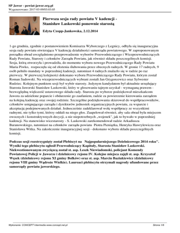 SP Jawor - powiat-jawor.org.pl Wygenerowano: 2017-03-09/03:03:05 Pierwsza sesja rady powiatu V kadencji Stanisław Laskowski ponownie starostą Edyta Czopp-Jankowska, 2.12.2014 1-go grudnia, zgodnie z postanowieniem Komisarza Wyborczego z Legnicy, odbyła się inauguracyjna sesja rady powiatu otwierająca V kadencję działalności samorządu powiatowego. W zaproponowanym porządku obrad uwzględniono przeprowadzenie wyborów Przewodniczącego i Wiceprzewodniczących Rady Powiatu, Starosty i członków Zarządu Powiatu, jak również składu poszczególnych komisji. Sesja, którą otworzyła i prowadziła, do momentu wyboru nowego Przewodniczącego Rady Powiatu Maria Piwko, rozpoczęła się od złożenia ślubowania przez obecnych radnych. W gronie 17 radnych, 9 osób pełniło mandaty w poprzedniej kadencji, natomiast 4 radnych znalazło się w radzie po raz pierwszy. W pierwszej kolejności dokonano wyboru Przewodniczącego Rady Powiatu, którym został Roman Sadowski. Na wiceprzewodniczących wybrani zostali Jan Grygorcewicz oraz Sylwester Rudziec. Kolejnym punktem sesji był wybór starosty. Jedynym kandydatem był aktualnie urzędujący Starosta Jaworski Stanisław Laskowski, który w głosowaniu tajnym uzyskał - wymaganą prawem bezwzględną większość ustawowego składu rady. Starosta po wyborze podziękował mieszkańcom Jawora za udzielone poparcie i obdarzenie go zaufaniem, radzie za powierzenie kierowania zarządem na kolejną kadencję oraz swojej rodzinie. Szczególne podziękowania skierował do współpracowników, członków ustępującego zarządu i dyrektorów jednostek organizacyjnych powiatu, za wsparcie i akceptację podejmowanych działań. Jednocześnie zadeklarował wolę współpracy ze wszystkimi radnymi, nie tylko tymi, którzy oddali na niego głos. Zaapelował również, aby sala obrad była miejscem owocnych i konstruktywnych decyzji, a nie niepotrzebnych „wojenek", jak to bywało w poprzedniej kadencji. Na stanowisko wicestarosty - S. Laskowski zarekomendował radzie Arkadiusza Baranowskiego, natomiast na członków zarządu powiatu Piotra Pieniążka, Henryka Hawrylewicza oraz Stanisława Witka. Na zakończenie inauguracyjnej sesji - dokonano wyboru składu poszczególnych komisji. Podczas sesji rozstrzygnięty został Plebiscyt na „Najpopularniejszego Dzielnicowego 2014 roku". Wyniki tego plebiscytu ogłosił Przewodniczący Kapituły, Starosta Stanisław Laskowski. Niekwestionowanym zwycięzcą został st. asp. Leszk Niewiadomski, policjant Komendy Powiatowej Policji w Jaworze i dzielnicowy rejonu IV. Kolejne miejsca zajęli st. asp. Krzysztof Węsek (dzielnicowy rejonu XI gminy Bolków) oraz st. asp. Marcin Baziukiewicz (dzielnicowy rejonu VIII gminy Wądroże Wielkie). Laureaci plebiscytu otrzymali nagrody ufundowane przez samorządy powiatu jaworskiego. Wykonanie: CONCEPT Intermedia www.concept.net.pl Strona 1/6 SP Jawor - powiat-jawor.org.pl Wygenerowano: 2017-03-09/03:03:05 Wykonanie: CONCEPT Intermedia www.concept.net.pl Strona 2/6 SP Jawor - powiat-jawor.org.pl Wygenerowano: 2017-03-09/03:03:05 Wykonanie: CONCEPT Intermedia www.concept.net.pl Strona 3/6 SP Jawor - powiat-jawor.org.pl Wygenerowano: 2017-03-09/03:03:05 Wykonanie: CONCEPT Intermedia www.concept.net.pl Strona 4/6 SP Jawor - powiat-jawor.org.pl Wygenerowano: 2017-03-09/03:03:05 Wykonanie: CONCEPT Intermedia www.concept.net.pl Strona 5/6 SP Jawor - powiat-jawor.org.pl Wygenerowano: 2017-03-09/03:03:05 Wykonanie: CONCEPT Intermedia www.concept.net.pl Strona 6/6