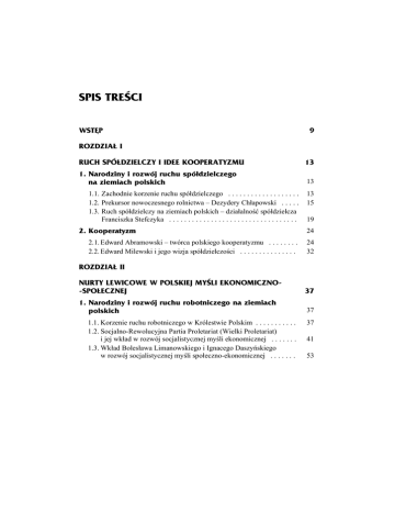 SPIS TREŚCI WSTĘP 9 ROZDZIAŁ I RUCH SPÓŁDZIELCZY I IDEE KOOPERATYZMU 13 1. Narodziny i rozwój ruchu spółdzielczego na ziemiach polskich 13 1.1. Zachodnie korzenie ruchu spółdzielczego . . . . . . . . . . . . . . . . . . . 1.2. Prekursor nowoczesnego rolnictwa – Dezydery Chłapowski . . . . . 1.3. Ruch spółdzielczy na ziemiach polskich – działalność spółdzielcza Franciszka Stefczyka . . . . . . . . . . . . . . . . . . . . . . . . . . . . . . . . . . 2. Kooperatyzm 2.1. Edward Abramowski – twórca polskiego kooperatyzmu . . . . . . . . 2.2. Edward Milewski i jego wizja spółdzielczości . . . . . . . . . . . . . . . 13 15 19 24 24 32 ROZDZIAŁ II NURTY LEWICOWE W POLSKIEJ MYŚLI EKONOMICZNO-SPOŁECZNEJ 37 1. Narodziny i rozwój ruchu robotniczego na ziemiach polskich 37 1.1. Korzenie ruchu robotniczego w Królestwie Polskim . . . . . . . . . . . 1.2. Socjalno-Rewolucyjna Partia Proletariat (Wielki Proletariat) i jej wkład w rozwój socjalistycznej myśli ekonomicznej . . . . . . . 1.3. Wkład Bolesława Limanowskiego i Ignacego Daszyńskiego w rozwój socjalistycznej myśli społeczno-ekonomicznej . . . . . . . 37 41 53 2. Zjednoczenie ruchu robotniczego (powstanie Polskiej Partii Socjalistycznej) i jego wpływ na rozwój socjalistycznych koncepcji ekonomicznych 2.1. Wpływ Róży Luksemburg na poglądy ekonomiczne polskich socjaldemokratów . . . . . . . . . . . . . . . . . . . . . . . . . . . . . . . . . . . . . 2.2. Narodowo-socjalistyczny nurt w ruchu robotniczym i jego dorobek ekonomiczny . . . . . . . . . . . . . . . . . . . . . . . . . . . . . . . . . . . . . . . . 58 58 65 ROZDZIAŁ III POLSKA KATOLICKA MYŚL SPOŁECZNA I EKONOMICZNA 71 1. Inspiracje teoretyczne katolicyzmu społecznego w Polsce 71 1.1. Wpływy zachodniej katolickiej myśli społecznej . . . . . . . . . . . . . . 1.2. Wpływy encykliki „Rerum Novarum” (15V1891) − o położeniu klasy robotniczej . . . . . . . . . . . . . . . . . . . . . . . . . . . . . . . . . . . . . 1.3. Początki katolickiej myśli społecznej w Polsce . . . . . . . . . . . . . . . 71 2. Myśl społeczna i ruch praktyczny katolicyzmu społecznego w Polsce 2.1. Koncepcja społecznej roli duchowieństwa w ujęciu ks. Kazimierza Zimmermanna . . . . . . . . . . . . . . . . . . . . . . . . . . . . . . . . . . . . . . . 2.2. Praca społeczno-gospodarcza ks. Piotra Wawrzyniaka . . . . . . . . . 2.3. Działalność charytatywna i wydawnicza . . . . . . . . . . . . . . . . . . . . 2.4. Postawa społeczna i działalność praktyczna ks. Stanisława Stojałowskiego . . . . . . . . . . . . . . . . . . . . . . . . . . . . . . . . . . . . . . 2.5. Wkład Edwarda Jaroszyńskiego w rozwój katolickiej myśli społeczno-ekonomicznej . . . . . . . . . . . . . . . . . . . . . . . . . . . . . . . . 2.6. Inicjatywy społeczne ks. Marcelego Godlewskiego . . . . . . . . . . . . 74 76 79 79 83 84 87 91 92 ROZDZIAŁ IV POLSKA MYŚL NACJONALISTYCZNA 96 1. Polski ruch nacjonalistyczny w układzie sił politycznych na przełomie XIX i XX wieku 96 2. Endecja – narodziny obozu 97 3. Poglądy społeczno-polityczne obozu narodowodemokratycznego 101 3.1. Odzyskanie niepodległości i strategia celu . . . . . . . . . . . . . . . . . . . 101 3.2. Nadrzędność interesów narodowych . . . . . . . . . . . . . . . . . . . . . . . 105 3.3. Kwestia żydowska i stosunek do Kościoła . . . . . . . . . . . . . . . . . . 107 4. Zręby myśli ekonomicznej w obozie narodowodemokratycznym 4.1. Główne postulaty ekonomiczne endecji . . . . . . . . . . . . . . . . . . . . 4.2. Miejsce nauki ekonomii i jej narodowy charakter . . . . . . . . . . . . . 4.3. Pozyskanie wszystkich klas społecznych jako cel strategiczny . . . 4.4. Warstwa chłopska jako fundament narodu polskiego . . . . . . . . . . 4.5. Kwestie agrarne . . . . . . . . . . . . . . . . . . . . . . . . . . . . . . . . . . . . . . . 4.6. Wspieranie postępu przemysłowego i interesu ekonomicznego społeczeństwa . . . . . . . . . . . . . . . . . . . . . . . . . . . . . . . . . . . . . . . . 4.7. Problem emigracji zarobkowej . . . . . . . . . . . . . . . . . . . . . . . . . . . 110 110 115 117 118 122 125 128 ZAKOŃCZENIE 131 BIBLIOGRAFIA 133