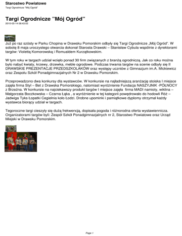 Starostwo Powiatowe Targi Ogrodnicze ”Mój Ogród” Targi Ogrodnicze ”Mój Ogród” 2010-05-14 08:43:02 Już po raz szósty w Parku Chopina w Drawsku Pomorskim odbyły się Targi Ogrodnicze „Mój Ogród”. W sobotę 8 maja uroczystego otwarcia dokonał Starosta Drawski – Stanisław Cybula wspólnie z dyrektorami targów: Violettą Komorowską i Romualdem Kurzątkowskim. W tym roku w targach udział wzięło ponad 30 firm związanych z branżą ogrodniczą. Jak co roku można było nabyć kwiaty, krzewy, drzewka, meble ogrodowe. Podczas trwania targów na scenie odbyły się II DRAWSKIE PREZENTACJE PRZEDSZKOLAKÓW oraz występy uczniów z Gimnazjum im.A. Mickiewicz oraz Zespołu Szkół Ponadgimnazjalnych Nr 2 w Drawsku Pomorskim. Przeprowadzono dwa konkursy dla wystawców. W konkursie na najładniejszą aranżację stoiska I miejsce zajęła firma Styl – Bet z Drawska Pomorskiego, natomiast wyróżnienie Fundacja NASZYJNIK -PÓŁNOCY z Brzeźna. W konkursie na najciekawszy produkt targów I miejsce zajęła firma MADI namioty, wiklina – Małgorzata Boczkowska – Czarna Łąka , a wyróżnienie w tej kategorii powędrowało do hodowli Róż – Jadwiga Tyks Łopatki Cegielnia koło Łodzi. Drobne upominki i pamiątkowe dyplomy otrzymał każdy wystawca biorący udział w targach. Tegoroczne targi cieszyły się dużą frekwencją, dopisała pogoda i różnorodna oferta wystawiennicza. Organizatorami targów byli: Zespół Szkół Ponadgimnazjalnych nr 2, Starostwo Powiatowe oraz Urząd Miejski w Drawsku Pomorskim. Page 1
