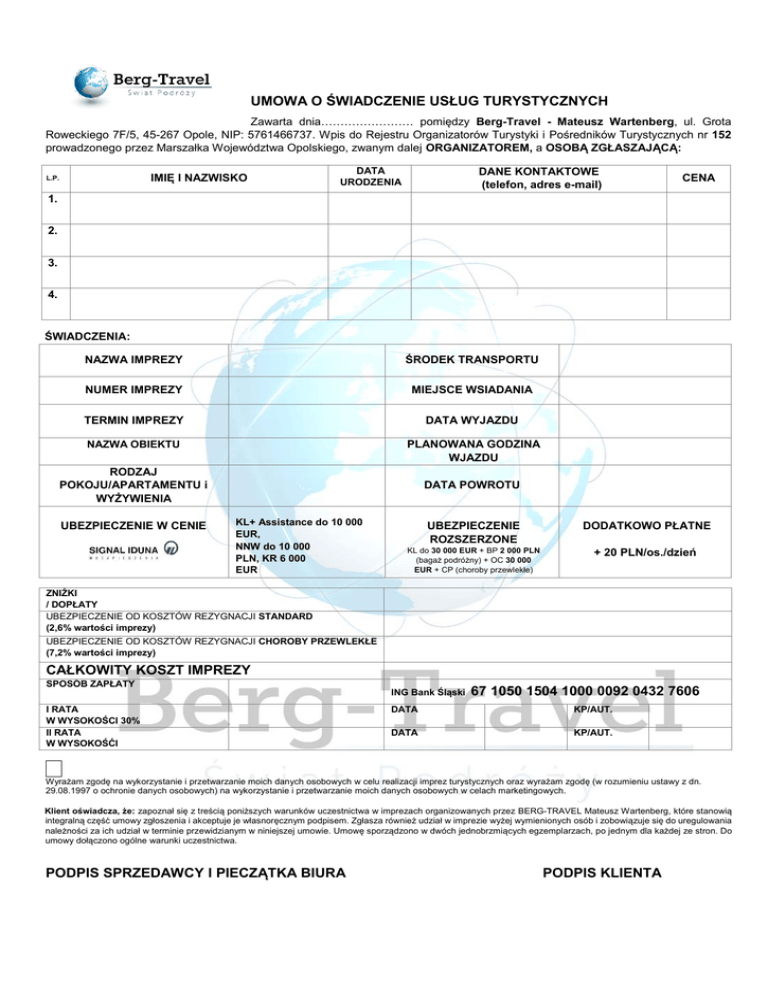 UMOWA O ŚWIADCZENIE USŁUG TURYSTYCZNYCH Zawarta dnia…………………… pomiędzy Berg-Travel - Mateusz Wartenberg, ul. Grota Roweckiego 7F/5, 45-267 Opole, NIP: 5761466737. Wpis do Rejestru Organizatorów Turystyki i Pośredników Turystycznych nr 152 prowadzonego przez Marszałka Województwa Opolskiego, zwanym dalej ORGANIZATOREM, a OSOBĄ ZGŁASZAJĄCĄ: IMIĘ I NAZWISKO L.P. DATA URODZENIA DANE KONTAKTOWE (telefon, adres e-mail) CENA 1. 2. 3. 4. ŚWIADCZENIA: NAZWA IMPREZY ŚRODEK TRANSPORTU NUMER IMPREZY MIEJSCE WSIADANIA TERMIN IMPREZY DATA WYJAZDU NAZWA OBIEKTU PLANOWANA GODZINA WJAZDU RODZAJ POKOJU/APARTAMENTU i WYŻYWIENIA UBEZPIECZENIE W CENIE DATA POWROTU KL+ Assistance do 10 000 EUR, NNW do 10 000 PLN, KR 6 000 EUR UBEZPIECZENIE ROZSZERZONE DODATKOWO PŁATNE KL do 30 000 EUR + BP 2 000 PLN (bagaż podróżny) + OC 30 000 EUR + CP (choroby przewlekłe) + 20 PLN/os./dzień ZNIŻKI / DOPŁATY UBEZPIECZENIE OD KOSZTÓW REZYGNACJI STANDARD (2,6% wartości imprezy) UBEZPIECZENIE OD KOSZTÓW REZYGNACJI CHOROBY PRZEWLEKŁE (7,2% wartości imprezy) CAŁKOWITY KOSZT IMPREZY SPOSÓB ZAPŁATY I RATA W WYSOKOŚCI 30% II RATA W WYSOKOŚĆI ING Bank Śląski 67 1050 1504 1000 0092 0432 7606 DATA KP/AUT. DATA KP/AUT. Wyrażam zgodę na wykorzystanie i przetwarzanie moich danych osobowych w celu realizacji imprez turystycznych oraz wyrażam zgodę (w rozumieniu ustawy z dn. 29.08.1997 o ochronie danych osobowych) na wykorzystanie i przetwarzanie moich danych osobowych w celach marketingowych. Klient oświadcza, że: zapoznał się z treścią poniższych warunków uczestnictwa w imprezach organizowanych przez BERG-TRAVEL Mateusz Wartenberg, które stanowią integralną część umowy zgłoszenia i akceptuje je własnoręcznym podpisem. Zgłasza również udział w imprezie wyżej wymienionych osób i zobowiązuje się do uregulowania należności za ich udział w terminie przewidzianym w niniejszej umowie. Umowę sporządzono w dwóch jednobrzmiących egzemplarzach, po jednym dla każdej ze stron. Do umowy dołączono ogólne warunki uczestnictwa. PODPIS SPRZEDAWCY I PIECZĄTKA BIURA PODPIS KLIENTA na ten temat. W takim przypadku KLIENT powinien niezwłocznie poinformować ORGANIZATORA czy: - przyjmuje proponowane w imprezie zmiany albo - odstępuje od umowy z zachowaniem prawa do zwrotu wpłaconych kwot pieniężnych, bez ponoszenia kosztów z tym związanych, żąda obniżenia ceny w przypadku zubożenia świadczeń umownych lub zmniejszenia się ich liczby. W wyjątkowych przypadkach ORGANIZATOR zastrzega sobie prawo zmiany programu i świadczeń w trakcie imprezy gdy są one niezbędne do realizacji programu, jednak zawarte w umowie świadczenia mogą być zastąpione jedynie świadczeniami o tym samym lub wyższym standardzie i w tej samej ilości. Jeżeli zmiana programu lub świadczeń nastąpi podczas trwania imprezy i wpływa to na zubożenie świadczeń umownych lub zmniejszenie liczby tych świadczeń, KLIENTOWI przysługuje prawo żądania obniżenia ceny imprezy. ORGANIZATOR zastrzega sobie prawo do zmiany ceny imprezy z zastrzeżeniem, że może ono nastąpić nie później WARUNKI UCZESTNI CTWAw niż 21 dni przed datą rozpoczęcia imprezy. Zmianę cen imprezach organizowanych przez Berg-Travel uzasadniają: wzrost kursów walut mających wpływ na Obowiązują od 16.06.2016r. kalkulację ceny, wzrost cen paliwa, podatków, opłat urzędowych oraz opłat należnych za usługi lotniskowe i 1. Zawarcie umowy Niniejsze Warunki Uczestnictwa stanowią ogólne warunki klimatyczne. umowne stosowane w umowach o Świadczenie Usług Turystycznych. ORGANIZATORA, Berg-Travel Mateusz 4. Odwołanie imprezy przez ORGANIZATORA Wartenberg, ul. Słowackiego 14/5, 46-300 Olesno, NIP: ORGANIZATOR zastrzega sobie prawo odwołania imprezy w 5761466737, posiadającego wpis do rejestru Organizatorów terminie nie krótszym niż 14 dni przed jej rozpoczęciem w Turystyki i Pośredników Turystycznych nr 152, prowadzonego przypadku braku odpowiedniej ilości uczestników imprezy. przez Marszałka Województwa Opolskiego. Minimalna ilość uczestników (w przypadku imprez KLIENT podpisując umowę z ORGANIZATOREM, autokarowych) do realizacji imprezy podana jest osobno przy potwierdza, że zapoznał się i akceptuje niniejsze warunki każdej ofercie. Jeśli takiej informacji nie ma, uznaje się, iż uczestnictwa, stanowiące integralna część Umowy o minimalną ilością osób niezbędną do realizacji imprezy jest 30 Świadczenie Usług Turystycznych. Umowa zostaje zawarta w uczestników. W przypadku odwołania imprezy z powodu momencie jej podpisania przez KLIENTA i ORGANIZATORA, braku odpowiedniej ilości uczestników, biuro podróży ma przy jednoczesnym uiszczeniu przez KLIENTA umówionej obowiązek pisemnie powiadomić KLIENTA o tym fakcie zaliczki, bądź pełnej należności za imprezę. najpóźniej na 14 dni przed planowanym rozpoczęciem KLIENT podpisuje umowę w imieniu własnym i osób trzecich, imprezy. których dane zawarte są w umowie jako dane uczestników Z powodu siły wyższej impreza może być odwołana w każdym imprezy. czasie, o czym ORGANIZATOR zobowiązany jest KLIENT przed podpisaniem umowy ma obowiązek sprawdzić powiadomić KLIENTA pisemnie niezwłocznie po podjęciu czy dane w umowie są zgodne z wcześniej dokonaną takiej decyzji. Odwołanie imprezy zobowiązuje rezerwacją i czy dane jego oraz pozostałych uczestników ORGANIZATORA do przedstawienia KLIENTOWI oferty podane są prawidłowo. zastępczej lub zwrotu uiszczonych przez KLIENTA kwot. KLIENT podpisujący umowę (wymieniony jako pierwszy w umowie) zobowiązany jest dopilnować aby pełna należność 5. Rezygnacja KLIENTA z udziału w imprezie za imprezę uiszczona była w wymaganym terminie, oraz Rezygnacja z udziału w imprezie następuje z datą doręczenia odpowiedzialny jest za informowanie pozostałych osób o do ORGANIZATORA pisma zawierającego oświadczenie o szczegółach dotyczących imprezy