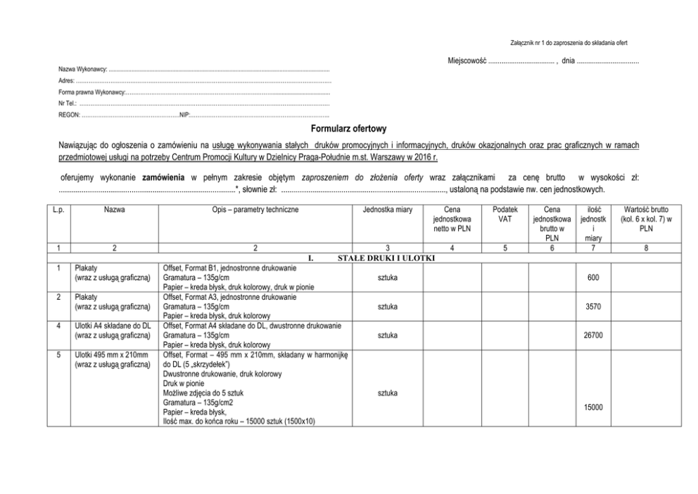 Załącznik nr 1 do zaproszenia do składania ofert Miejscowość ................................... , dnia ................................. Nazwa Wykonawcy: .................................................................................................................................................. Adres: …………………………………………………………………………………………………………………………… Forma prawna Wykonawcy:………………………………………………………………………...................................... Nr Tel.: ………………………………………………………………………………………………………………………… REGON: ………………………………………………NIP:………………………………………………………………….. Formularz ofertowy Nawiązując do ogłoszenia o zamówieniu na usługę wykonywania stałych druków promocyjnych i informacyjnych, druków okazjonalnych oraz prac graficznych w ramach przedmiotowej usługi na potrzeby Centrum Promocji Kultury w Dzielnicy Praga-Południe m.st. Warszawy w 2016 r. oferujemy wykonanie zamówienia w pełnym zakresie objętym zaproszeniem do złożenia oferty wraz załącznikami za cenę brutto w wysokości zł: .....................................................................................*, słownie zł: ..............................................................................., ustaloną na podstawie nw. cen jednostkowych. L.p. Nazwa Opis – parametry techniczne 1 2 2 Jednostka miary I. 1 2 4 5 Plakaty (wraz z usługą graficzną) Plakaty (wraz z usługą graficzną) Ulotki A4 składane do DL (wraz z usługą graficzną) Ulotki 495 mm x 210mm (wraz z usługą graficzną) Cena jednostkowa netto w PLN 3 STAŁE DRUKI I ULOTKI Offset, Format B1, jednostronne drukowanie Gramatura – 135g/cm Papier – kreda błysk, druk kolorowy, druk w pionie Offset, Format A3, jednostronne drukowanie Gramatura – 135g/cm Papier – kreda błysk, druk kolorowy Offset, Format A4 składane do DL, dwustronne drukowanie Gramatura – 135g/cm Papier – kreda błysk, druk kolorowy Offset, Format – 495 mm x 210mm, składany w harmonijkę do DL (5 „skrzydełek”) Dwustronne drukowanie, druk kolorowy Druk w pionie Możliwe zdjęcia do 5 sztuk Gramatura – 135g/cm2 Papier – kreda błysk, Ilość max. do końca roku – 15000 sztuk (1500x10) 4 Podatek VAT 5 Cena jednostkowa brutto w PLN 6 ilość jednostk i miary 7 sztuka 600 sztuka 3570 sztuka 26700 sztuka 15000 Wartość brutto (kol. 6 x kol. 7) w PLN 8 6 Zaproszenia (wraz z usługą graficzną) 7 Plakaty (wraz z usługą graficzną) 8 Katalogi (wraz z usługą graficzną) II. DRUKI OKAZJONALNE Offset, Format – DL, Dwustronnie drukowanie, kolor Jednorazowa ilość Gramatura – 200g/cm2 – 200 sztuk Papier – kreda błysk Offset, Format B1, jednostronne drukowanie Jednorazowa ilość Gramatura – 135g/cm – 50 sztuk Papier – kreda błysk, druk kolorowy, druk w pionie Offset, Format – 20 cm x 20 cm, Dwustronne drukowanie, Jednorazowa ilość kolor – 100 sztuk Gramatura – 250g/cm2 Okładka foliowana Papier – kreda błysk Ilość stron – 12 1 1 1 Razem cena brutto * - cena oferty winna być wyrażona w złotych polskich (PLN) z dokładnością do dwóch miejsc po przecinku. 1. oświadczamy, że: a. przedmiot zamówienia będziemy wykonywać i dostarczać w ciągu 5 dni kalendarzowych, licząc od dnia końcowego zaakceptowania/złożenia zamówienia przez Zamawiającego; b. cena oferty zawiera wszelkie koszty związane z realizacją przedmiotu zamówienia, w tym transport; c. uważamy się za związanych niniejszą ofertą przez okres 30 dni; d. zapoznaliśmy się z dokumentacją postępowania tj. zaproszenia do składania ofert oraz zdobyliśmy wszelkie informacje konieczne do przygotowania oferty; e. do dokumentacji nie wnosimy żadnych zastrzeżeń; f. w przypadku wyboru naszej oferty zobowiązujemy się do zrealizowania przedmiotu zamówienia w sposób zgodny z warunkami określonymi w zaproszeniu do złożenia oferty i niniejszym formularzu ofertowym; g. w przypadku wyboru naszej oferty zobowiązujemy się do zawarcia umowy w miejscu i terminie określonym przez Zamawiającego; 2. Oferta wraz z załącznikami została złożona na ……… kolejno ponumerowanych stronach. 3. Osobą uprawnioną do kontaktów z Zamawiającym w sprawie niniejszego postępowania jest: …………………………………………….. (imię i nazwisko, stanowisko służbowe) tel. …………………………… 4. Adres e-mail Wykonawcy, na który Zamawiający przekazywać może oświadczenia, wnioski, zawiadomienia, informacje …………………………………………………………….. 5. Załącznikami do niniejszej oferty są: a) .................................................................................................................................................................. b) .................................................................................................................................................................. c) .................................................................................................................................................................. (wpisać nazwy odpowiednich załączników – jeśli dotyczy) ……............................................................................. podpis osób(y) uprawnionych(ej) itp.: