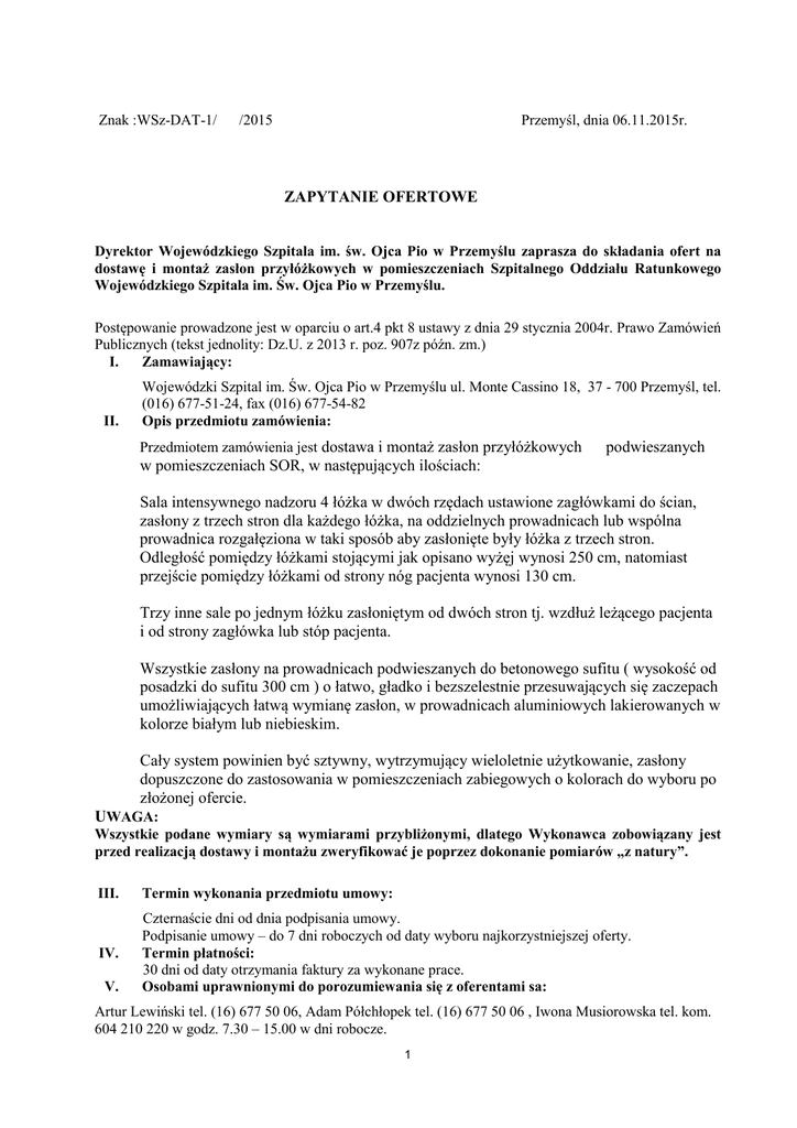 Znak :WSz-DAT-1/ /2015 Przemyśl, dnia 06.11.2015r. ZAPYTANIE OFERTOWE Dyrektor Wojewódzkiego Szpitala im. św. Ojca Pio w Przemyślu zaprasza do składania ofert na dostawę i montaż zasłon przyłóżkowych w pomieszczeniach Szpitalnego Oddziału Ratunkowego Wojewódzkiego Szpitala im. Św. Ojca Pio w Przemyślu. Postępowanie prowadzone jest w oparciu o art.4 pkt 8 ustawy z dnia 29 stycznia 2004r. Prawo Zamówień Publicznych (tekst jednolity: Dz.U. z 2013 r. poz. 907z późn. zm.) I. Zamawiający: II. Wojewódzki Szpital im. Św. Ojca Pio w Przemyślu ul. Monte Cassino 18, 37 - 700 Przemyśl, tel. (016) 677-51-24, fax (016) 677-54-82 Opis przedmiotu zamówienia: Przedmiotem zamówienia jest dostawa i montaż zasłon przyłóżkowych podwieszanych w pomieszczeniach SOR, w następujących ilościach: Sala intensywnego nadzoru 4 łóżka w dwóch rzędach ustawione zagłówkami do ścian, zasłony z trzech stron dla każdego łóżka, na oddzielnych prowadnicach lub wspólna prowadnica rozgałęziona w taki sposób aby zasłonięte były łóżka z trzech stron. Odległość pomiędzy łóżkami stojącymi jak opisano wyżęj wynosi 250 cm, natomiast przejście pomiędzy łóżkami od strony nóg pacjenta wynosi 130 cm. Trzy inne sale po jednym łóżku zasłoniętym od dwóch stron tj. wzdłuż leżącego pacjenta i od strony zagłówka lub stóp pacjenta. Wszystkie zasłony na prowadnicach podwieszanych do betonowego sufitu ( wysokość od posadzki do sufitu 300 cm ) o łatwo, gładko i bezszelestnie przesuwających się zaczepach umożliwiających łatwą wymianę zasłon, w prowadnicach aluminiowych lakierowanych w kolorze białym lub niebieskim. Cały system powinien być sztywny, wytrzymujący wieloletnie użytkowanie, zasłony dopuszczone do zastosowania w pomieszczeniach zabiegowych o kolorach do wyboru po złożonej ofercie. UWAGA: Wszystkie podane wymiary są wymiarami przybliżonymi, dlatego Wykonawca zobowiązany jest przed realizacją dostawy i montażu zweryfikować je poprzez dokonanie pomiarów „z natury”. III. Termin wykonania przedmiotu umowy: IV. Czternaście dni od dnia podpisania umowy. Podpisanie umowy – do 7 dni roboczych od daty wyboru najkorzystniejszej oferty. Termin płatności: 30 dni od daty otrzymania faktury za wykonane prace. Osobami uprawnionymi do porozumiewania się z oferentami sa: V. Artur Lewiński tel. (16) 677 50 06, Adam Półchłopek tel. (16) 677 50 06 , Iwona Musiorowska tel. kom. 604 210 220 w godz. 7.30 – 15.00 w dni robocze. 1 VI. Miejsce składania ofert Ofertę należy złożyć w siedzibie Zamawiającego: Wojewódzki Szpital im. Św. Ojca Pio w Przemyślu, ul. Monte Cassino 18 (w Biurze Podawczym Blok „D” I – piętro pok. Nr 217) nie później niż do dnia 17.11.2015r. do godz. 9.45. Ofertę cenową należy złożyć w zamkniętej kopercie i oznaczyć: „Oferta na dostawę i montaż zasłon przyłóżkowych w pomieszczeniach Szpitalnego Oddziału Ratunkowego – dla Przewodniczącego Stałej Komisji ds. Realizacji Zakupów - nie otwierać do dnia 17.11.2015r. godz.1000 ”. VII. Kryterium wyboru: Przy wyborze ofert Zamawiający będzie się kierował następującymi kryteriami: kryterium: cena 100% Sposób oceny ofert: Cn Pc = ------- * 100pkt Co gdzie : Pc – punkty za cenę brutto (max 100pkt) Cn - Cena brutto najniższa z ofert nie odrzuconych, Co – Cena brutto oferty poddanej ocenie. VIII. Koszt wykonania należy przedstawić na formularzu ofertowym stanowiącym załącznik nr 1 do zapytania ofertowego. Cena brutto musi obejmować wszelkie koszty związane z wykonaniem przedmiotu zamówienia przez Oferenta. Do formularza ofertowego należy dołączyć, opis parametrów technicznych, o których mowa w rozdziale II . VI. Informacje o formalnościach: 1. Otwarcie ofert nastąpi w dniu 17.11.2015.r. o godz. 11.00 w siedzibie Zamawiającego. 2. Niezwłocznie po wyborze najkorzystniejszej oferty, Zamawiający zawiadomi o wynikach postępowania wszystkich wykonawców, którzy ubiegali się o udzielenie zamówienia, poprzez opublikowanie wyników na stronie internetowej szpitala. 3. Jeżeli Wykonawca, którego oferta została wybrana uchyli się od zawarcia umowy, Zamawiający wybierze kolejną, najkorzystniejszą spośród złożonych ofert. 4. Zamawiający zastrzega sobie możliwość odstąpienia od postępowania ofertowego. 2