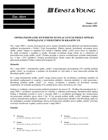 Tax Alert Numer 143 Kwiecień 2004 OPODATKOWANIE DYWIDEND WYPŁACANYCH PRZEZ SPÓŁKI POWIĄZANE Z NIEKTÓRYCH KRAJÓW UE Od 1 maja 2004 r. zaczną obowiązywać nowe zasady opodatkowania płatności dywidend pomiędzy spółkami powiązanymi z Polski i Unii Europejskiej. Między innymi, dywidendy otrzymane przez spółki „matki” mające co najmniej 25% udział w kapitale spółki „córki” przez okres co najmniej 2 lat, będą zwolnione z podatku u źródła. Warunki zwolnienia mogą różnić się w zależności od prawodawstwa kraju spółki „córki” (Polska przyjęła w prawie wewnętrznym warunki maksymalne, tzn. 2 lata i 25% udziałów). Poniżej przedstawiamy skutki zmian dla opodatkowania dywidend płaconych pomiędzy Polską i niektórymi krajami UE. Holandia Do 1 maja 2004 r. holenderskie spółki „matki” rozporządzające przynajmniej 25% udziału polskiej spółki „córki” są zwolnione z podatku od dywidend (w tym także w razie umorzenia udziału lub likwidacji spółki „córki”). Po 1 maja holenderskie spółki „matki” mogą utracić prawo do zwolnienia z polskiego podatku od dywidend wypłacanych w związku z umorzeniem udziałów, zbyciem udziałów w celu umorzenia i likwidacją polskiej spółki „córki”. Co więcej, zwolnienie z podatku od dywidend zostanie uzależnione od warunku posiadania 25% udziału przez okres nie krótszy niż 2 lata. Zmiany te wynikają z dostosowania polskich przepisów do prawa UE. Według obowiązujących do 1 maja 2004 r. przepisów przejściowych do traktatu o unikaniu podwójnego opodatkowania między Polską a Holandią (wszedł w życie 1 stycznia 2004 r.), zwolnienie przysługuje bez konieczności utrzymywania udziałów przez okres 2 lat. W tej sytuacji polskie spółki „córki” planujące wypłatę zysków holenderskim spółkom „matkom” w związku umorzeniem udziałów lub likwidacją, bądź też nie spełniające warunku minimalnego okresu utrzymywania udziałów przez spółkę „matkę” powinny rozważyć możliwość wypłaty zysków przed 1 maja 2004 r. Irlandia § § § Warszawa tel: 022 557 70 00, fax: 022 557 70 01 Kraków tel: 012 431 12 20, fax: 012 431 12 51 Katowice tel: 032 760 77 00, fax: 032 760 77 10 § § Wrocław tel: 071 375 10 00, fax: 071 375 10 10 Poznań tel: 061 856 29 00, fax: 061 856 30 00 Alert Nr 143 Polska co do zasady stosuje metodę kredytu podatkowego jako metodę unikania podwójnego opodatkowania dochodów z dywidend. Jednakże w niektórych traktatach o unikaniu podwójnego opodatkowania Polska zobowiązała się do stosowania metody zwolnienia. Dotyczy to np. Irlandii. Z uwagi na niższą stawkę podatku dochodowego od spółek (12,5%) i brak podatku u źródła, dochód z udziału w zysku spółki irlandzkiej może być w niektórych wypadkach opodatkowany korzystniej niż dochód uzyskany od polskiej spółki „córki”. W przypadku wypłaty dywidend do spółek irlandzkich traktat o unikaniu podwójnego opodatkowania zawarty między Polską i Irlandią daje prawo do zwolnienia z podatku od dywidend w przypadku posiadania 25% udziału w spółce „córce”, bez względu na okres posiadania udziału i źródło finansowania (powiązanie wypłat z ewentualnym umorzeniem udziałów lub likwidacją spółki wypłacającej). Zasada ta będzie obowiązywać także po 1 maja 2004 r. Przepisy polskiej ustawy o podatku dochodowym od osób prawnych, przewidujące surowsze warunki skorzystania ze zwolnienia (tj. utrzymywanie udziałów przez okres co najmniej 2 lat i źródło finansowania inne niż umorzenie udziałów bądź likwidacja polskiej spółki „córki”) nie powinny więc mieć zastosowania. Dania Traktat o unikaniu podwójnego opodatkowania zawarty między Polską i Danią przyznaje zwolnienie z podatku u źródła na dywidendy spółkom „matkom” pod warunkiem posiadania 25% udziału w kapitale spółki wypłacającej dywidendę przez okres nie krótszy niż 1 rok i zadeklarowania dywidend w tym okresie. Zwolnienie obejmuje również dywidendy wypłacane w związku z umorzeniem udziałów, zbyciem udziałów w celu umorzenia i likwidacją. Zasada ta będzie obowiązywać nadal po 1 maja 2004 r. w stosunku do wypłat dywidend z Polski do duńskich spółek „matek”, mimo że przepisy polskie przewidują surowsze warunki. W przypadku pytań prosimy o kontakt z menadżerem z Działu Podatkowego Ernst & Young obsługującym Państwa firmę. Informacje zawarte w Alertach Ernst & Young mają na celu jedynie zasygnalizowanie określonych kwestii i/lub zmian w legislacji. Przed podjęciem konkretnych decyzji zalecamy skonsultowanie ich z Państwa doradcą podatkowym. 2