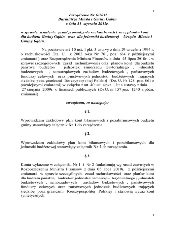 1 Zarządzenie Nr 6/2012 Burmistrza Miasta i Gminy Gąbin z dnia 31 stycznia 2013r. w sprawie: ustalenia zasad prowadzenia rachunkowości oraz planów kont dla budżetu Gminy Gąbin oraz dla jednostki budżetowej - Urzędu Miasta i Gminy Gąbin. Na podstawie art. 10 ust. 1 pkt. 3 ustawy z dnia 29 września 1994 r. o rachunkowości /Dz. U. z 2002 roku Nr 76 , poz. 694 z późniejszymi zmianami ) oraz Rozporządzenia Ministra Finansów z dnia 05 lipca 2010r. . w sprawie szczegółowych zasad rachunkowości oraz planów kont dla budżetu państwa, budżetów jednostek samorządu terytorialnego , jednostek budżetowych , samorządowych zakładów budżetowych , państwowych funduszy celowych oraz państwowych jednostek budżetowych mających siedzibę poza granicami Rzeczypospolitej Polskiej (Dz. U. Nr 128 poz. 861 z późniejszymi zmianami) w związku z art. 40 ust. 4 pkt. 1 lit a ustawy z dnia 27 sierpnia 2009r. o finansach publicznych (Dz.U. nr 157 poz. 1240 z późn. zmianami) zarządzam, co następuje: § 1. Wprowadzam zakładowy plan kont bilansowych i pozabilansowych budżetu gminy stanowiący załącznik Nr 1 do zarządzenia. § 2. Wprowadzam zakładowy plan kont bilansowych i pozabilansowych dla jednostki budżetowej stanowiący załącznik Nr 2 do zarządzenia. § 3. Konta wykazane w załączniku Nr 1 i Nr 2 funkcjonują wg zasad zawartych w Rozporządzeniu Ministra Finansów z dnia 05 lipca 2010r. z późniejszymi zmianami w sprawie szczególnych zasad rachunkowości oraz planów kont dla budżetu państwa, budżetów jednostek samorządu terytorialnego , jednostek budżetowych , samorządowych zakładów budżetowych , państwowych funduszy celowych oraz państwowych jednostek budżetowych mających siedzibę poza granicami Rzeczypospolitej Polskiej i stanowią wykaz kont syntetycznych. 1 2 § 4. 1. Wykaz urządzeń analitycznych do kont syntetycznych dla budżetu Gminy Gąbin stanowi załącznik Nr 3 do zarządzenia. 2. Wykaz urządzeń analitycznych do kont syntetycznych jednostki budżetowej stanowi załącznik Nr 4 do zarządzenia. 3. Zasady rachunkowości dla budżetu Gminy i jednostki – Urzędu Miasta i Gminy Gąbin stanowi załącznik Nr 5 do zarządzenia . 4. Zasady rachunkowości dla prowadzenia ewidencji podatków i opłat stanowi załącznik Nr 6 do zarządzenia. § 5. 1. Wykaz kont syntetycznych może być uzupełniany w miarę potrzeby o właściwe konta planu kont dla budżetu gminy i jednostki budżetowej. 2. Dokonuje się podziału kont syntetycznych: 080, 135, ,139, 201, 225, 229, 240, na tzw. subkonta 3. Subkonto do konta 080 będzie prowadzone na poszczególne rodzaje inwestycji i wprowadzane będzie z chwilą rozpoczęcia nowych inwestycji. Symbol subkont będzie brzmiał: 080/ jednocyfrowe oznaczenie. 4. Subkonta do kont 139 i 240 będą wprowadzane dodatkowo w przypadku potrzeby ewidencji operacji dotyczących środków pieniężnych na wyodrębnionych rachunkach bankowych z tytułu sum depozytowych. Symbol konta będzie brzmiał: -139 – oznaczenie cyfrowe, - 240 – oznaczenie cyfrowe § 6. Utrzymuje się zasadę pełnego umorzenia środków trwałych zaliczanych do wyposażenia poprzez wpisanie w koszty w dniu zapłaty. Ewidencja stanu środków trwałych /wyposażenia/ prowadzona jest w księgach inwentarzowych. § 7. Środki trwałe stanowiące własność jednostki samorządu terytorialnego otrzymane nieodpłatnie na podstawie decyzji właściwego organu, mogą być wyrażone w wartości określonej w tej decyzji. Wartość początkowa środków trwałych i dotychczas dokonane odpisy umorzeniowe podlegają aktualizacji wyceny zgodnie z zasadami określonymi w odrębnych przepisach ,a wyniki aktualizacji są odnoszone na fundusz środków trwałych. 2 3 § 8. Zakładowy plan kont ma na celu: a/ właściwe, rzetelne ewidencjonowanie operacji finansowych i gospodarczych, b/ w sposób jasny przedstawić stan wykonania budżetu i sytuację gospodarczą jednostki, c/ zapewnienie możliwości sporządzenia sprawozdawczości zgodnie z obowiązującymi przepisami. § 9. Zasady rachunkowości dla budżetu i jednostki według których należy prowadzić księgi rachunkowe określa załącznik Nr 5 do niniejszego zarządzenia. § 11. Zarządzenie wchodzi w życie z dniem podjęcia z mocą obowiązującą od 01 stycznia 2013 roku. § 12. Traci moc Zarządzenie wewnętrzne Nr 24/2009 Burmistrz Miasta i Gminy Gąbin z dnia 29 stycznia 2009 r. w sprawie ustalenia zasad prowadzenia rachunkowości oraz planów kont dla budżetu Gminy Gąbin oraz dla jednostki budżetowej – Urzędu Miasta i Gminy Gąbin. 3 4 Załącznik Nr 1 do Zarządzenia Burmistrza Miasta i Gminy Gąbin Nr 6/2013 z dnia 31 stycznia 2013r. Zakładowy plan kont dla budżetu Gminy Gąbin Wykaz obowiązujących kont: I Konta bilansowe 133 – Rachunek budżetu 134 – Kredyty bankowe 140 –Środki pieniężne w drodze 222 – Rozliczenie dochodów budżetowych 223 – Rozliczenie wydatków budżetowych 224 – Rozrachunki budżetu 240 – Pozostałe rozrachunki 250 _ Należności finansowe 260 – Zobowiązania finansowe 901 – Dochody budżetu 902 – Wydatki budżetu 909 – Rozliczenia międzyokresowe 960 – Skumulowane wyniki budżetu 961 – Wynik wykonania budżetu 962 – Wynik na pozostałych operacjach II Konta pozabilansowe 991 – Planowane dochody budżetu 992 – Planowane wydatki budżetu 993 – Rozliczenia z innymi budżetami 4 5 Konto 133 – „Rachunek budżetu” Konto 133 służy do ewidencji operacji pieniężnych dokonywanych na bankowych rachunkach budżetu. Ewidencja prowadzona jest wyłącznie na podstawie wyciągów bankowych i dołączonych do nich dokumentów. Na stronie Wn konta ujmuje się wpływy środków pieniężnych na rachunek budżetu gminy z tytułu dochodów budżetu, przychodów oraz operacji wewnętrznych. Po stronie Ma konta 133 ujmuje się wypłaty z rachunku budżetu gminy środków na wydatki budżetowe realizowane przez jednostki, wydatki objęte plan