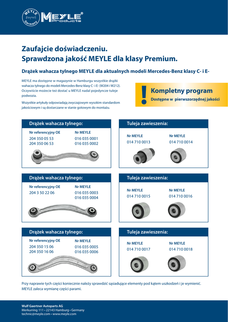 Zaufajcie doświadczeniu. Sprawdzona jakość MEYLE dla klasy Premium. Drążek wahacza tylnego MEYLE dla aktualnych modeli Mercedes-Benz klasy C- i EMEYLE ma dostępne w magazynie w Hamburgu wszystkie drążki wahacza tylnego do modeli Mercedes-Benz klasy C- i E- (W204 i W212). Oczywiście możecie też dostać u MEYLE nadal pojedyncze tuleje podwozia. Wszystkie artykuły odpowiadają zwyczajowym wysokim standardom jakościowym i są dostarczane w stanie gotowym do montażu. Drążek wahacza tylnego: Nr referencyjny OE Nr MEYLE 204 350 05 53 204 350 06 53 016 035 0001 016 035 0002 Drążek wahacza tylnego: Nr referencyjny OE Nr MEYLE 204 3 50 22 06 016 035 0003 016 035 0004 Drążek wahacza tylnego: Nr referencyjny OE Nr MEYLE 204 350 15 06 204 350 16 06 016 035 0005 016 035 0006 ! Kompletny program Dostępne w pierwszorzędnej jakości Tuleja zawieszenia: Nr MEYLE Nr MEYLE 014 710 0013 014 710 0014 Tuleja zawieszenia: Nr MEYLE Nr MEYLE 014 710 0015 014 710 0016 Tuleja zawieszenia: Nr MEYLE Nr MEYLE 014 710 0017 014 710 0018 Przy naprawie tych części koniecznie należy sprawdzić sąsiadujące elementy pod kątem uszkodzeń i je wymienić. MEYLE zaleca wymianę części parami. Wulf Gaertner Autoparts AG Merkurring 111 • 22143 Hamburg • Germany [email protected] • www.meyle.com