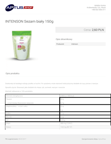 Apteka Avena Królewiecka 12c, Płock +48 502 666 011 INTENSON Sezam biały 150g Cena: 2,60 PLN Opis słownikowy Producent Intenson Opis produktu Doskonały do każdego rodzaju posiłku w kuchni. Po uprażeniu może stanowić kolorystyczny dodatek do zup, potraw z warzyw. Sposób użycia: Stosować jako dodatek do mięsa, ryb, surówek, warzyw i owoców Wartość odżywcza w 100 g produktu Wartość energetyczna 2366 kJ / 565 kcal Tłuszcz 48 g – w tym kwasy tłuszczowe nasycone 6,7 g Węglowodany – w tym cukry 26 g 0g Białko 17 g Błonnik 14 g Sól 0,03 g Wapń 989 mg (124%*) Żelazo 14,8 mg (82 %*) Plik wygenerowano: 09-03-2017 Oprogramowanie sklepu: AptusShop Apteka Avena Królewiecka 12c, Płock +48 502 666 011 Witamina B1 (Tiamina) 0,8 mg (54 %*) *Referencyjna wartość spożycia dla przeciętnej osoby dorosłej (8400 kJ / 2000 kcal) Składniki: 100% sezam biały Wyprodukowano w zakładzie, w którym konfekcjonowane są orzechy Producent: INTENSON EUROPE SP. Z O.O. Całowanie 94 G 05-480 Karczew Najlepiej spożyć przed: Numer partii / Data przydatności do spożycia / Kraj pochodzenia znajdują się na opakowaniu. Przechowywać w zamkniętym opakowaniu, w suchym miejscu Dostępne opakowania: 150 g Plik wygenerowano: 09-03-2017 Powered by TCPDF (www.tcpdf.org) Oprogramowanie sklepu: AptusShop