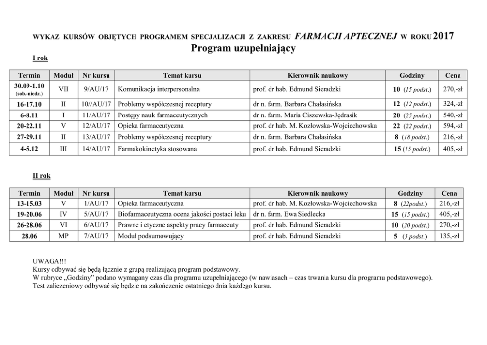 WYKAZ KURSÓW OBJĘTYCH PROGRAMEM SPECJALIZACJI Z ZAKRESU FARMACJI APTECZNEJ W ROKU 2017 Program uzupełniający I rok Termin Moduł Nr kursu Temat kursu 30.09-1.10 VII 9/AU/17 Komunikacja interpersonalna (sob.-niedz.) Kierownik naukowy Godziny Cena prof. dr hab. Edmund Sieradzki 10 (15 podst.) 270,-zł dr n. farm. Barbara Chałasińska 12 (12 podst.) 324,-zł 16-17.10 II 10//AU/17 Problemy współczesnej receptury 6-8.11 I 11/AU/17 Postępy nauk farmaceutycznych dr n. farm. Maria Ciszewska-Jędrasik 20 (25 podst.) 540,-zł 20-22.11 V 12/AU/17 Opieka farmaceutyczna prof. dr hab. M. Kozłowska-Wojciechowska 22 (22 podst.) 594,-zł 27-29.11 II 13/AU/17 Problemy współczesnej receptury dr n. farm. Barbara Chałasińska 8 (18 podst.) 216,-zł 4-5.12 III 14/AU/17 Farmakokinetyka stosowana prof. dr hab. Edmund Sieradzki 15 (15 podst.) 405,-zł 13-15.03 Moduł V Nr kursu 1/AU/17 Temat kursu Opieka farmaceutyczna Kierownik naukowy prof. dr hab. M. Kozłowska-Wojciechowska 19-20.06 IV 5/AU/17 Biofarmaceutyczna ocena jakości postaci leku 26-28.06 VI 6/AU/17 28.06 MP 7/AU/17 II rok Termin Godziny 8 (22podst.) Cena 216,-zł dr n. farm. Ewa Siedlecka 15 (15 podst.) 405,-zł Prawne i etyczne aspekty pracy farmaceuty prof. dr hab. Edmund Sieradzki 10 (20 podst.) 270,-zł Moduł podsumowujący prof. dr hab. Edmund Sieradzki 5 (5 podst.) 135,-zł UWAGA!!! Kursy odbywać się będą łącznie z grupą realizującą program podstawowy. W rubryce „Godziny” podano wymagany czas dla programu uzupełniającego (w nawiasach – czas trwania kursu dla programu podstawowego). Test zaliczeniowy odbywać się będzie na zakończenie ostatniego dnia każdego kursu.