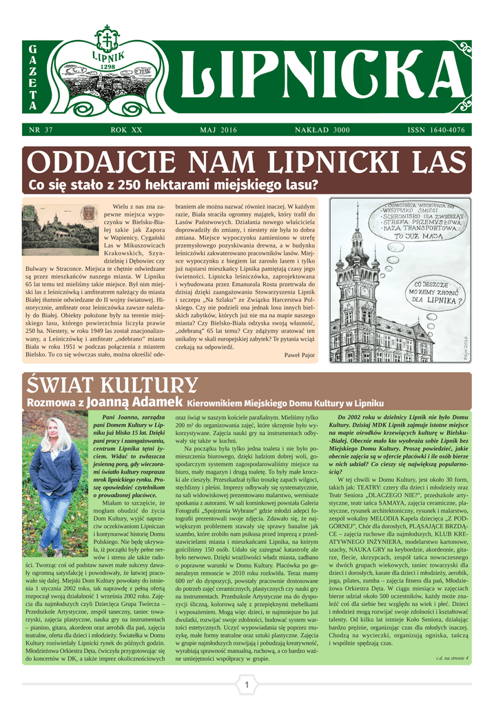 NR 37 ROK XX MAJ 2016 NAKŁAD 3000 ISSN 1640-4076 ODDaJCiE naM LipniCki LaS Co się stało z 250 hektarami miejskiego lasu? Wielu z nas zna zapewne miejsca wypoczynku w Bielsku-Białej takie jak Zapora w Wapienicy, Cygański Las w Mikuszowicach Krakowskich, Szyndzielnię i Dębowiec czy Bulwary w Straconce. Miejsca te chętnie odwiedzane są przez mieszkańców naszego miasta. W Lipniku 65 lat temu też mieliśmy takie miejsce. Był nim miejski las z leśniczówką i amfiteatrem należący do miasta Białej tłumnie odwiedzane do II wojny światowej. Historycznie, amfiteatr oraz leśniczówka zawsze należały do Białej. Obiekty położone były na terenie miejskiego lasu, którego powierzchnia liczyła prawie 250 ha. Niestety, w roku 1949 las został znacjonalizowany, a Leśniczówkę i amfiteatr „odebrano” miastu Biała w roku 1951 w podczas połączenia z miastem Bielsko. To co się wówczas stało, można określić ode- braniem ale można nazwać również inaczej. W każdym razie, Biała straciła ogromny majątek, który trafił do Lasów Państwowych. Działania nowego właściciela doprowadziły do zmiany, i niestety nie była to dobra zmiana. Miejsce wypoczynku zamieniono w strefę przemysłowego pozyskiwania drewna, a w budynku leśniczówki zakwaterowano pracowników lasów. Miejsce wypoczynku z biegiem lat zarosło lasem i tylko już najstarsi mieszkańcy Lipnika pamiętają czasy jego świetności. Lipnicka leśniczówka, zaprojektowana i wybudowana przez Emanueala Rosta przetrwała do dzisiaj dzięki zaangażowaniu Stowarzyszenia Lipnik i szczepu „Na Szlaku” ze Związku Harcerstwa Polskiego. Czy nie podzieli ona jednak losu innych bielskich zabytków, których już nie ma na mapie naszego miasta? Czy Bielsko-Biała odzyska swoją własność, „odebraną” 65 lat temu? Czy zdążymy uratować ten unikalny w skali europejskiej zabytek? Te pytania wciąż czekają na odpowiedź. Paweł Pajor świat kULtUry Rozmowa z Joanną Adamek Pani Joanno, zarządza pani Domem Kultury w Lipniku już blisko 15 lat. Dzięki pani pracy i zaangażowaniu, centrum Lipnika tętni życiem. Widać to zwłaszcza jesienną porą, gdy wieczorami światło kultury rozprasza mrok lipnickiego rynku. Proszę opowiedzieć czytelnikom o prowadzonej placówce. Miałam to szczęście, że mogłam obudzić do życia Dom Kultury, wyjść naprzeciw oczekiwaniom Lipniczan i kontynuować historię Domu Polskiego. Nie będę ukrywała, iż początki były pełne nerwów i stresu ale także radości. Tworząc coś od podstaw nawet małe sukcesy dawały ogromną satysfakcję i powodowały, że łatwiej pracowało się dalej. Miejski Dom Kultury powołany do istnienia 1 stycznia 2002 roku, tak naprawdę z pełną ofertą rozpoczął swoją działalność 1 września 2002 roku. Zajęcia dla najmłodszych czyli Dziecięca Grupa Twórcza – Przedszkole Artystyczne, zespół taneczny, taniec towarzyski, zajęcia plastyczne, nauka gry na instrumentach – pianino, gitara, akordeon oraz aerobik dla pań, zajęcia teatralne, oferta dla dzieci i młodzieży. Światełka w Domu Kultury rozświetlały Lipnicki rynek do późnych godzin. Młodzieżowa Orkiestra Dęta, ćwiczyła przygotowując się do koncertów w DK, a także imprez okolicznościowych Kierownikiem Miejskiego Domu Kultury w Lipniku oraz świąt w naszym kościele parafialnym. Mieliśmy tylko 200 m² do organizowania zajęć, które skrzętnie było wykorzystywane. Zajęcia nauki gry na instrumentach odbywały się także w kuchni. Na początku była tylko jedna toaleta i nie było pomieszczenia biurowego, dzięki ludziom dobrej woli, gospodarczym systemem zagospodarowaliśmy miejsce na biuro, mały magazyn i drugą toaletę. To były małe kroczki ale cieszyły. Przeszkadzał tylko troszkę zapach wilgoci, stęchlizny i pleśni. Imprezy odbywały się systematycznie, na sali widowiskowej prezentowano malarstwo, wernisaże spotkania z autorami. W sali kominkowej powstała Galeria Fotografii „Spojrzenia Wybrane” gdzie młodzi adepci fotografii prezentowali swoje zdjęcia. Zdawało się, że największym problemem stawały się sprawy banalne jak szambo, które zrobiło nam psikusa przed imprezą z przedstawicielami miasta i mieszkańcami Lipnika, na którym gościliśmy 150 osób. Udało się zażegnać katastrofę ale było nerwowo. Dzięki wrażliwości władz miasta, zadbano o poprawne warunki w Domu Kultury. Placówka po generalnym remoncie w 2010 roku rozkwitła. Teraz mamy 600 m² do dyspozycji, powstały pracownie dostosowane do potrzeb zajęć ceramicznych, plastycznych czy nauki gry na instrumentach. Przedszkole Artystyczne ma do dyspozycji śliczną, kolorową salę z przepięknymi mebelkami i wyposażeniem. Mogą więc dzieci, te najmniejsze bo już dwulatki, rozwijać swoje zdolności, budować system wartości estetycznych. Uczyć wypowiadania się poprzez muzykę, małe formy teatralne oraz sztuki plastyczne. Zajęcia w grupie najmłodszych rozwijają i pobudzają kreatywność, wyrabiają sprawność manualną, ruchową, a co bardzo ważne umiejętności współpracy w grupie. 1 Do 2002 roku w dzielnicy Lipnik nie było Domu Kultury. Dzisiaj MDK Lipnik zajmuje istotne miejsce na mapie ośrodków krzewiących kulturę w Bielsku-Białej. Obecnie mało kto wyobraża sobie Lipnik bez Miejskiego Domu Kultury. Proszę powiedzieć, jakie obecnie zajęcia są w ofercie placówki i ile osób bierze w nich udział? Co cieszy się największą popularnością? W tej chwili w Domu Kultury, jest około 30 form, takich jak: TEATRY: cztery dla dzieci i młodzieży oraz Teatr Seniora „DLACZEGO NIE?”, przedszkole artystyczne, teatr tańca SAMAYA, zajęcia ceramiczne, plastyczne, rysunek architektoniczny, rysunek i malarstwo, zespół wokalny MELODIA Kapela dziecięca „Z PODGÓRNEJ”, Chór dla dorosłych, PLĄSAJĄCE BRZDĄCE – zajęcia ruchowe dla najmłodszych, KLUB KREATYWNEGO INŻYNIERA, modelarstwo kartonowe, szachy, NAUKA GRY na keyb