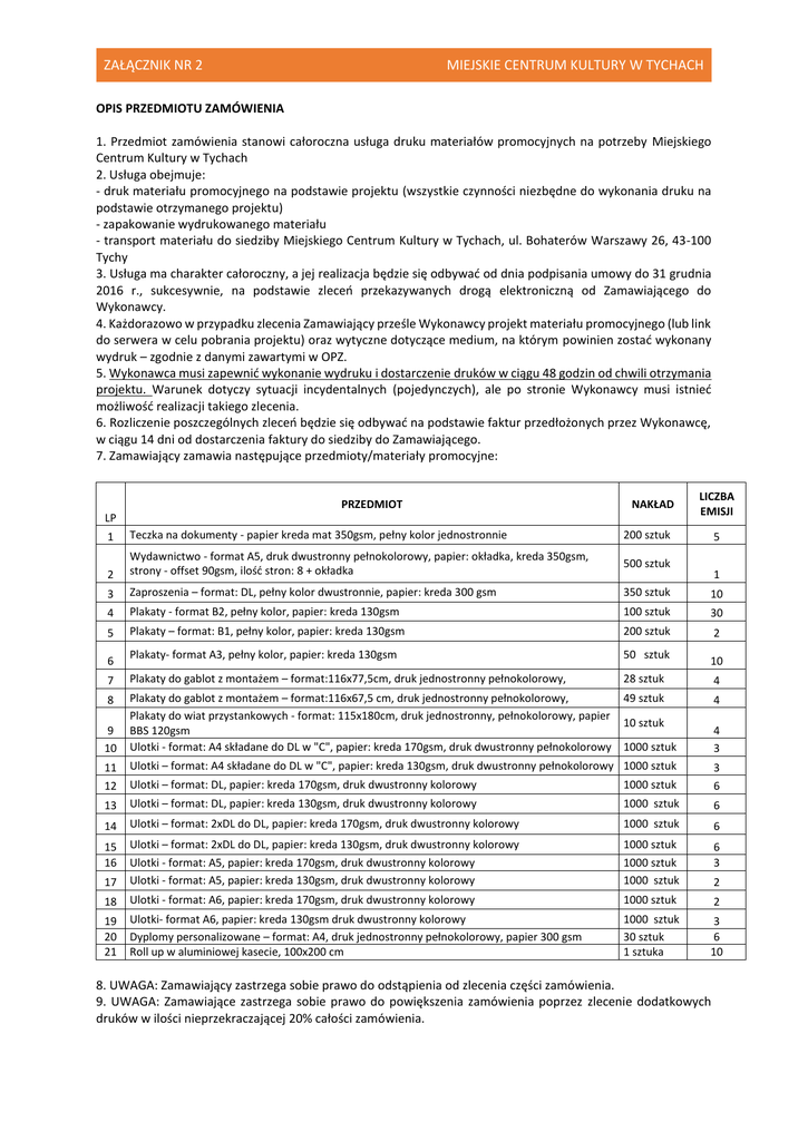 ZAŁĄCZNIK NR 2 MIEJSKIE CENTRUM KULTURY W TYCHACH OPIS PRZEDMIOTU ZAMÓWIENIA 1. Przedmiot zamówienia stanowi całoroczna usługa druku materiałów promocyjnych na potrzeby Miejskiego Centrum Kultury w Tychach 2. Usługa obejmuje: - druk materiału promocyjnego na podstawie projektu (wszystkie czynności niezbędne do wykonania druku na podstawie otrzymanego projektu) - zapakowanie wydrukowanego materiału - transport materiału do siedziby Miejskiego Centrum Kultury w Tychach, ul. Bohaterów Warszawy 26, 43-100 Tychy 3. Usługa ma charakter całoroczny, a jej realizacja będzie się odbywać od dnia podpisania umowy do 31 grudnia 2016 r., sukcesywnie, na podstawie zleceń przekazywanych drogą elektroniczną od Zamawiającego do Wykonawcy. 4. Każdorazowo w przypadku zlecenia Zamawiający prześle Wykonawcy projekt materiału promocyjnego (lub link do serwera w celu pobrania projektu) oraz wytyczne dotyczące medium, na którym powinien zostać wykonany wydruk – zgodnie z danymi zawartymi w OPZ. 5. Wykonawca musi zapewnić wykonanie wydruku i dostarczenie druków w ciągu 48 godzin od chwili otrzymania projektu. Warunek dotyczy sytuacji incydentalnych (pojedynczych), ale po stronie Wykonawcy musi istnieć możliwość realizacji takiego zlecenia. 6. Rozliczenie poszczególnych zleceń będzie się odbywać na podstawie faktur przedłożonych przez Wykonawcę, w ciągu 14 dni od dostarczenia faktury do siedziby do Zamawiającego. 7. Zamawiający zamawia następujące przedmioty/materiały promocyjne: PRZEDMIOT NAKŁAD LP LICZBA EMISJI 1 Teczka na dokumenty - papier kreda mat 350gsm, pełny kolor jednostronnie 200 sztuk 2 Wydawnictwo - format A5, druk dwustronny pełnokolorowy, papier: okładka, kreda 350gsm, strony - offset 90gsm, ilość stron: 8 + okładka 500 sztuk 3 Zaproszenia – format: DL, pełny kolor dwustronnie, papier: kreda 300 gsm 350 sztuk 10 4 Plakaty - format B2, pełny kolor, papier: kreda 130gsm 100 sztuk 30 5 Plakaty – format: B1, pełny kolor, papier: kreda 130gsm 200 sztuk 2 Plakaty- format A3, pełny kolor, papier: kreda 130gsm 50 sztuk 7 Plakaty do gablot z montażem – format:116x77,5cm, druk jednostronny pełnokolorowy, 28 sztuk 8 4 9 10 Plakaty do gablot z montażem – format:116x67,5 cm, druk jednostronny pełnokolorowy, 49 sztuk Plakaty do wiat przystankowych - format: 115x180cm, druk jednostronny, pełnokolorowy, papier 10 sztuk BBS 120gsm Ulotki - format: A4 składane do DL w "C", papier: kreda 170gsm, druk dwustronny pełnokolorowy 1000 sztuk 11 Ulotki – format: A4 składane do DL w "C", papier: kreda 130gsm, druk dwustronny pełnokolorowy 1000 sztuk 3 12 Ulotki – format: DL, papier: kreda 170gsm, druk dwustronny kolorowy 1000 sztuk 6 13 Ulotki – format: DL, papier: kreda 130gsm, druk dwustronny kolorowy 1000 sztuk 6 14 Ulotki – format: 2xDL do DL, papier: kreda 170gsm, druk dwustronny kolorowy 1000 sztuk 6 15 16 1000 sztuk 1000 sztuk 1000 sztuk 6 3 17 Ulotki – format: 2xDL do DL, papier: kreda 130gsm, druk dwustronny kolorowy Ulotki - format: A5, papier: kreda 170gsm, druk dwustronny kolorowy Ulotki - format: A5, papier: kreda 130gsm, druk dwustronny kolorowy 18 Ulotki - format: A6, papier: kreda 170gsm, druk dwustronny kolorowy 1000 sztuk 2 19 20 21 Ulotki- format A6, papier: kreda 130gsm druk dwustronny kolorowy Dyplomy personalizowane – format: A4, druk jednostronny pełnokolorowy, papier 300 gsm Roll up w aluminiowej kasecie, 100x200 cm 1000 sztuk 30 sztuk 1 sztuka 3 6 10 6 5 1 10 4 4 3 2 8. UWAGA: Zamawiający zastrzega sobie prawo do odstąpienia od zlecenia części zamówienia. 9. UWAGA: Zamawiające zastrzega sobie prawo do powiększenia zamówienia poprzez zlecenie dodatkowych druków w ilości nieprzekraczającej 20% całości zamówienia.