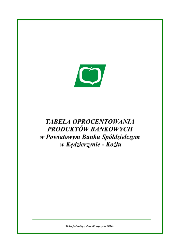 TABELA OPROCENTOWANIA PRODUKTÓW BANKOWYCH w Powiatowym Banku Spółdzielczym w Kędzierzynie - Koźlu ROZDZIAŁ I Tekst jednolity z dnia 05 stycznia 2016r. SPIS TREŚCI: Rozdział Wyszczególnienie Rozdział I Oprocentowanie depozytów dla osób fizycznych, podmiotów gospodarczych, jednostek samorządu terytorialnego, fundacji, organizacji i stowarzyszeń w walucie PLN 3 Rozdział II Efektywne konto oszczędnościowe w złotych dla osób fizycznych 4 Rozdział III Oprocentowanie depozytów dla osób fizycznych, podmiotów gospodarczych, jednostek samorządu terytorialnego, fundacji, organizacji i stowarzyszeń w walucie PLN zakładanych za pośrednictwem usługi eBankNet, eCorpoNet 4 Rozdział IV Oprocentowanie depozytów dla osób fizycznych, podmiotów gospodarczych, jednostek samorządu terytorialnego, fundacji, organizacji i stowarzyszeń w walutach wymienialnych EUR i USD 5 Rozdział V Oprocentowanie depozytów dla osób fizycznych, podmiotów gospodarczych, jednostek samorządu terytorialnego, fundacji, organizacji i stowarzyszeń w walutach PLN, EUR i USD podjętych przed upływem terminu umownego 6 Rozdział VI Oprocentowanie kredytów dla osób fizycznych 6 Rozdział VII Oprocentowanie kredytów komercyjnych dla podmiotów gospodarczych, rolników indywidualnych, jednostek samorządu terytorialnego, wspólnot mieszkaniowych 8 Rozdział VIII Oprocentowanie zadłużenia przeterminowanego 9 Rozdział IX Oprocentowanie kart kredytowych VISA 9 Rozdział X Postanowienia końcowe 10 Str. 2 ROZDZIAŁ I Oprocentowanie depozytów dla osób fizycznych, podmiotów gospodarczych, jednostek samorządu terytorialnego, fundacji, organizacji i stowarzyszeń w walucie PLN w Powiatowym Banku Spółdzielczym w Kędzierzynie-Koźlu Oprocentowanie w stosunku rocznym, zmienne RACHUNKI Rachunek oszczędnościowo – rozliczeniowy (w tym: rachunek ROR dla Studentów, rachunek ROR dla Seniorów) nieoprocentowany Rachunek a’vista dla osób fizycznych będących członkami rady rodziców lub innych jednostek organizacyjnych nie posiadających osobowości prawnej, którym odrębne ustawy nie przyznają zdolności prawnej nieoprocentowany Rachunek wkładów oszczędnościowych płatnych na każde żądanie potwierdzonych książeczką oszczędnościową dla osób fizycznych szkolnych kas oszczędnościowych oraz kas zapomogowo – pożyczkowych (rachunek a’vista) 0,00 % Rachunek bieżący i pomocniczy dla osób prawnych, jednostek organizacyjnych nie posiadających osobowości prawnej, o ile posiadają zdolność prawną oraz dla osób fizycznych prowadzących działalność gospodarczą na własny rachunek oraz wspólników spółki cywilnej w zakresie wykonywanej przez nich działalności gospodarczej, zwanych przedsiębiorcami 0,00 % LOKATY TERMINOWE W PLN 1 miesięczna 3 miesięczna 6 miesięczna 12 miesięczna Oprocentowanie w stosunku rocznym, zmienne do 49.999 0,10% od 50.000 0,15% do 49.999 0,25% od 50.000 0,50% do 49.999 0,75% od 50.000 1,00% do 49.999 1,25% od 50.000 1,50% 24 miesięczna 1,75% 36 miesięczna 1,75% 3 0,90% Lokata „Siódemka” st. red. weksli – marża w wys. 0,85% (marża - stała w okresie 7 m-cy) - okres lokowania 7 miesięcy Lokata promocyjna „AGRO” 1,25% - okres lokowania 3 miesiące saldo na rachunku „Efektywna” lokata terminowa do kwoty 49.999,00 zł - okres lokowania 12 miesięcy od kwoty 50.000,00 zł Oprocentowanie w stosunku rocznym 0,10% 0,75% do kwoty 99.999,00 zł powyżej 100.000,00 zł Indywidualne Konto Emerytalne IKE 0,90% 1,70% ROZDZIAŁ II Efektywne konto oszczędnościowe w złotych dla osób fizycznych z= stopa redyskontowa weksli saldo na rachunku do kwoty 49.999,00 zł od kwoty 50.000,00 zł do kwoty 99.999,00 zł 1,75% powyżej 100.000,00 zł m = marża Banku oprocentowanie x = z-m 1,65 0,10% 1,00 0,75% 0,85 0,90% ROZDZIAŁ III Oprocentowanie depozytów dla osób fizycznych, podmiotów gospodarczych, jednostek samorządu terytorialnego, fundacji, organizacji i stowarzyszeń w walucie PLN zakładanych za pośrednictwem usługi eBankNet, eCorpoNet w Powiatowym Banku Spółdzielczym w Kędzierzynie-Koźlu LOKATY TERMINOWE W PLN Oprocentowanie w stosunku rocznym, zmienne 1 miesięczna 0,25% 3 miesięczna 0,60% 6 miesięczna 1,10% 12 miesięczna 1,60% 4 ROZDZIAŁ IV Oprocentowanie depozytów dla osób fizycznych, podmiotów gospodarczych, jednostek samorządu terytorialnego, fundacji, organizacji i stowarzyszeń w walutach wymienialnych EUR i USD w Powiatowym Banku Spółdzielczym w Kędzierzynie-Koźlu RACHUNKI W WALUTACH WYMIENIALNYCH EUR i USD Rachunek oszczędnościowo – rozliczeniowy w walucie wymienialnej EUR Rachunek oszczędnościowo – rozliczeniowy w walucie wymienialnej USD Oprocentowanie w stosunku rocznym, zmienne nieoprocentowany nieoprocentowany Rachunek bieżący i pomocniczy dla osób prawnych, jednostek organizacyjnych nie posiadających osobowości prawnej, o ile posiadają zdolność prawną oraz dla osób fizycznych prowadzących działalność gospodarczą na własny rachunek oraz wspólników spółki cywilnej w zakresie wykonywanej przez nich działalności gospodarczej, zwanych przedsiębiorcami w walucie wymienialnej EUR 0,00 % Rachunek bieżący i pomocniczy dla osób prawnych, jednostek organizacyjnych nie posiadających osobowości prawnej, o ile posiadają zdolność prawną oraz dla osób fizycznych prowadzących działalność gospodarczą na własny rachunek oraz wspólników spółki cywilnej w zakresie wykonywanej przez nich działalności gospodarczej, zwanych przedsiębiorcami w walucie wymienialnej USD 0,00 % LOKATY TERMINOWE W WALUTACH WYMIENIALNYCH EUR i USD Oprocentowanie w stosunku rocznym, zmienne EUR USD 1 miesięczna 0,05% 0,10% 3 miesięczna 0,07% 0,15% 6 miesięczna 0,10% 0,20% 12 miesięczna 0,25% 0,25% 5 ROZDZIAŁ V Oprocentowanie depozytów dla osób fizycznych, podmiotów gospodarczych, jednostek samorządu terytorialnego, fundacji, organizacji i stowarzyszeń w walutach PLN, EUR i USD w Powia