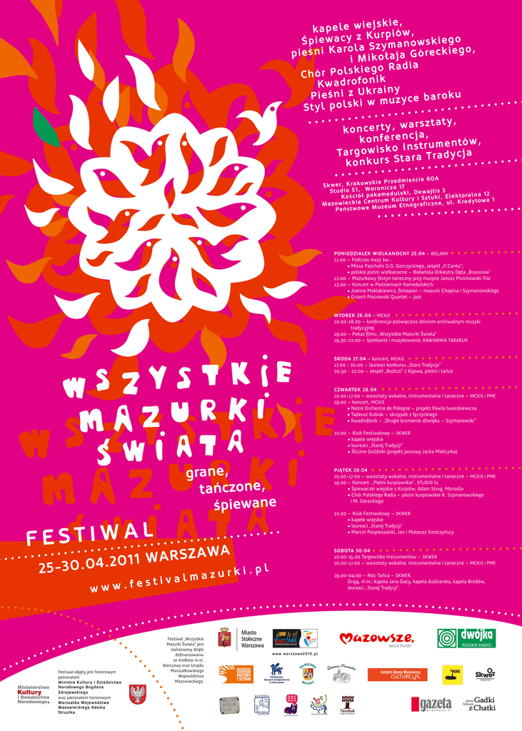 e, i k s j e i w e l ka p e , w ó i p r u K Śpiewacy z zymanowskiego S a l o , r o a g K e i i k c e r ó pieśn G i Mikołaja ia d a R o g e i k Chór Pol s k i n o f o r d a Kw y n i a r k U z i ku o Pieśn r a b e c y z u m w i k s l o p St yl y, t a t z s r a w , koncer t y a, j c n e r e f n o k , w ó t n e m u r st n I o k s i w o a Ta r g j c y d a r T a ar t S s r u k n o k d m ie ś c ie 6 0 A e z r P ie k s w o k S k w e r, K ra n ic z a 17 S tu d io S 1, W o ro e d u ls k i, D e w a jt is 3 12 K o ś c ió ł p o k a m k i, E le k to ra ln a tu z S i y r u lt u K n tr u m d y to w a 1 M a z o w ie c k ie C e u z e u m E tn o g ra fi c z n e , u l. K re P a ń s tw o w e M PONIEDZIAŁEK WIELKANOCNY 25.04 – BIELANY 11.00 – Podczas mszy św.: • Missa Paschalis G.G. Gorczyckiego, zespół „Il Canto”; • polskie pieśni wielkanocne – Bielańska Orkiestra Dęta „Brassovia” 12.00 – Mazurkowy festyn taneczny przy muzyce Janusz Prusinowski Trio 13.00 – Koncert w Podziemiach Kamedulskich: • Joanna Maklakiewicz, fortepian – mazurki Chopina i Szymanowskiego • Grzech Piotrowski Quartet – jazz WTOREK 26.04 – MCKiS 10.00-18.00 – konferencja poświęcona zbiorom archiwalnym muzyki tradycyjnej 19.00 – Pokaz filmu „Wszystkie Mazurki Świata” 19.30-22.00 – Spotkanie i muzykowanie, KAWIARNIA TARABUK ŚRODA 27.04 – koncert, MCKiS 17.00 - 20.00 – laureaci konkursu „Stara Tradycja” 20.30 - 22.00 – zespół „Bożiczi” z Kijowa, pieśni i tańce CZWARTEK 28.04 10.00-17.00 – warsztaty wokalne, instrumentalne i taneczne – MCKiS i PME 19.00 – koncert, MCKiS • Notre Orchestre de Pologne – projekt Pawła Iwaszkiewicza • Tadeusz Kubiak – skrzypek z łęczyckiego • Kwadrofonik – „Drugie brzmienie dźwięku – Szymanowski” 22.00 – Klub Festiwalowy – SKWER • kapele wiejskie • laureaci „Starej Tradycji” • Śliczne Goździki (projekt jazzowy Jacka Mielcarka) grane, tańczone, śpiewane L A W I FEST 25-3 1 1 0 2 . 4 0.0 A W A Z S WAR iv t s e f . www Festiwal objęty jest honorowym patronatem Ministra Kultur y i Dziedzictwa Narodowego Bogdana Zdrojewskiego oraz patronatem honorowym Marszałka Województwa Mazowieckiego Adama Struzika. p . i k r u almaz Festiwal „Wszystkie Mazurki Świata” jest realizowany dzięki dofinansowaniu ze środków m.st. Warszawy oraz Urzędu Marszałkowskiego Województwa Mazowieckiego. PIĄTEK 29.04 10.00-17.00 – warsztaty wokalne, instrumentalne i taneczne – MCKiS i PME 19.00 – Koncert: „Pieśni kurpiowskie”, STUDIO S1 • Śpiewaczki wiejskie z Kurpiów, Adam Strug, Monodia • Chór Polskiego Radia – pieśni kurpiowskie K. Szymanowskiego i M. Góreckiego 22.00 – Klub Festiwalowy – SKWER • kapele wiejskie • laureaci „Starej Tradycji” • Marcin Pospieszalski, Jan i Mateusz Smoczyńscy SOBOTA 30.04 10.00-15.00 Targowisko Instrumentów – SKWER 10.00-17.00 – warsztaty wokalne, instrumentalne i taneczne – MCKiS i PME l 19.00-04.00 – Noc Tańca – SKWER. Grają, m.in.: kapela Jana Gacy, kapela dudziarska, kapela Brodów, laureaci „Starej Tradycji”. w w w.war szawa2016.pl