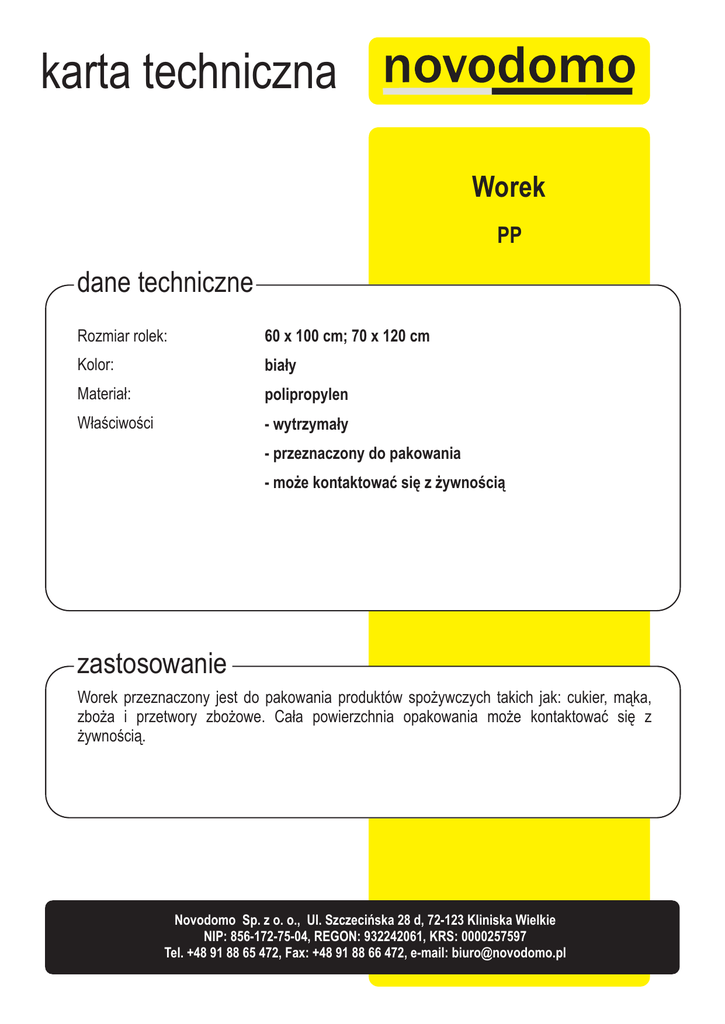karta techniczna Worek PP dane techniczne Rozmiar rolek: 60 x 100 cm; 70 x 120 cm Kolor: bia³y Materia³: polipropylen W³aœciwoœci - wytrzyma³y - przeznaczony do pakowania - mo¿e kontaktowaæ siê z ¿ywnoœci¹ zastosowanie Worek przeznaczony jest do pakowania produktów spoýywczych takich jak: cukier, màka, zboýa i przetwory zboýowe. Caùa powierzchnia opakowania moýe kontaktowaã siæ z ýywnoúcià. Novodomo Sp. z o. o., Ul. Szczeciñska 28 d, 72-123 Kliniska Wielkie NIP: 856-172-75-04, REGON: 932242061, KRS: 0000257597 Tel. +48 91 88 65 472, Fax: +48 91 88 66 472, e-mail: [email protected]
