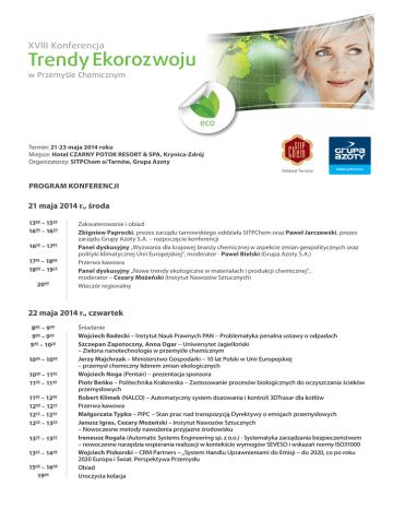 XVIII Konferencja Trendy Ekorozwoju w Przemyśle Chemicznym Termin: 21-23 maja 2014 roku Miejsce: Hotel CZARNY POTOK RESORT & SPA, Krynica-Zdrój Organizatorzy: SITPChem o/Tarnów, Grupa Azoty PROGRAM KONFERENCJI 21 maja 2014 r., środa 1300 – 1545 1600 – 1620 1620 – 1745 1745 – 1800 1800 – 1915 2000 Zakwaterowanie i obiad Zbigniew Paprocki, prezes zarządu tarnowskiego oddziału SITPChem oraz Paweł Jarczewski, prezes zarządu Grupy Azoty S.A. – rozpoczęcie konferencji Panel dyskusyjny „Wyzwania dla krajowej branży chemicznej w aspekcie zmian geopolitycznych oraz polityki klimatycznej Unii Europejskiej”, moderator - Pawel Bielski (Grupa Azoty S.A.) Przerwa kawowa Panel dyskusyjny „Nowe trendy ekologiczne w materiałach i produkcji chemicznej”, . moderator – Cezary Możeński (Instytut Nawozów Sztucznych) Wieczór regionalny 22 maja 2014 r., czwartek 800 – 900 900 – 940 940 – 1020 1020 – 1050 1050 – 1105 1105 – 1140 1140 – 1200 1200 – 1215 1215 – 1255 1255 – 1335 1335 – 1355 1355 – 1440 1500 – 1600 1900 Śniadanie Wojciech Radecki – Instytut Nauk Prawnych PAN – Problematyka penalna ustawy o odpadach Szczepan Zapotoczny, Anna Ogar – Uniwersytet Jagielloński – Zielona nanotechnologia w przemyśle chemicznym Jerzy Majchrzak – Ministerstwo Gospodarki – 10 lat Polski w Unii Europejskiej – przemysł chemiczny liderem zmian ekologicznych Wojciech Noga (Pentair) – prezentacja sponsora Piotr Beńko – Politechnika Krakowska – Zastosowanie procesów biologicznych do oczyszczania ścieków przemysłowych Robert Klimek (NALCO) – Automatyczny system dozowania i kontroli 3DTrasar dla kotłów Przerwa kawowa Małgorzata Typko – PIPC – Stan prac nad transpozycją Dyrektywy o emisjach przemysłowych Janusz Igras, Cezary Możeński – Instytut Nawozów Sztucznych – Nowoczesne metody nawożenia przyjazne środowisku Ireneusz Rogala (Automatic Systems Engineering sp. z o.o.) - Systematyka zarządzania bezpieczeństwem – nowoczesne narzędzia wspierania realizacji w kontekście wymogów SEVESO i wskazań normy ISO31000 Wojciech Piskorski – CRM Partners – „System Handlu Uprawnieniami do Emisji – do 2020, co po roku 2020 Europa i Świat. Perspektywa Przemysłu Obiad Uroczysta kolacja XVIII Konferencja Trendy Ekorozwoju w Przemyśle Chemicznym 23 maja 2014 r., piątek 730 – 900 Śniadanie 900 – 940 Jacek Kijeński, Marta Kijeńska – Zarząd Główny SITPChem – Wpływ życia po życiu wyrobów z tworzyw polimerowych na projektowanie nowych materiałów 940 – 1000 Mariusz Kalisz, Janusz Krupanek – IETU – Nowatorskie techniki screeningowe, służące do zoptymalizowanego kosztowo rozpoznania stanu środowiska wodno-gruntowego na dużych obszarach przemysłowych 1000 – 1030 Jerzy Paprocki – Zarząd Główny SITPChem – Gospodarka, chemia i środowisko w statystyce 1030 – 1045 AVK – Prezentacja sponsora 1045 – 1100 Przerwa kawowa 1100 – 1120 Danuta Ciechańska, Krystyna Twarowska Schmidt, Małgorzata Michniewicz, Agnieszka Gutowska, Konrad Sulak – Instytut Biopolimerów i Włókien Chemicznych – Implementacja i komercjalizacja ekologicznych materiałów polimerowych w aspekcie działań międzysektorowych 1120 – 1200 Magdalena Trybuch, Tomasz Galoch – ENVIRON Poland – Perspektywa zmian przepisów dotyczących zanieczyszczeń ziemi i wód podziemnych. Wdrożenie dyrektywy o emisjach przemysłowych i inne planowane zmiany w obowiązujących przepisach 1200 – 1230 Andrzej Biskupski, Mieczysław Borowik – Politechnika Wrocławska – Proekologiczne rozwiązania w technologii wytwarzania i stosowania nawozów 1230 – 1240 prezentacja sponsora 1240 – 1250 Zbigniew Paprocki – SITPChem O/Tarnów – Podsumowanie i zakończenie konferencji 1250 Obiad