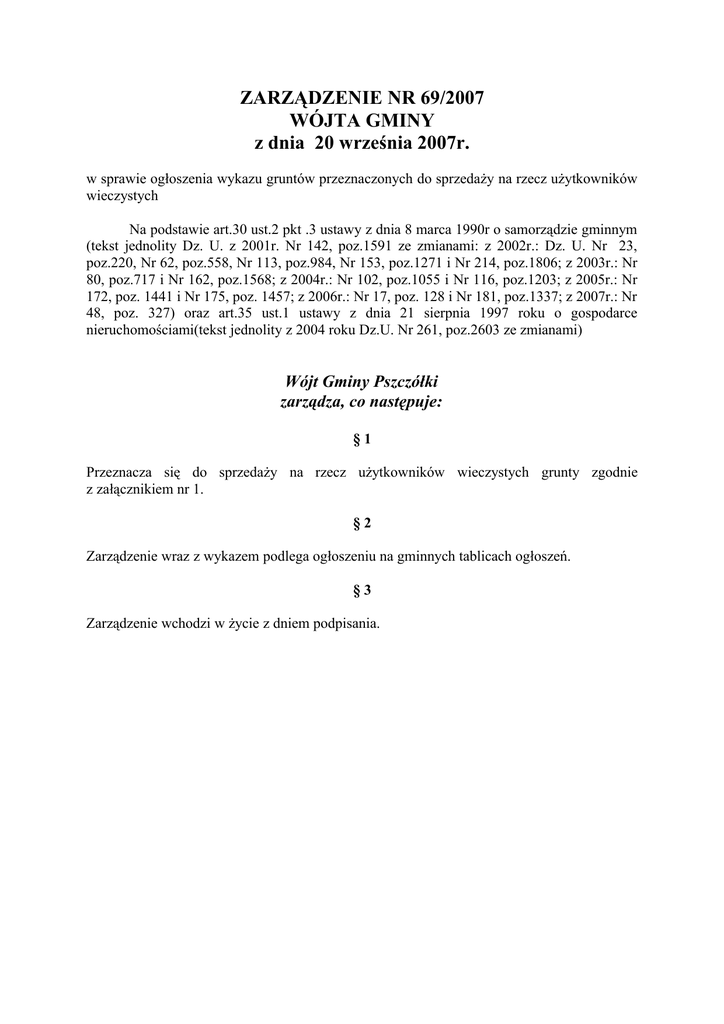 ZARZĄDZENIE NR 69/2007 WÓJTA GMINY z dnia 20 września 2007r. w sprawie ogłoszenia wykazu gruntów przeznaczonych do sprzedaży na rzecz użytkowników wieczystych Na podstawie art.30 ust.2 pkt .3 ustawy z dnia 8 marca 1990r o samorządzie gminnym (tekst jednolity Dz. U. z 2001r. Nr 142, poz.1591 ze zmianami: z 2002r.: Dz. U. Nr 23, poz.220, Nr 62, poz.558, Nr 113, poz.984, Nr 153, poz.1271 i Nr 214, poz.1806; z 2003r.: Nr 80, poz.717 i Nr 162, poz.1568; z 2004r.: Nr 102, poz.1055 i Nr 116, poz.1203; z 2005r.: Nr 172, poz. 1441 i Nr 175, poz. 1457; z 2006r.: Nr 17, poz. 128 i Nr 181, poz.1337; z 2007r.: Nr 48, poz. 327) oraz art.35 ust.1 ustawy z dnia 21 sierpnia 1997 roku o gospodarce nieruchomościami(tekst jednolity z 2004 roku Dz.U. Nr 261, poz.2603 ze zmianami) Wójt Gminy Pszczółki zarządza, co następuje: §1 Przeznacza się do sprzedaży na rzecz użytkowników wieczystych grunty zgodnie z załącznikiem nr 1. §2 Zarządzenie wraz z wykazem podlega ogłoszeniu na gminnych tablicach ogłoszeń. §3 Zarządzenie wchodzi w życie z dniem podpisania. Załącznik do Zarządzenia Nr 69/2007 Wójta Gminy Pszczółki z dnia 20 września 2007r. Oznaczenie nieruchomości według księgi wieczystej oraz katastru nieruchomości Numer nieruchomości Powierzchnia w ha Położenie nieruchomości 109475 107 i 108 0,08 Kolnik Nazwisko użytkownika wieczystego Elżbieta i Józef Szlia Przeznaczenie nieruchomości i sposób jej zagospodarowania Cena nieruchomości w zł brak planu 12.821,66