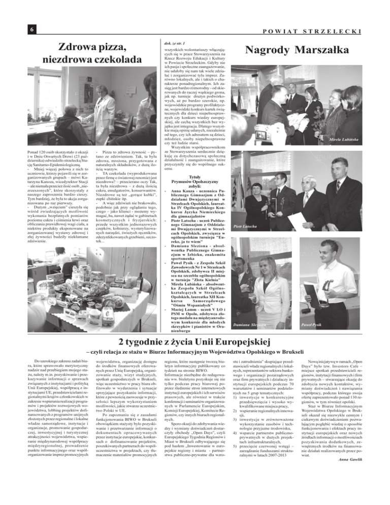 6 POWIAT STR Z E LE C K I Zdrowa pizza, niezdrowa czekolada Ponad 120 osób skorzysta³o z okazji i w Dniu Otwartych Drzwi (23 padziernika) odwiedzi³o strzeleck¹ Stacjê Sanitarno-Epidemiologiczn¹. - Mniej wiêcej po³owa z nich to uczniowie, którzy pojawili siê w zorganizowanych grupach mówi Katarzyna Kanoza, wicedyrektor Stacji ale niema³a przecie¿ iloæ osób niezrzeszonych, które skorzysta³y z naszego zaproszenia bardzo cieszy. Tym bardziej, ¿e by³a to akcja zorganizowana po raz pierwszy. - Du¿ym wziêciem cieszy³a siê wród zwiedzaj¹cych mo¿liwoæ wykonania bezp³atnych pomiarów poziomu cukru i cinienia krwi oraz obliczania prawid³owej wagi cia³a, a niektóre produkty eksponowane na zorganizowanej wystawy zdrowej i z³ej ¿ywnoci budzi³y niek³amane zdziwienie. - Pizza to zdrowa ¿ywnoæ pytano ze zdziwieniem. Tak, ta by³a zdrowa, mro¿ona, przygotowana z naturalnych sk³adników, z du¿¹ iloci¹ warzyw. - TA czekolada (wyprodukowana przez firmê o wiatowej renomie) jest niezdrowa? przecierano oczy Tak, ta by³a niezdrowa z du¿¹ iloci¹ cukru, emulgatorów, konserwantów. Niezdrowe s¹ te¿ gor¹ce kubki, zupki chiñskie itp. - A wiêc zdziwieñ nie brakowa³o, podobnie jak przy ogl¹daniu tego, czego jako klienci - mo¿emy wymagaæ, ba, nawet ¿¹daæ w gabinetach kosmetycznych i fryzjerskich: przede wszystkim jednorazowych czepków, ko³nierzy, wysterylizowanych narzêdzi, wie¿ych rêczników, zdezynfekowanych grzebieni, szczotek... - dok. ze str. 1 wszystkich wolontariuszy w³¹czaj¹cych siê w prace Stowarzyszenia na Rzecz Rozwoju Edukacji i Kultury w Powiecie Strzeleckim. Gdyby nie ich pasja i spo³eczne zaanga¿owanie, nie uda³oby siê nam tak wiele zdzia³aæ i zorganizowaæ tylu imprez. Zarówno lokalnych, ale i takich o charakterze ponadregionalnym. Ich zasiêg jest bardzo ró¿norodny - od skierowanych do raczej w¹skiego grona, jak np. turnieje dru¿yn podwórkowych, a¿ po bardzo szerokie, np. wojewódzkie programy profilaktyczne, wojewódzki konkurs kartek wi¹tecznych dla dzieci niepe³nosprawnych czy konkurs wiedzy europejskiej, ale cech¹ wszystkich bez wyj¹tku jest integracja. Dlatego wszystkie maj¹ opiniê udanych, niezale¿nie od tego, czy ich adresatem s¹ dzieci, m³odzie¿, osoby niepe³nosprawne czy te¿ ludzie starsi. Wszystkim wspó³pracownikom ze Stowarzyszenia serdecznie dziêkujê za dotychczasow¹ spo³eczn¹ dzia³alnoæ i zaanga¿owanie, które przyczyni³y siê do wspólnego sukcesu. - - - - - - Nagrody Marsza³ka Mirela Lubiñska Tytu³y Prymusów Opolszczyzny zobyli: Anna Kauza - uczennica Publicznego Gimnazjum z Oddzia³ami Dwujêzycznymi w Strzelcach Opolskich, laureatka IV Ogólnopolskiego Konkursu Jêzyka Niemieckiego dla gimnazjalistów Piotr Latocha - uczeñ Publicznego Gimnazjum z Oddzia³ami Dwujêzycznymi w Strzelcach Opolskich, zwyciêzca w ogólnopolskim turnieju "Eureko, ja to wiem" Damiana Sleziona - absolwentka Publicznego Gimnazjum w Izbicku, znakomita sportsmenka Pawe³ Pysik - z Zespo³u Szkó³ Zawodowych Nr 1 w Strzelcach Opolskich, zdobywca II miejsca na szczeblu ogólnopolskim w turnieju "Z³ota Kielnia" Mirela Lubiñska - absolwentka Zespo³u Szkó³ Ogólnokszta³c¹cych w Strzelcach Opolskich, laureatka XII Konkursu Samorz¹dowego "Omiu Wspania³ych" Maciej Lamm - uczeñ V LO i PSM w Opolu, zdobywca z³otego medalu na miêdzyanrodowym konkursie dla m³odych skrzypków i pianistów w Oranienburgu Piotr Latocha Damiana Sleziona Pawe³ Pysik 2 tygodnie z ¿ycia Unii Europejskiej czyli relacja ze sta¿u w Biurze Informacyjnym Województwa Opolskiego w Brukseli Do szerokiego zakresu zadañ biura, które sprawowa³o merytoryczny nadzór nad przebiegiem mojego sta¿u, nale¿y m.in. pozyskiwanie i przekazywanie informacji o sprawach zwi¹zanych z instytucjami i polityk¹ Unii Europejskiej, wspó³prac¹ z instytucjami UE, przedstawicielami regionalnymi krajów cz³onkowskich w zakresie wspierania realizacji programów i projektów rozwojowych województwa, lobbing projektów dofinansowanych z programów unijnych z³o¿onych przez regionalne i lokalne w³adze samorz¹dowe, instytucje i organizacje, promowanie gospodarczej, inwestycyjnej i turystycznej atrakcyjnoci województwa, wspieranie miêdzynarodowej wspó³pracy miêdzyregionalnej, prowadzenie punktu informacyjnego oraz wspó³organizowanie imprez promocyjnych województwa, organizacjê dostêpu do rodków finansowych oferowanych przez Uniê Europejsk¹, organizowanie sta¿y, wizyt studyjnych, spotkañ gospodarczych w Brukseli, wiêc uczestnictwo w pracy biura obfitowa³o w wydarzenia i sytuacje sprzyjaj¹ce pozyskaniu informacji, które z pewnoci¹ zaowocuje w przysz³oci lepszym wykorzystaniem mo¿liwoci, jakie stwarza uczestnictwo Polski w UE. Po zapoznaniu siê z zasadami funkcjonowania BIWO w Brukseli obowi¹zkiem sta¿ysty by³o pozyskiwanie i przetwarzanie informacji o dokumentach opracowywanych przez instytucje europejskie, konkursach o dofinansowanie projektów, poszukiwanych partnerach do wspó³uczestnictwa w projektach, czy t³umaczenie materia³ów promocyjnych regionu, które nastêpnie tworz¹ biuletyn informacyjny publikowany co tydzieñ na stronie BIWO. Informacje niezbêdne do redagowania ww. biuletynu pozyskuje siê nie tylko podczas pracy biurowej poprzez ledzenie stron internetowych instytucji europejskich i ich serwisów prasowych, ale równie¿ w trakcie konferencji i seminariów organizowanych w Parlamencie Europejskim, Komisji Europejskiej, Komitecie Regionów, czy innych biurach regionalnych. Sporo okazji do zdobywania wiedzy i wymiany dowiadczeñ dostarczy³y obchody Open Days, czyli Europejskiego Tygodnia Regionów i Miast w Brukseli odbywaj¹cego siê pod has³em Inwestowanie w europejskie regiony i miasta - partnerstwa publiczno-prywatne dla wzro- stu i zatrudnienia skupiaj¹ce przedstawicieli w³adz regionalnych i lokalnych, reprezentantów sektora bankowego i organizacji pozarz¹dowych oraz firm prywatnych i dzia³ac