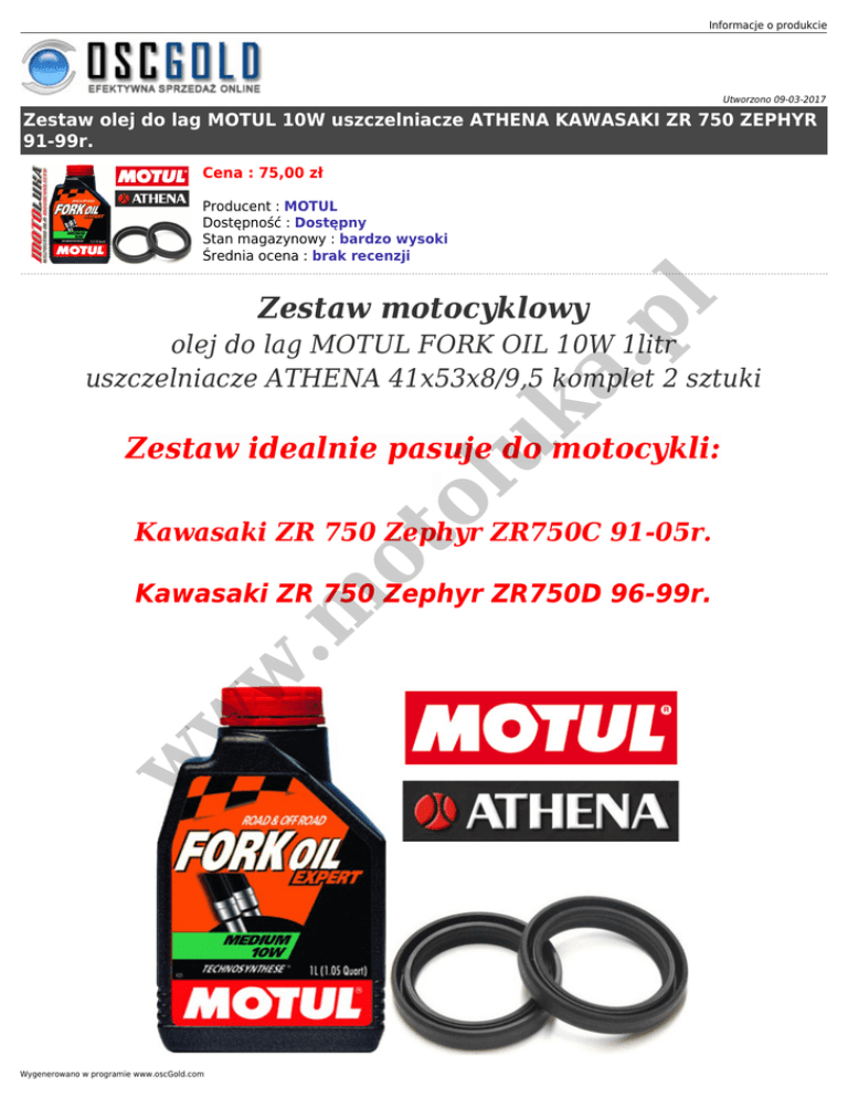 Informacje o produkcie Utworzono 09-03-2017 Zestaw olej do lag MOTUL 10W uszczelniacze ATHENA KAWASAKI ZR 750 ZEPHYR 91-99r. Cena : 75,00 zł Producent : MOTUL Dostępność : Dostępny Stan magazynowy : bardzo wysoki Średnia ocena : brak recenzji a. pl Zestaw motocyklowy uk olej do lag MOTUL FORK OIL 10W 1litr uszczelniacze ATHENA 41x53x8/9,5 komplet 2 sztuki ol Zestaw idealnie pasuje do motocykli: ot Kawasaki ZR 750 Zephyr ZR750C 91-05r. w w w .m Kawasaki ZR 750 Zephyr ZR750D 96-99r. Wygenerowano w programie www.oscGold.com w w w .m ot ol uk a. pl Jeśli potrzebujesz innej lepkości oleju: wybierz 5W, 15W lub 20W i zaznacz w informacji przy zakupie.